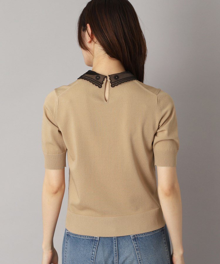 Это изделие изготовлено с использованием уникальной техники создания выкройки для трикотажа, а воротник из органзы идеально сбалансирован и трехмерно облегает шею.