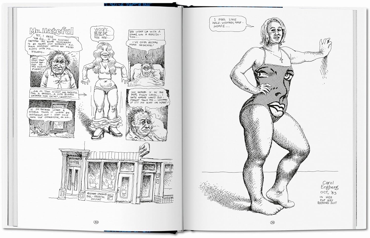 Чтобы доказать этот самобичующий анализ, он заполняет страницы своими фирменными извращениями (в сельской местности), едкими социальными комментариями, жестокими автопортретами, экспериментальным кубизмом… и несколькими прекрасными лесными пейзажами. Его мастерство владения пером Rapidograph здесь, в его сорокалетнем возрасте, достигает своего апогея; нам остается только пожалеть, что он не включил в книгу свой пророческий комикс о Дональде Трампе 1989 года.