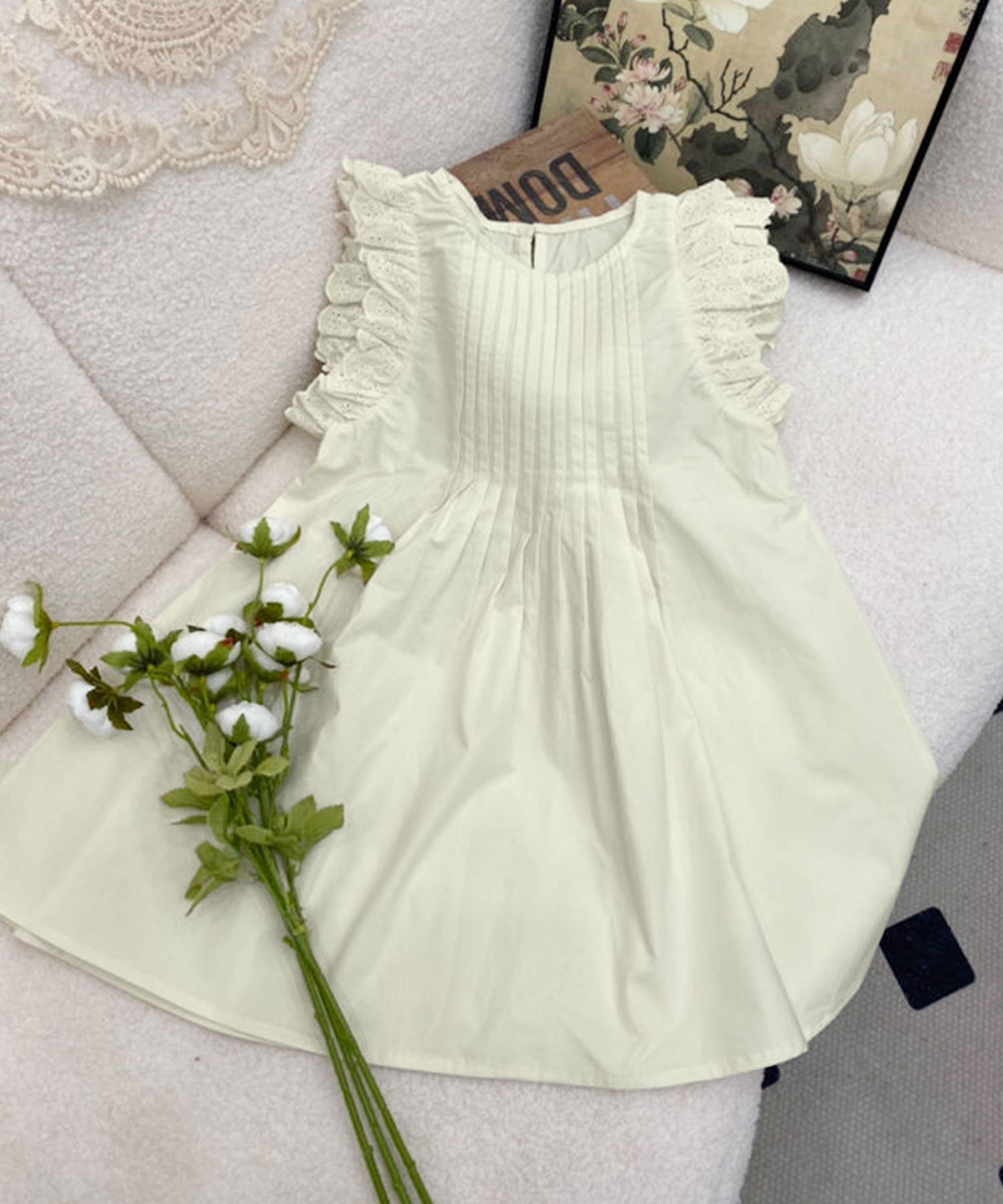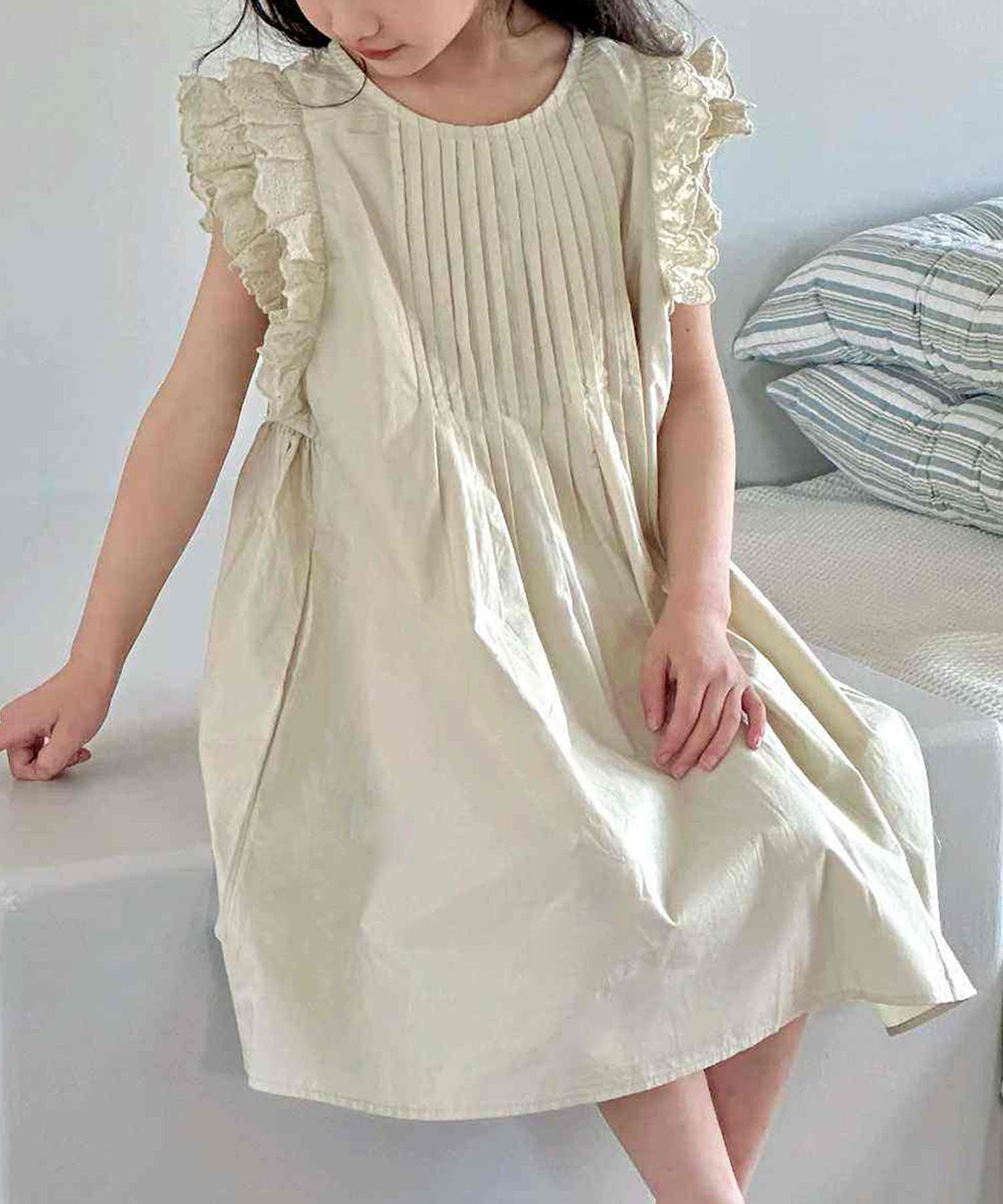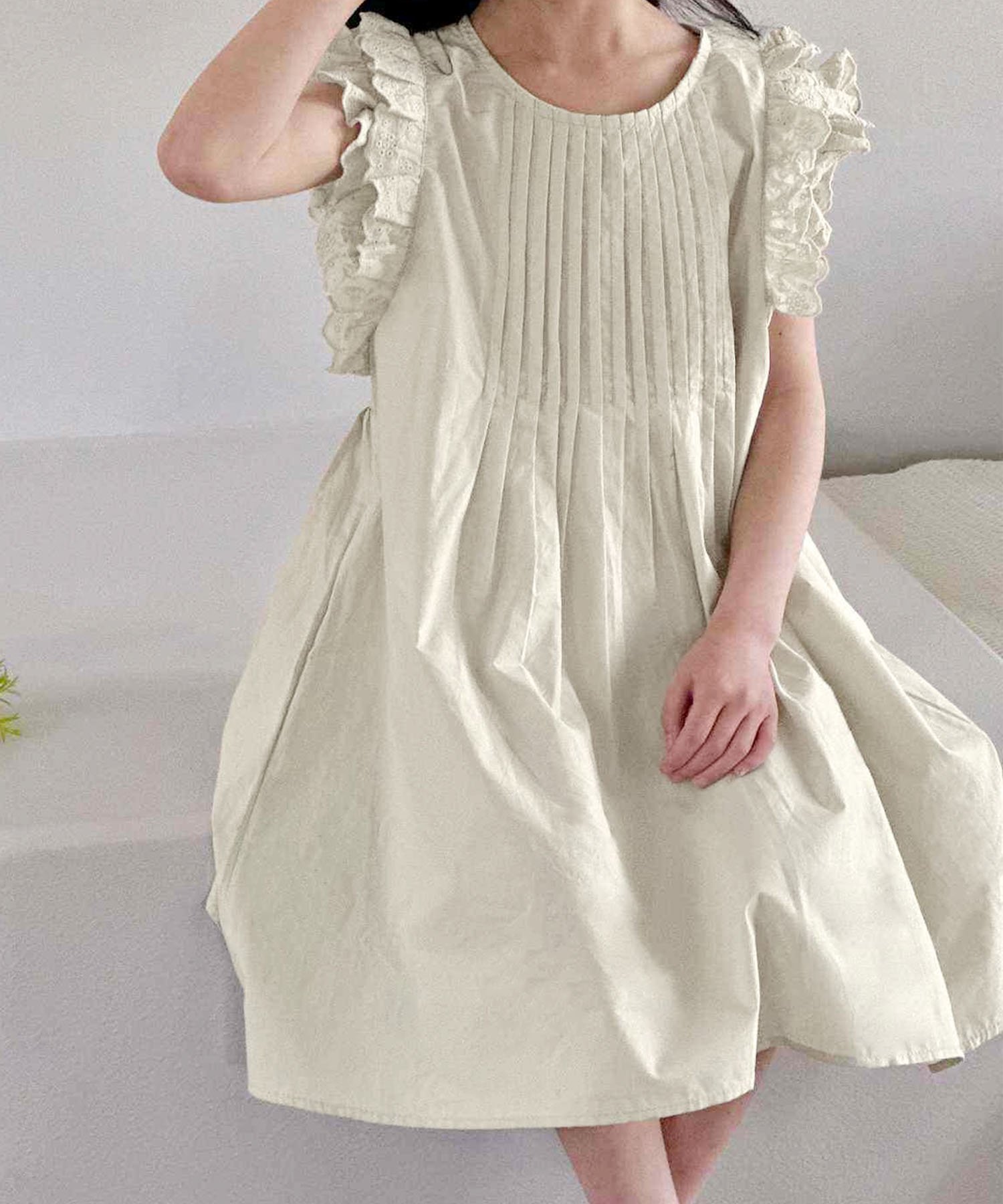 Оборки на плечах добавляют очарования, а естественный А-образный силуэт обеспечивает свободу движений.