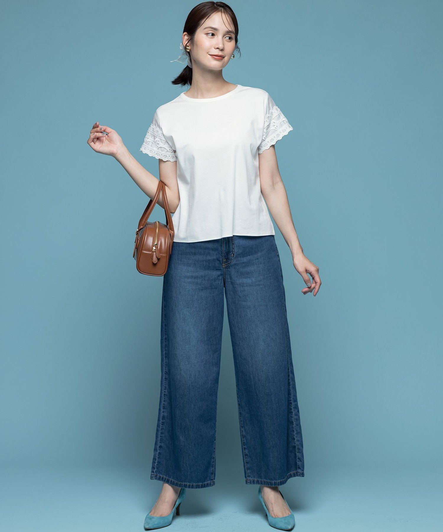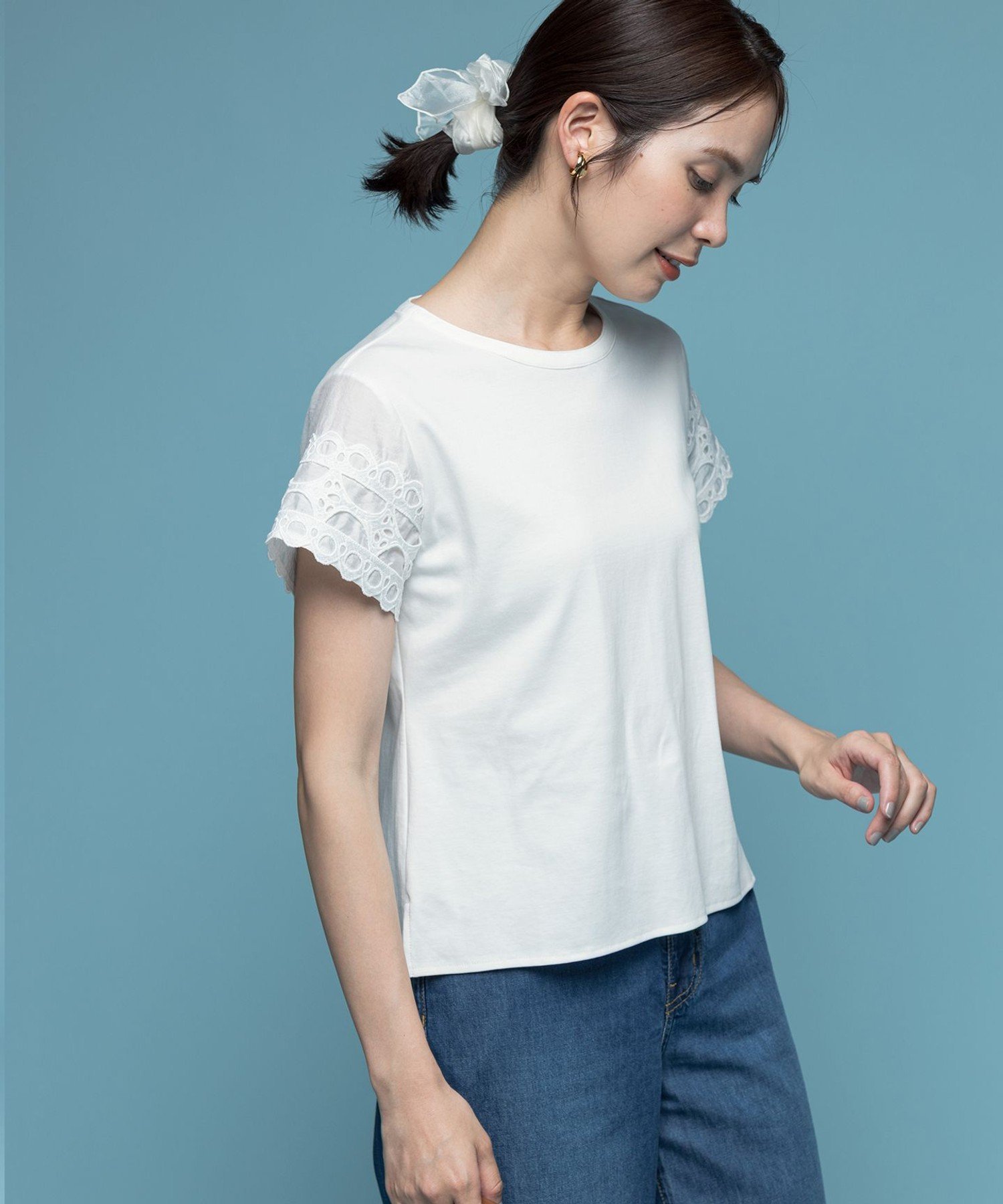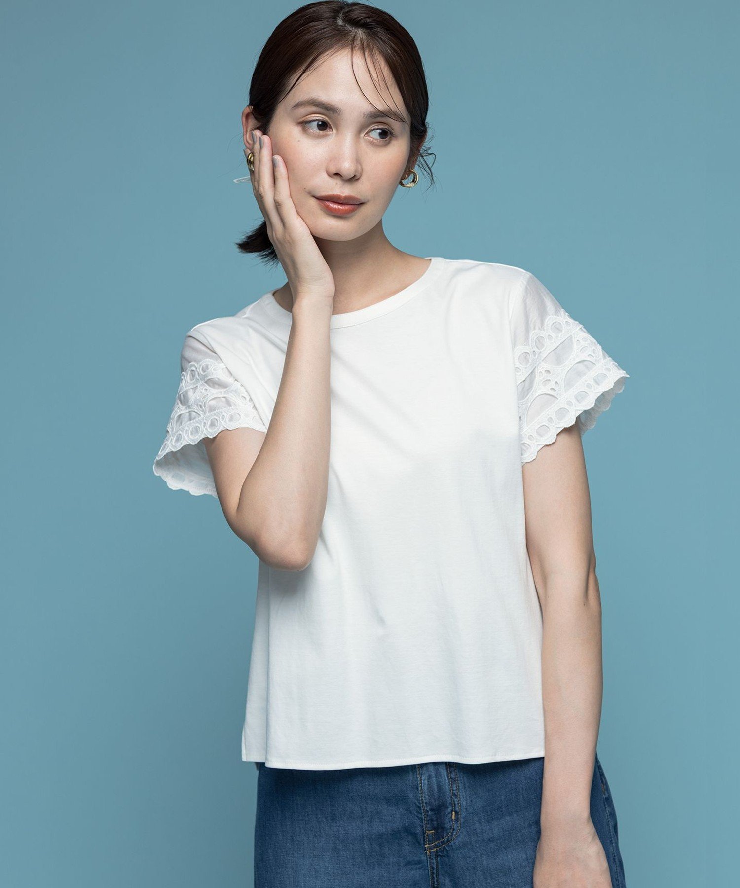 Дизайн: Эта, казалось бы, простая футболка с прозрачными рукавами и плотным геометрическим кружевом рекомендуется для ношения как отдельно, так и в сочетании с платьем-комбинацией или подтяжками. ・Фигура не слишком облегающая, а разрезы по бокам позволяют легко сочетать ее с любым низом. ・Застежка на кнопках сзади облегчает надевание и снимание, а декоративные пуговицы, похожие на жемчуг, являются изюминкой.