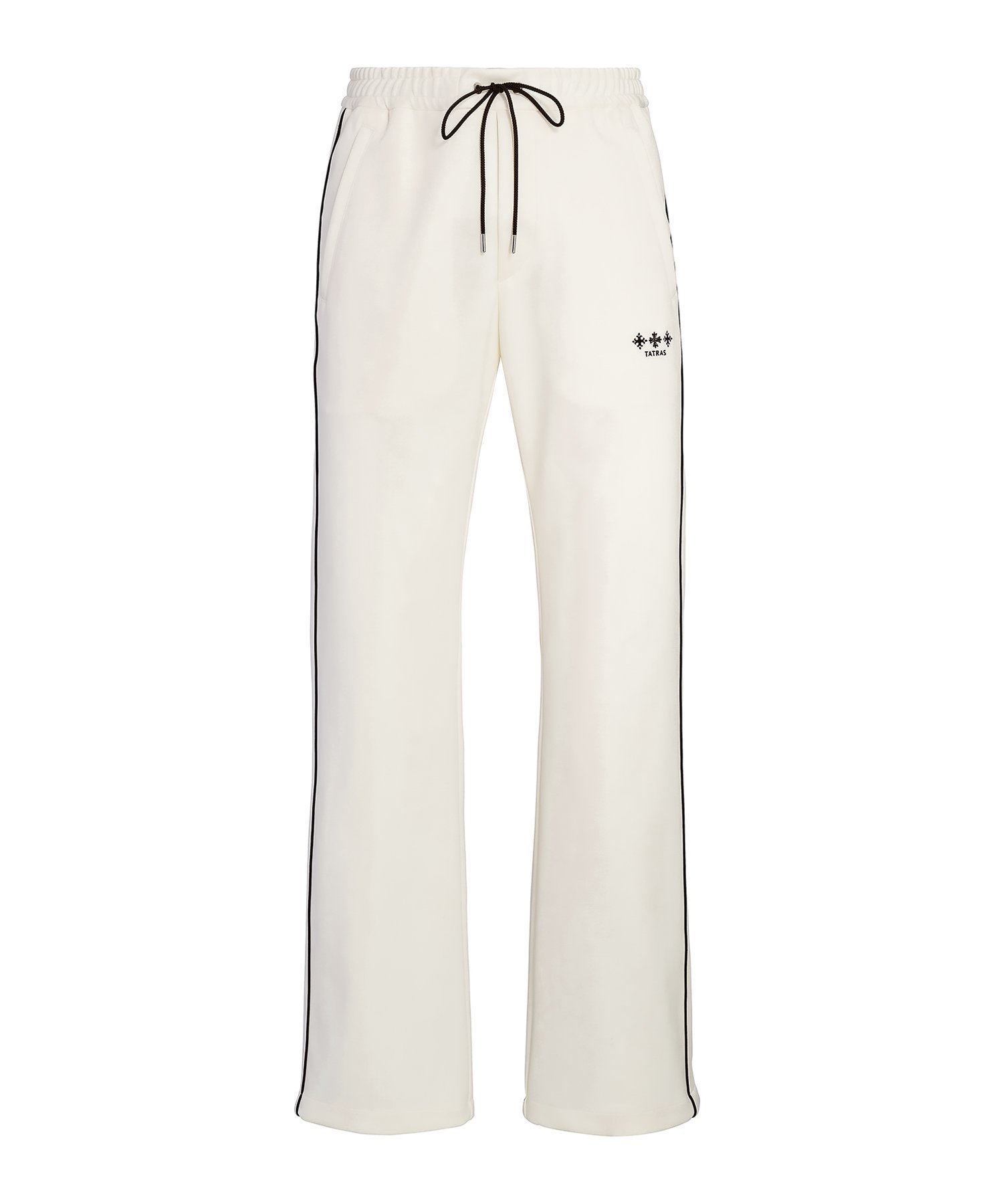 TATRAS FILIRO Эти брюки вдохновлены винтажными спортивными штанами. Они изготовлены из плотного трикотажа, обладающего элегантным блеском и отличной упругостью. Они имеют прямой силуэт с ретро-спортивным оттенком. Две линии по бокам добавляют дизайнерский акцент. Вышитый на поясе значок и логотип привлекают внимание. Затягивающийся шнурок на поясе обеспечивает удобную посадку.