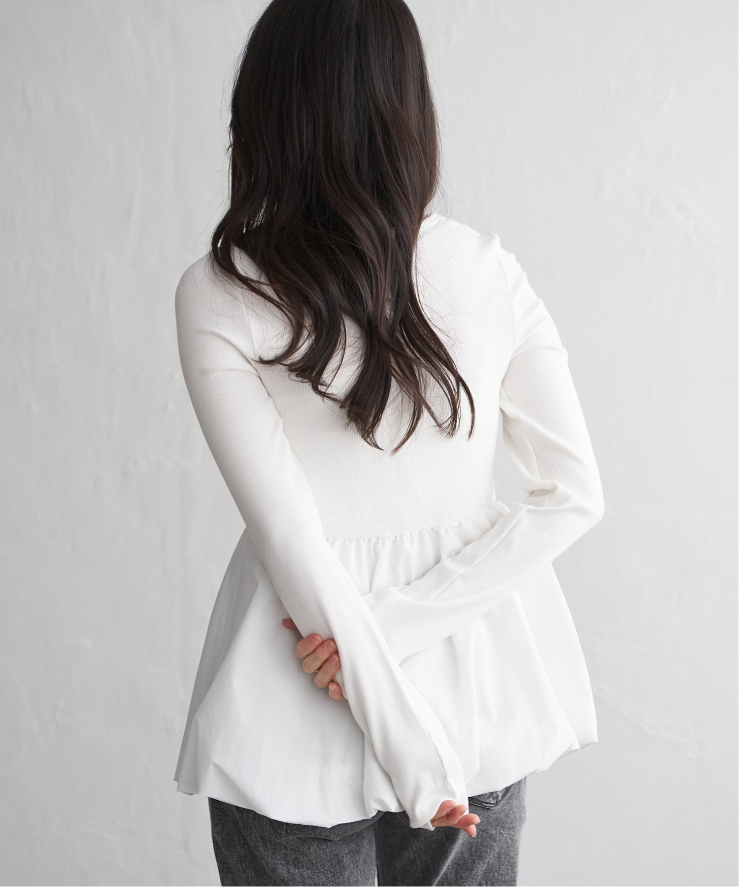 Туника-баллон, сшитая из комбинации различных материалов, со швом на талии, создающим трехмерный эффект.