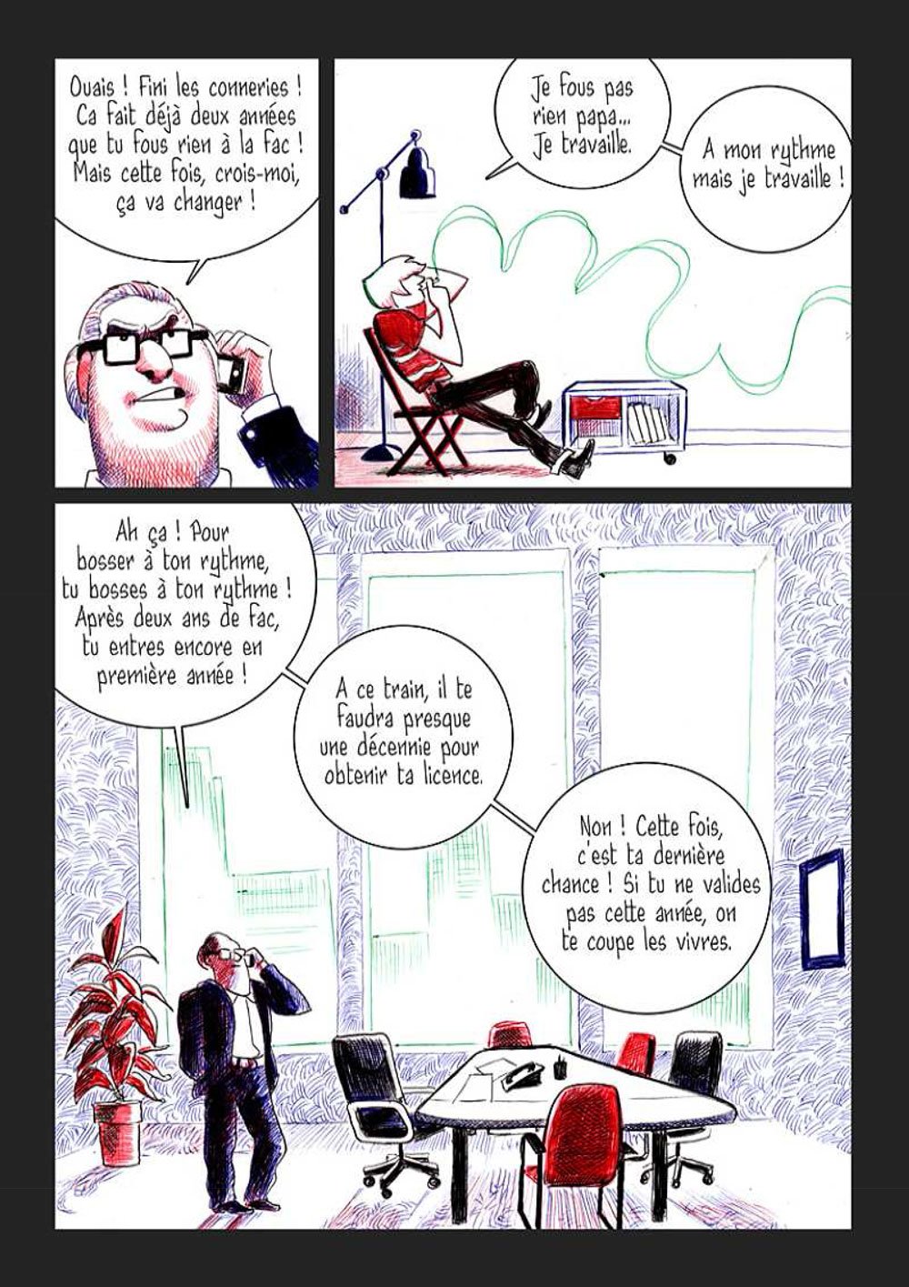 Два студента меняют свою личность для повторения экзаменов. Четыре кружащихся маршрута для лучшего лучшего сюртука для пирса. Un Roman Graphic Noir, Rouge, Vert et Bleu, Realisé au Stylo Quatre Couleurs.