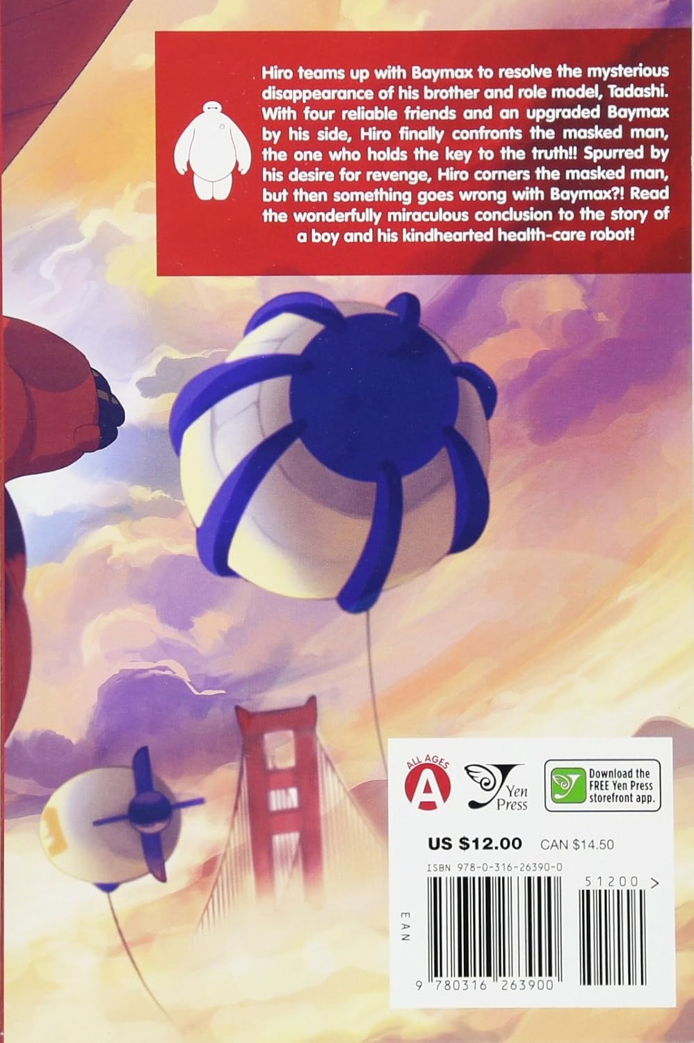 Хиро объединяется с Бэймаксом, чтобы раскрыть таинственное исчезновение своего брата и образца для подражания, Тадаши. С четырьмя верными друзьями и модернизированным Бэймаксом рядом, Хиро наконец-то сталкивается с человеком в маске, тем, кто хранит ключ к истине! Движимый жаждой мести, Хиро загоняет человека в угол, но тут что-то идет не так с Бэймаксом?! Прочитайте чудесное завершение истории мальчика и его добросердечного робота-медика!