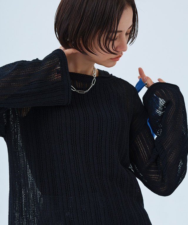 Изготовленный из умеренно плотной пряжи, этот свободный, полупрозрачный трикотаж демонстрирует ровно столько кожи, сколько нужно, создавая впечатление здорового тела.