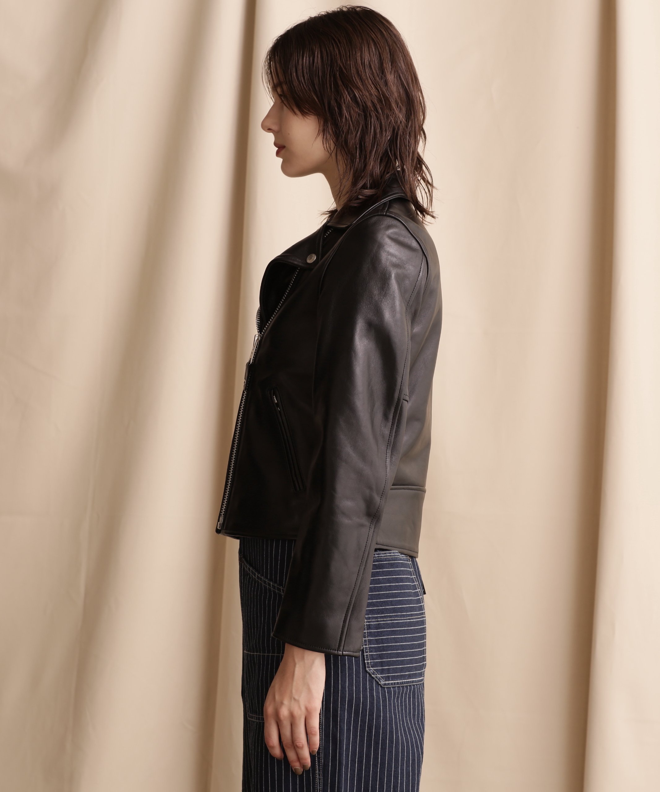 Эта кожаная мотоциклетная куртка уникальна для бренда, сочетая гладкую текстуру с прочным, плотным ощущением.