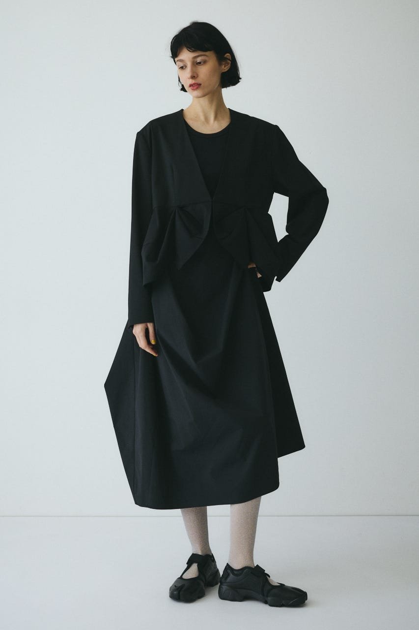 Передняя часть выполнена таким образом, чтобы ткань была приподнята вверх, что придает жакету свободу движений и эффект стройности.