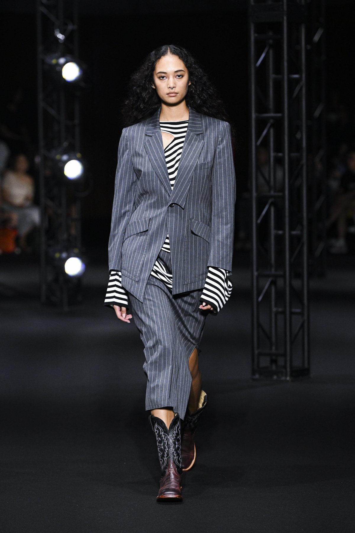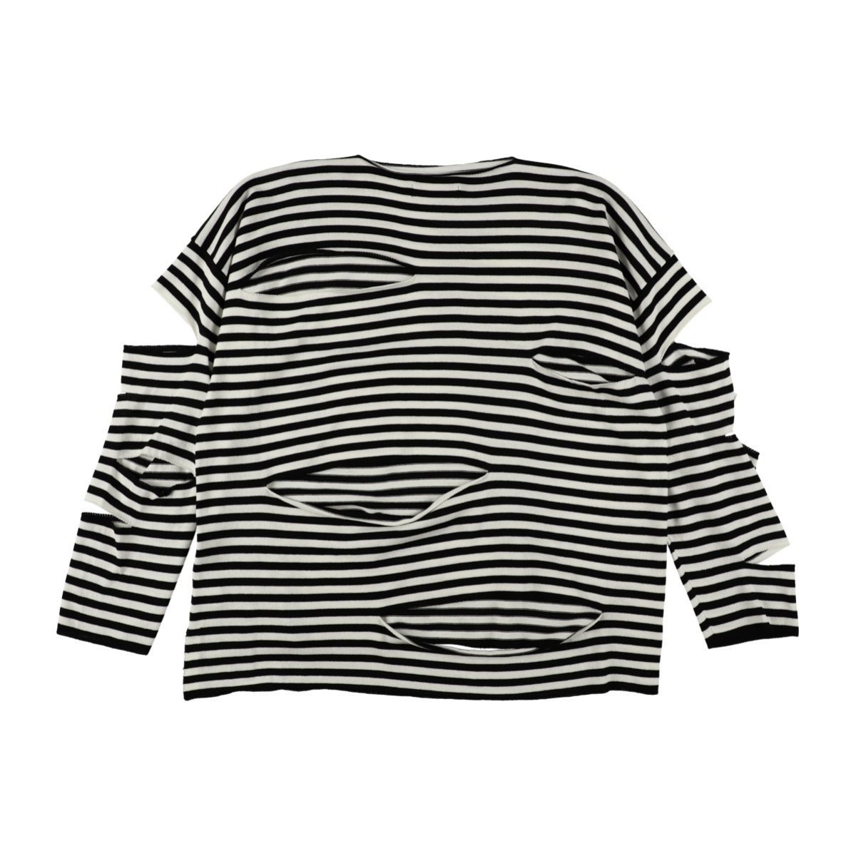 Полосатый трикотаж с прерывистым узором, созданным разрезами по бокам. Этот трикотаж идеально подходит для многослойного ношения с различными вещами под ним.