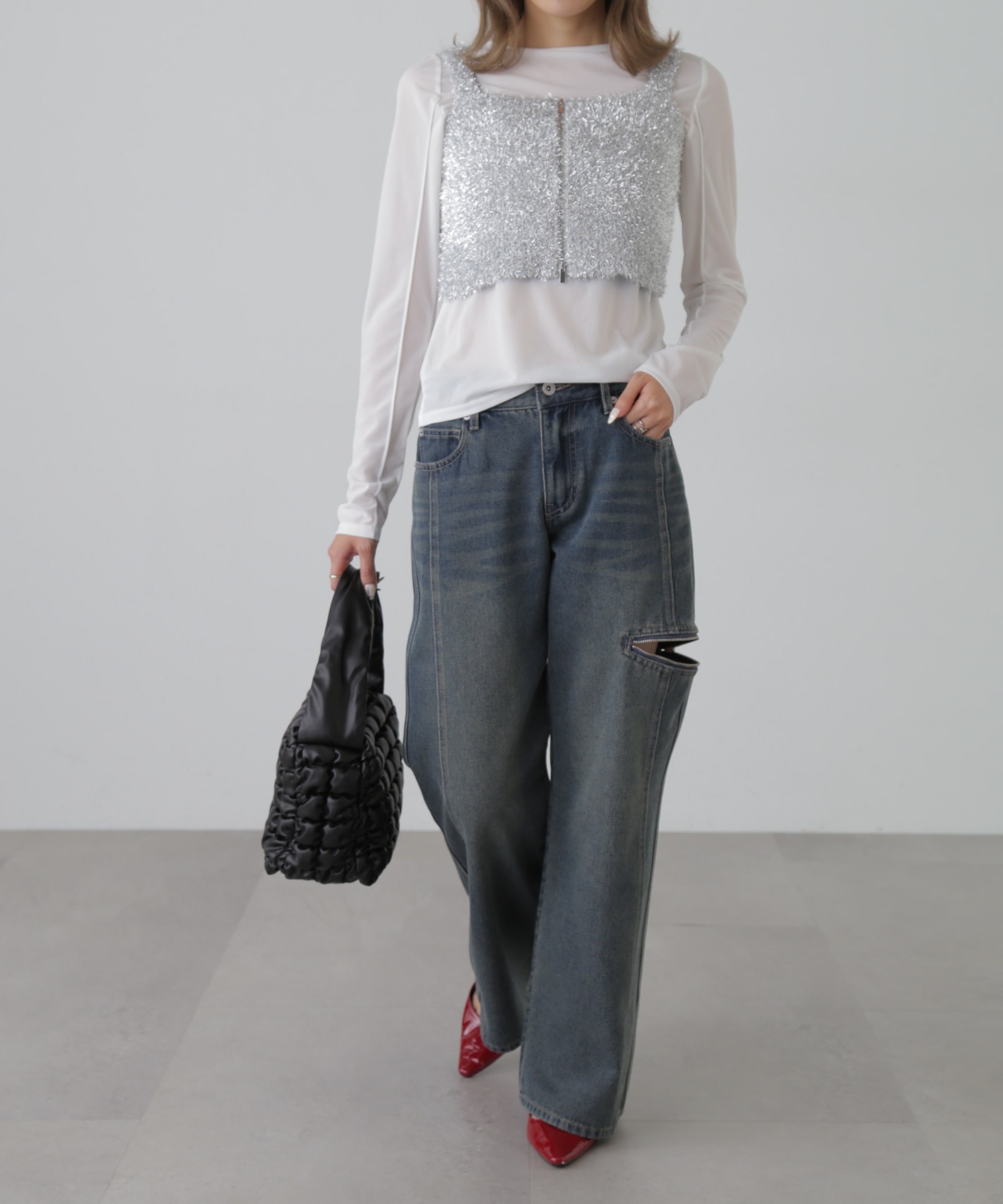 Модный бюстгальтер с блестками. Сочетание букле и блестящей нити создает объемный и привлекательный образ. Спереди застежка-молния с обратной стороны, поэтому его можно носить застегнутым или расстегнуть, создав разрез. Это вещь, которая сама по себе выглядит эффектно, поэтому, добавив ее к простому наряду из брюк и футболки, вы мгновенно придадите ей гламурный вид. В зависимости от нижнего белья, которое вы наденете под него, его можно носить в течение длительного времени.