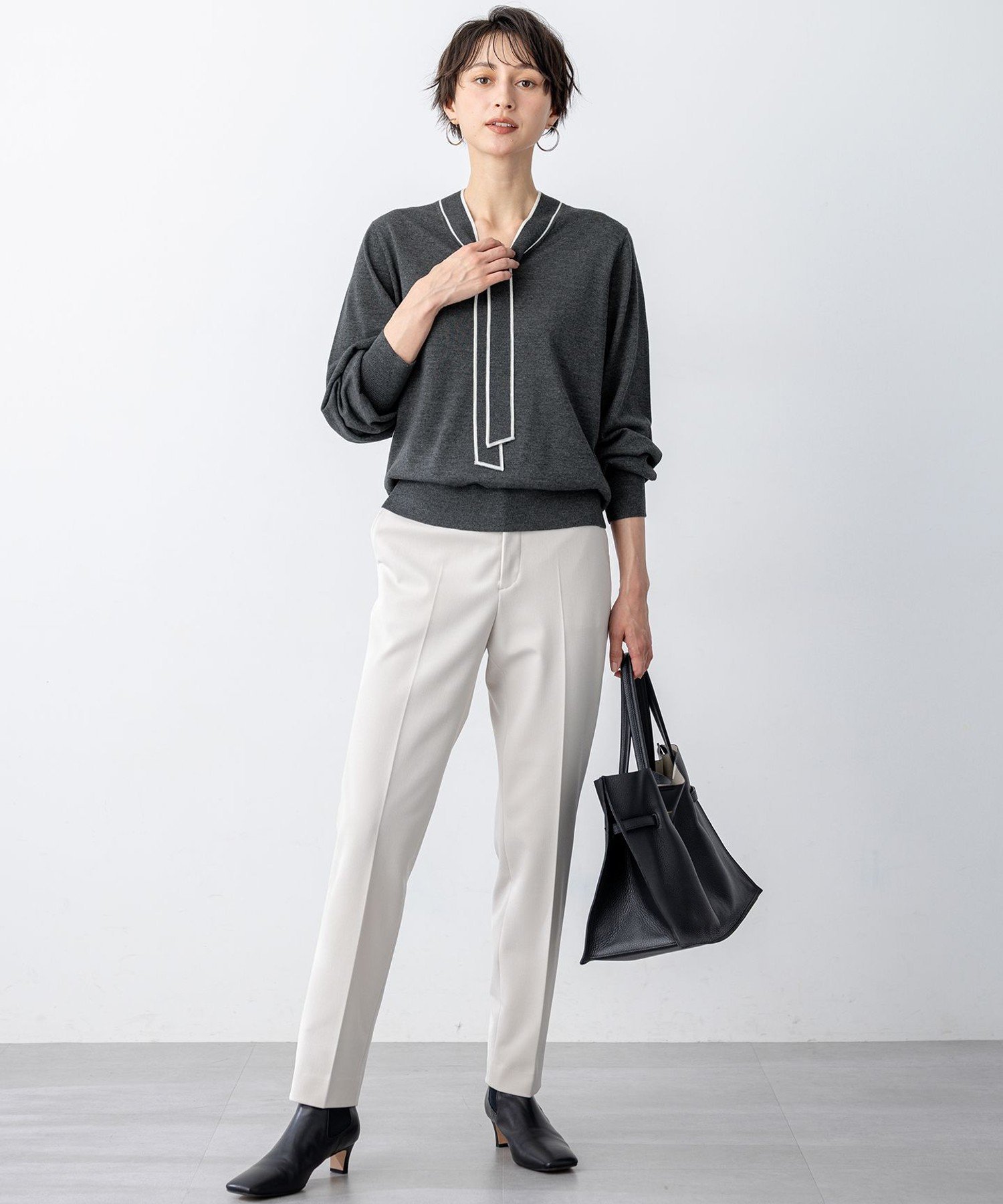 Этот элегантный вязаный пуловер с бантом изготовлен из гладкого трикотажа. Сдержанная цветовая гамма банта подчеркивает вырез горловины, добавляя нотку гламура. Мягкие рукава-фонарики создают нежное, женственное впечатление, а сдержанный силуэт обеспечивает утонченный, элегантный образ, который прекрасно вписывается в офисный стиль. Он прекрасно сочетается как с брюками, так и с юбками, предоставляя широкий выбор вариантов сочетаний. Доступен в четырех цветах: лаконичный черный (#005), спокойный серый (#004), шикарный бежевый (#033) и изысканный темно-синий (#075).
