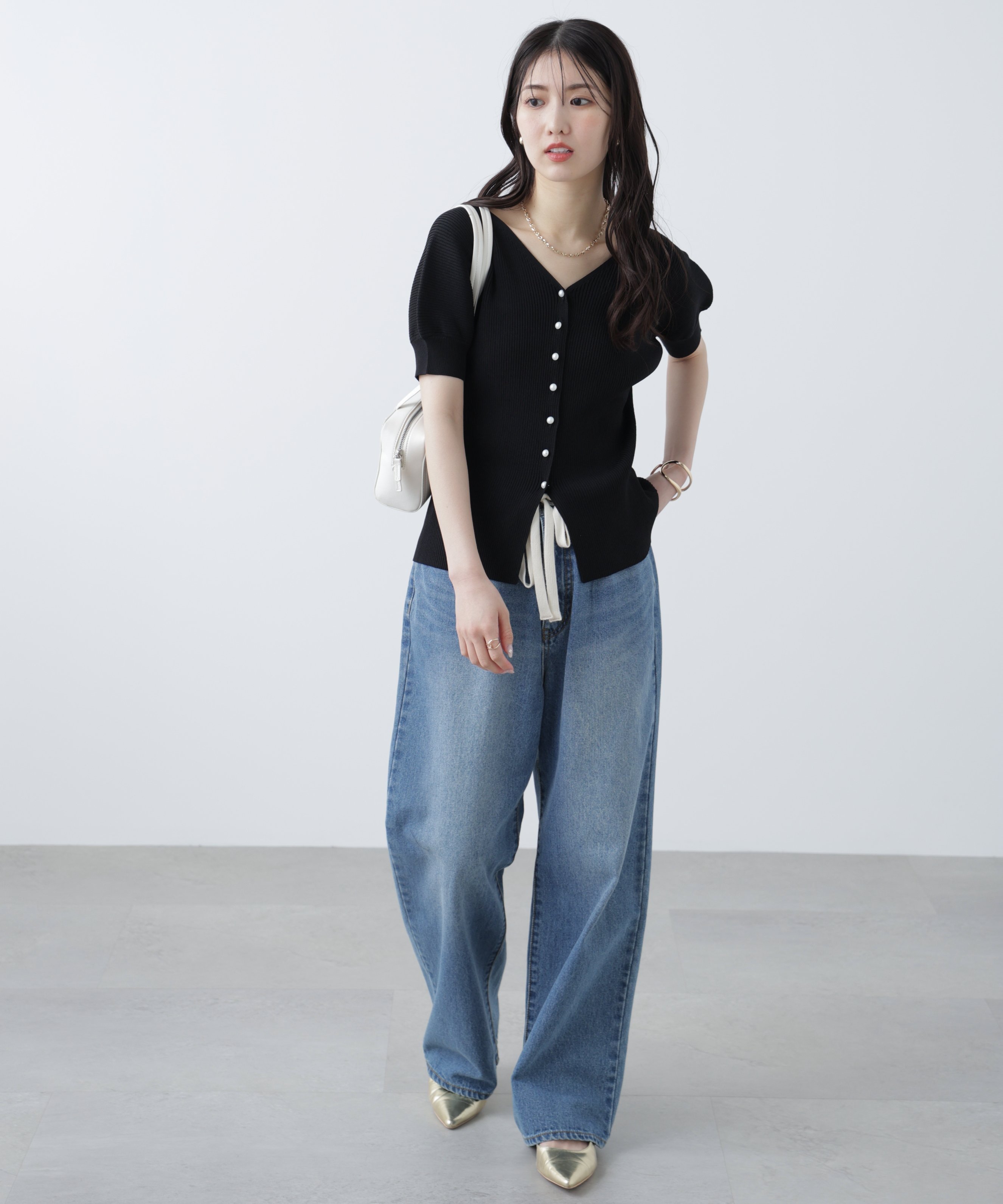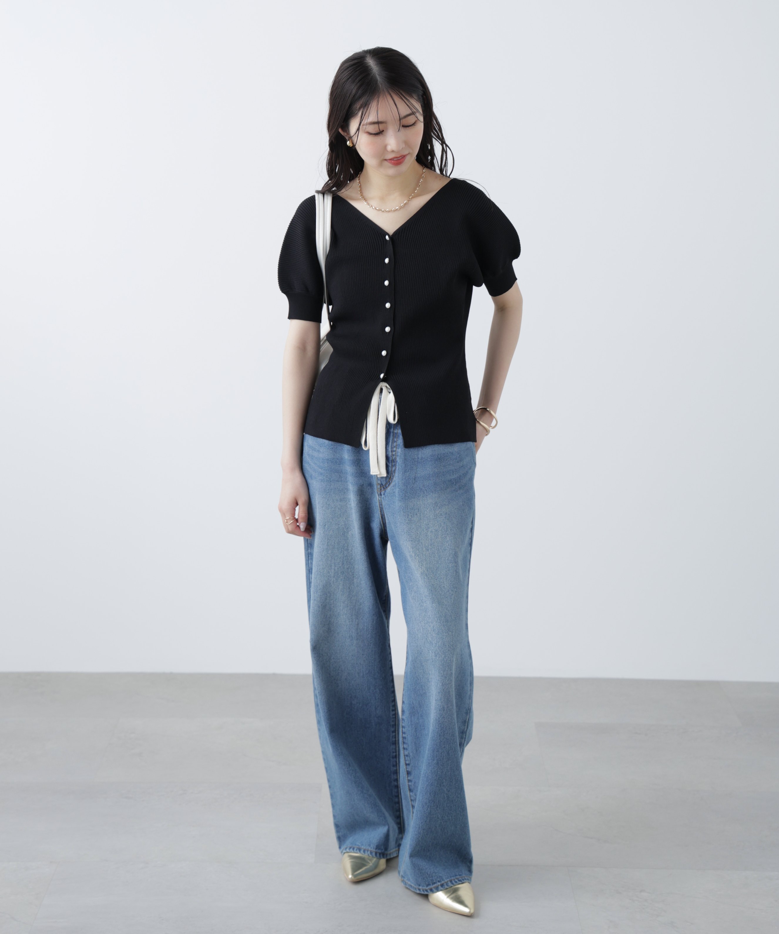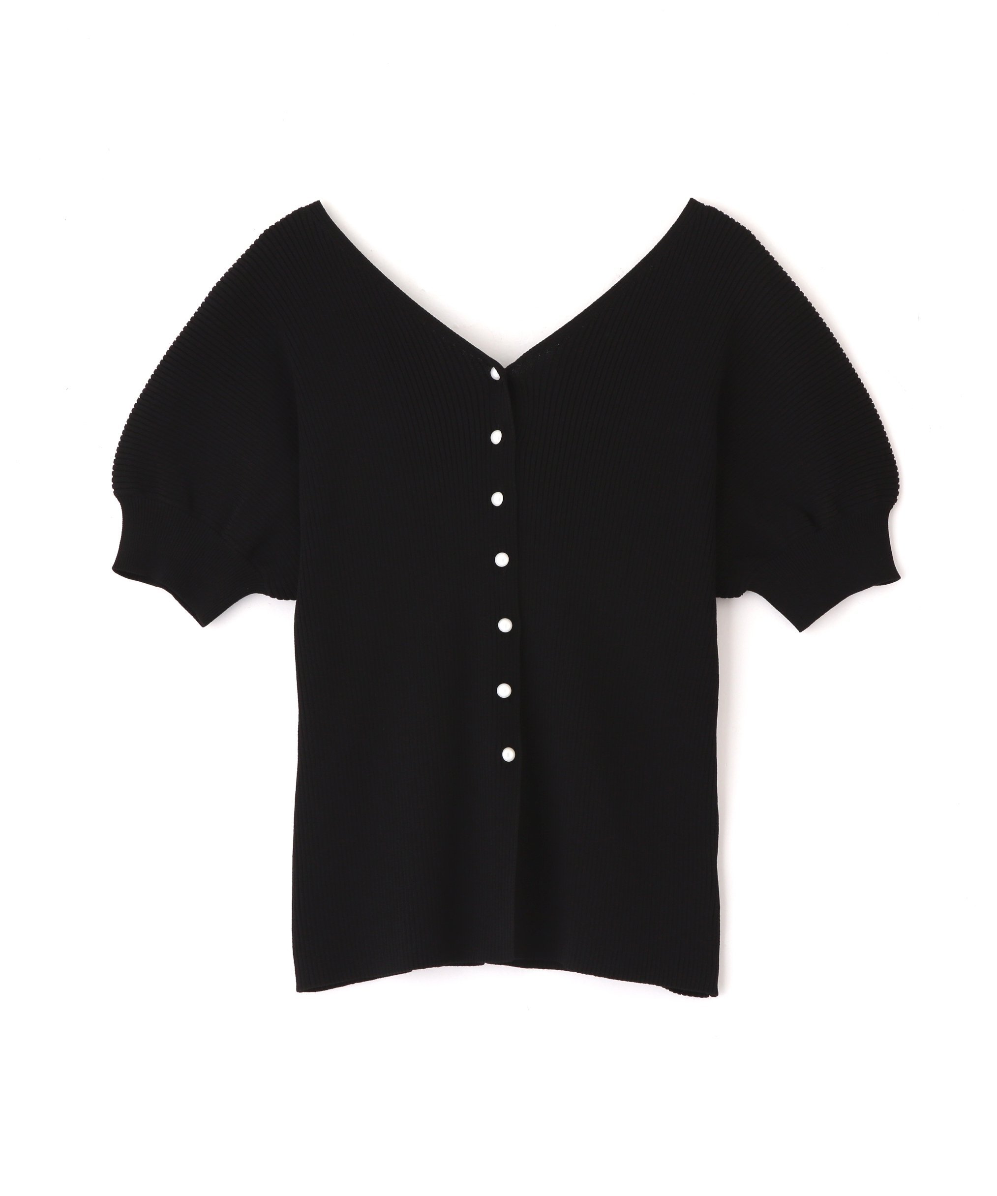 [Милый летний вязаный свитер с перламутровым эффектом] Вязаный свитер с короткими рукавами из сухого, легкого материала, идеально подходящий для лета. V-образный вырез создает элегантный силуэт. Маленькие перламутровые пуговицы — любимая деталь дизайна. Пышные рукава закрывают предплечья. Мы также рекомендуем сочетать его с джинсами, брюками или юбкой-русалкой.