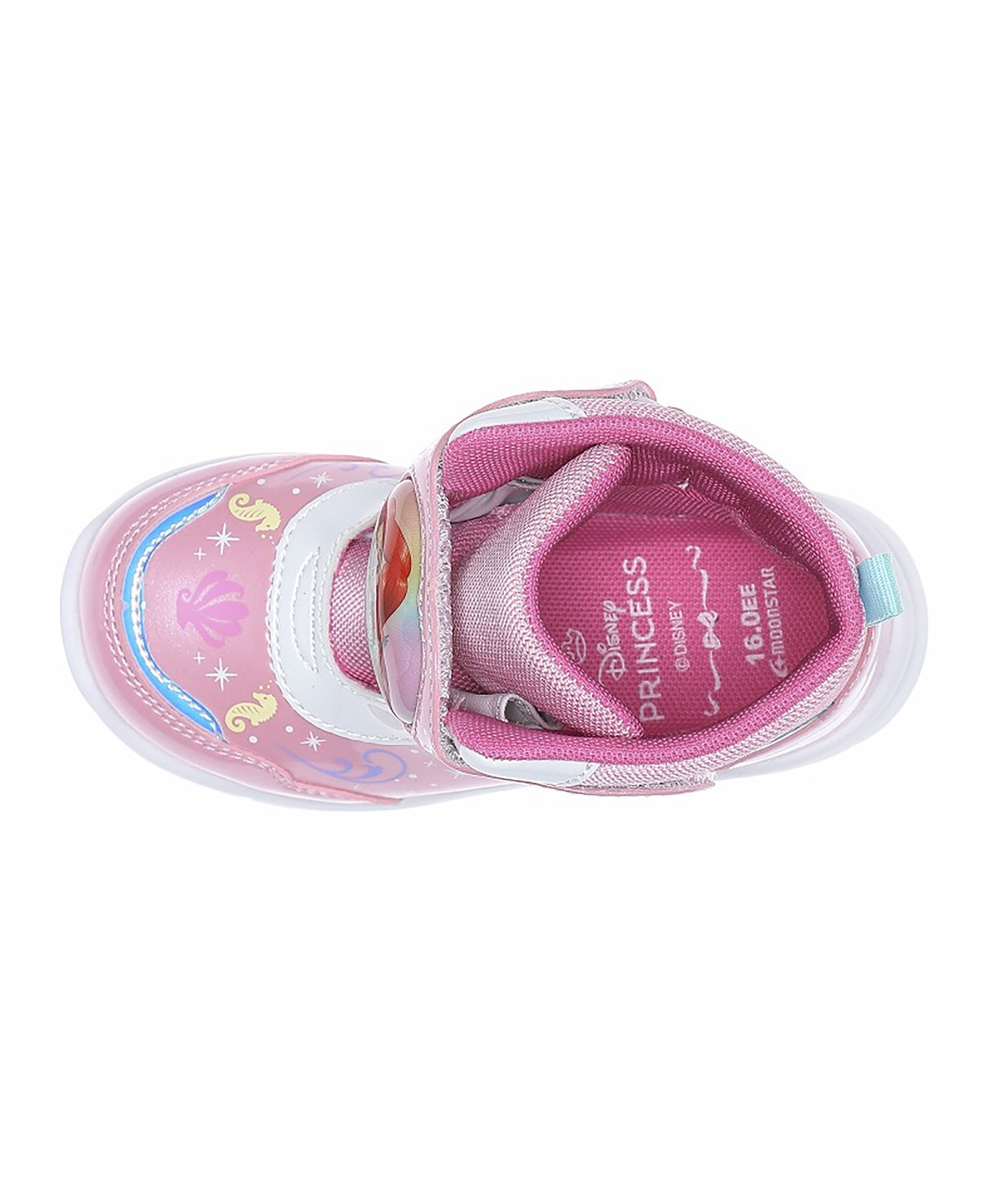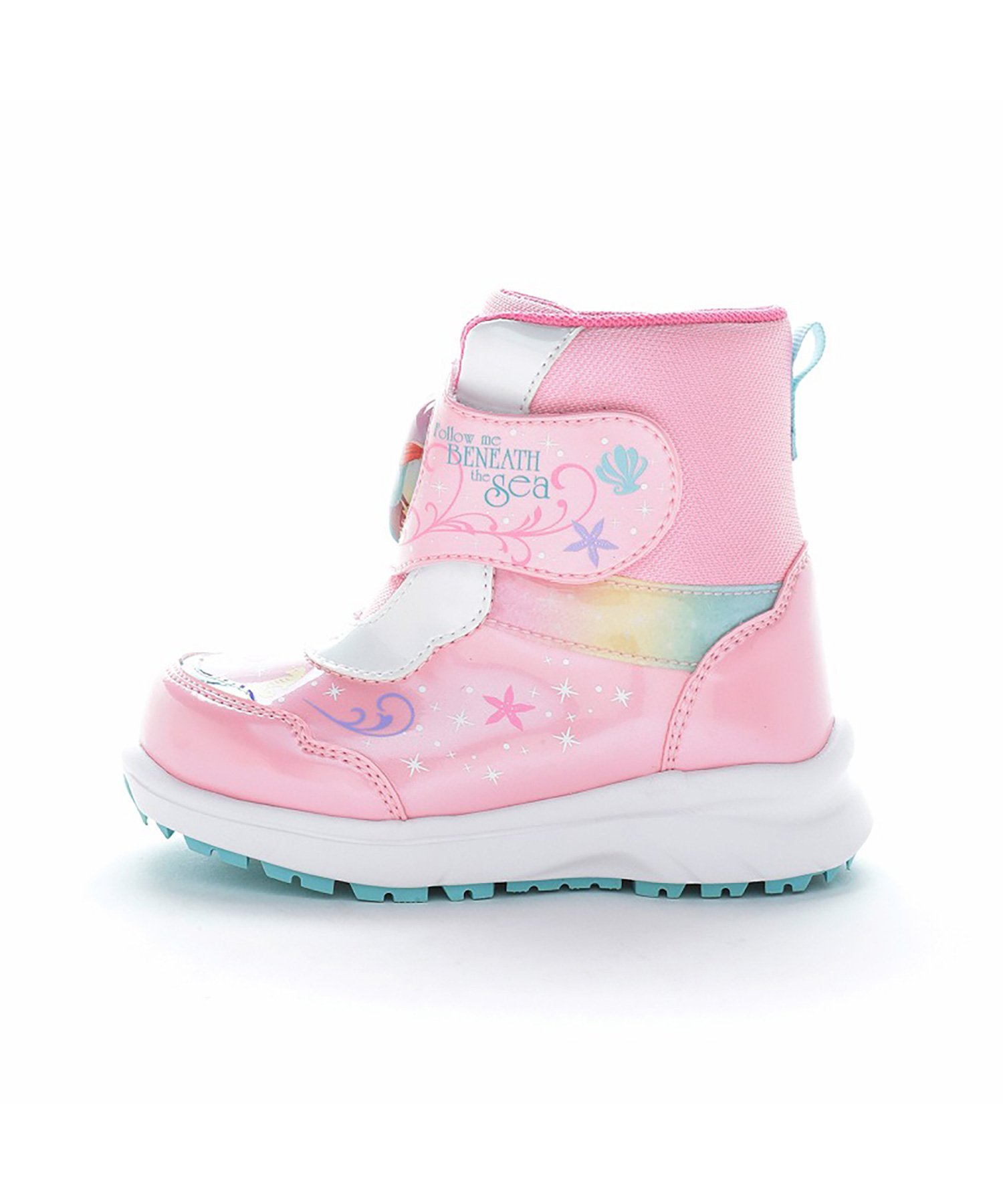 Они имеют одну застежку-липучку для удобства надевания и снимания. Липучка в форме сердца украшена изображением персонажа, создавая великолепный дизайн с блестящими материалами. Розовая версия выполнена в виде Ариэль. Светодиод в липучке загорается при вибрации, повышая безопасность в темное время суток. Липучка съемная, что позволяет стирать обувь отдельно. Предполагаемое количество включений составляет около 300 000, обеспечивая свечение примерно в течение двух месяцев. Они имеют водонепроницаемую конструкцию (4 см, 4 часа), рекомендованную для использования в дождь и снег, а подошва разработана для отличного сцепления. Вес каждой пары обуви составляет приблизительно 230 г для размера 16,0 см. Стелька обладает антибактериальными и дезодорирующими свойствами Ag+.