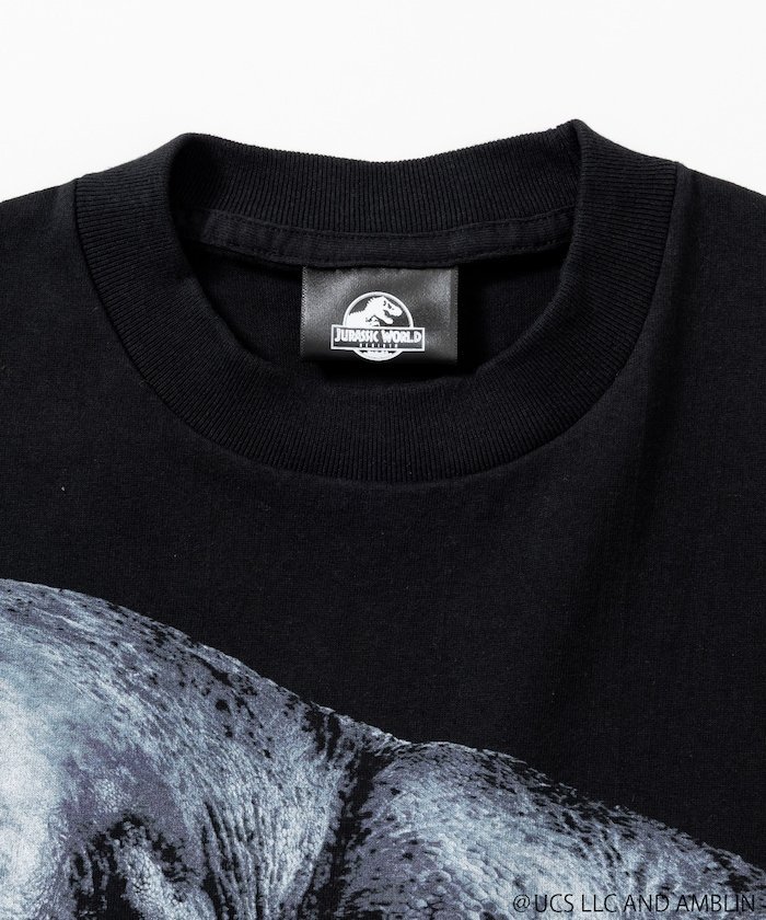 Футболка с изображением динозавра Дистортуса Рекса, последнего фильма из нашумевшей серии, снятого Гаретом Эдвардсом, гением, стоящим за «Изгой-один: История Звездных войн», на передней стороне украшена эффектным монохромным принтом. На спине — большой цветной принт логотипа «Мира Юрского периода» с изображением различных динозавров из фильма. Ниже расположены логотипы Universal и Amblin.