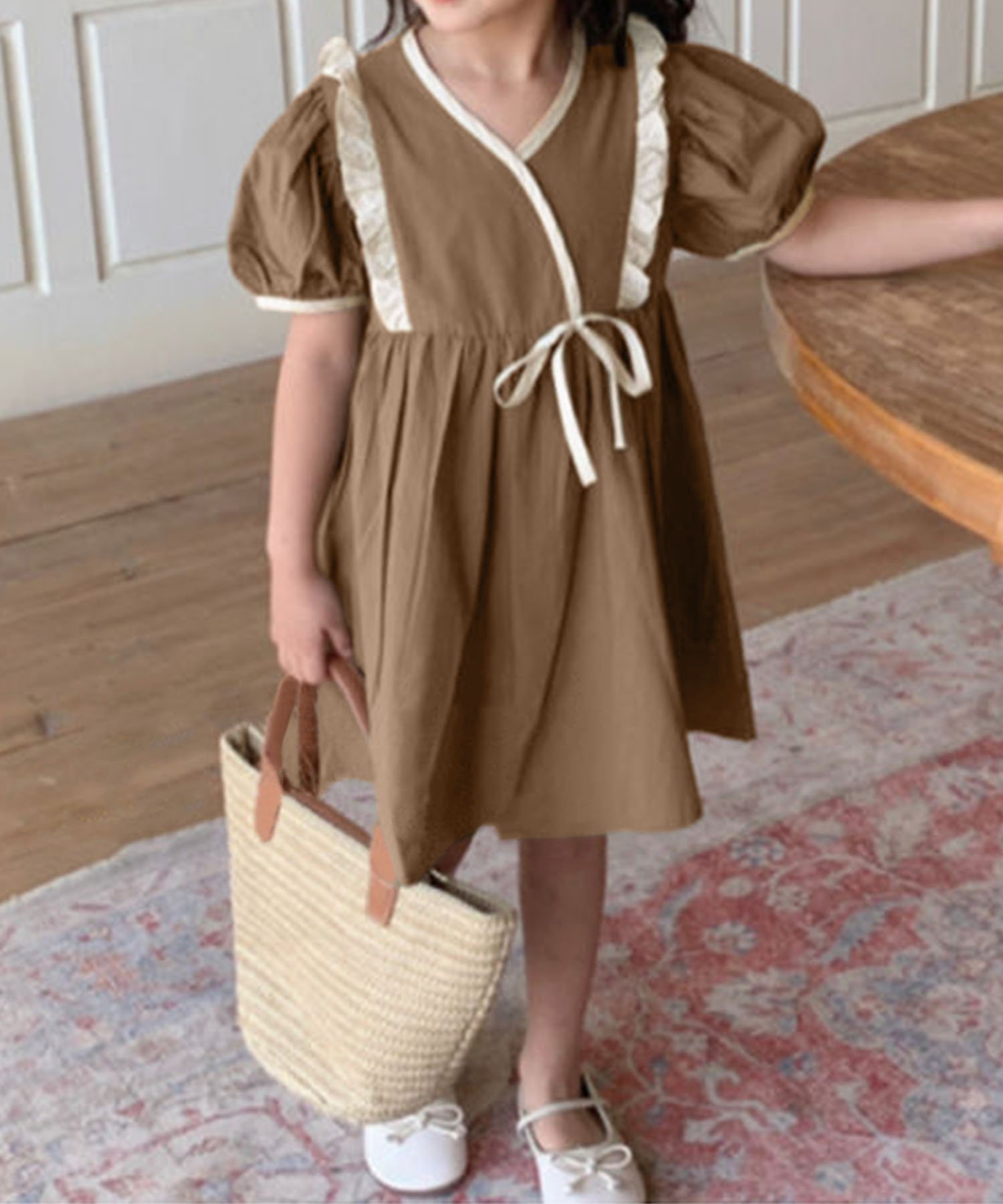 Это платье с V-образным вырезом и кружевной отделкой в тон делает его стильным нарядом, достойным любой взрослой женщины.