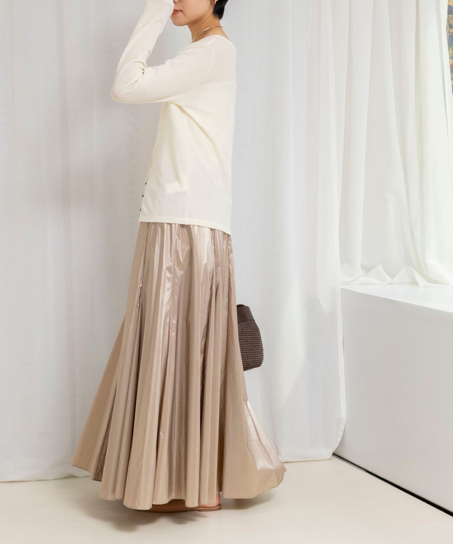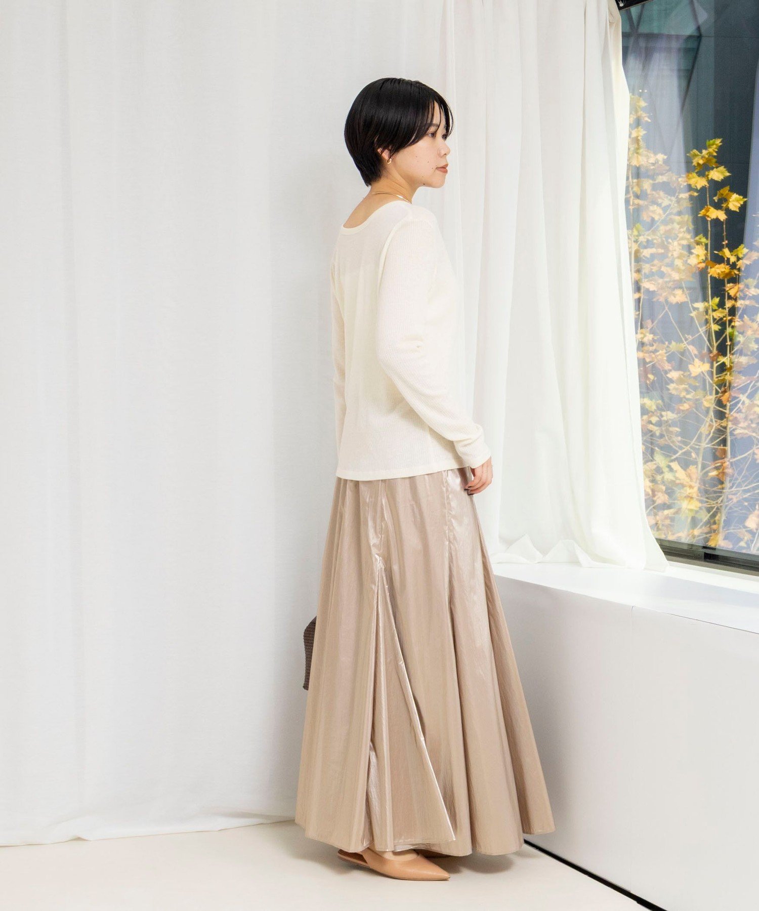 ・Особый крой, созданный путем соединения восьми кусков ткани и добавления ластовиц в четырех местах, формирует силуэт, который облегает талию и красиво расширяется к низу.