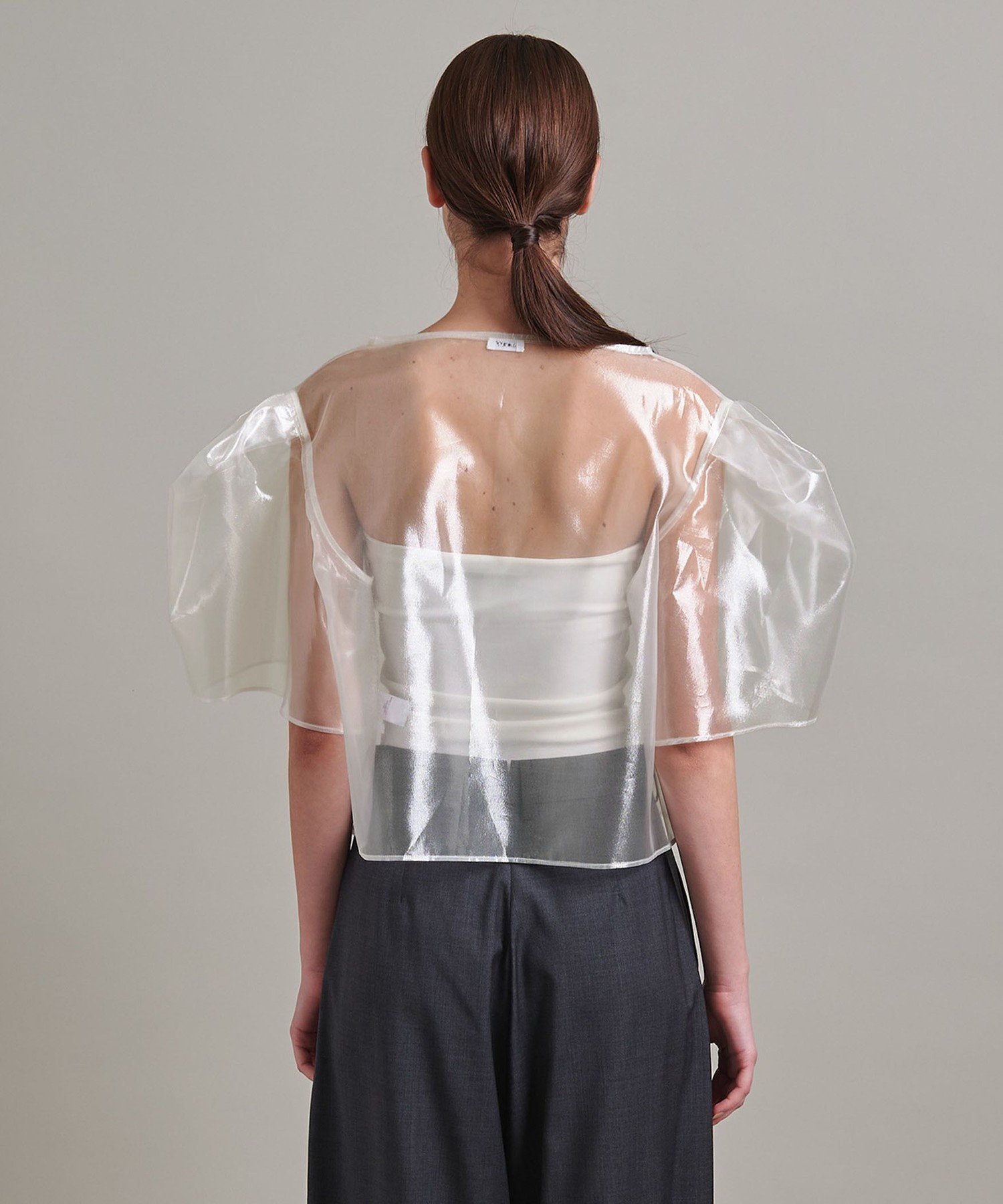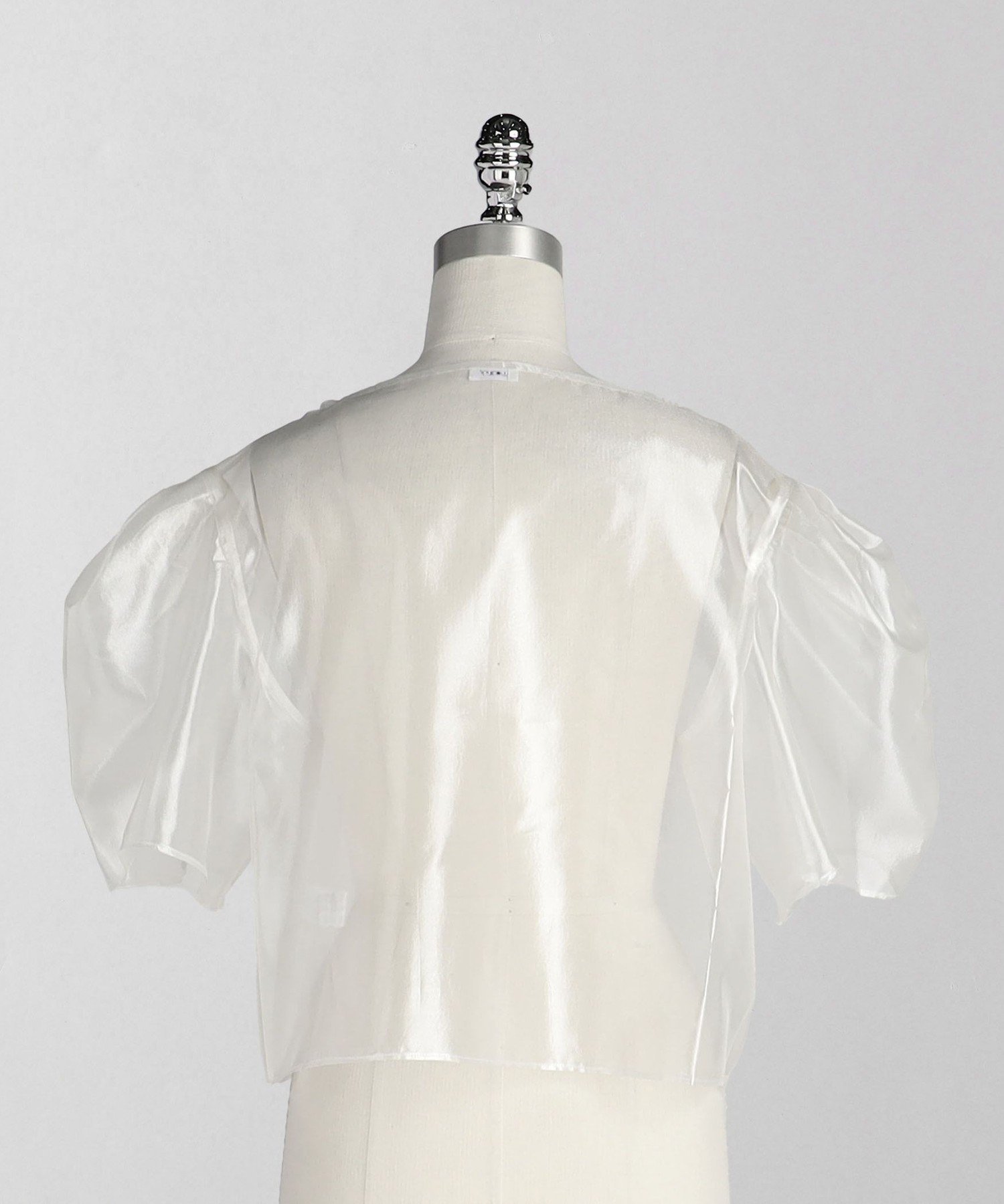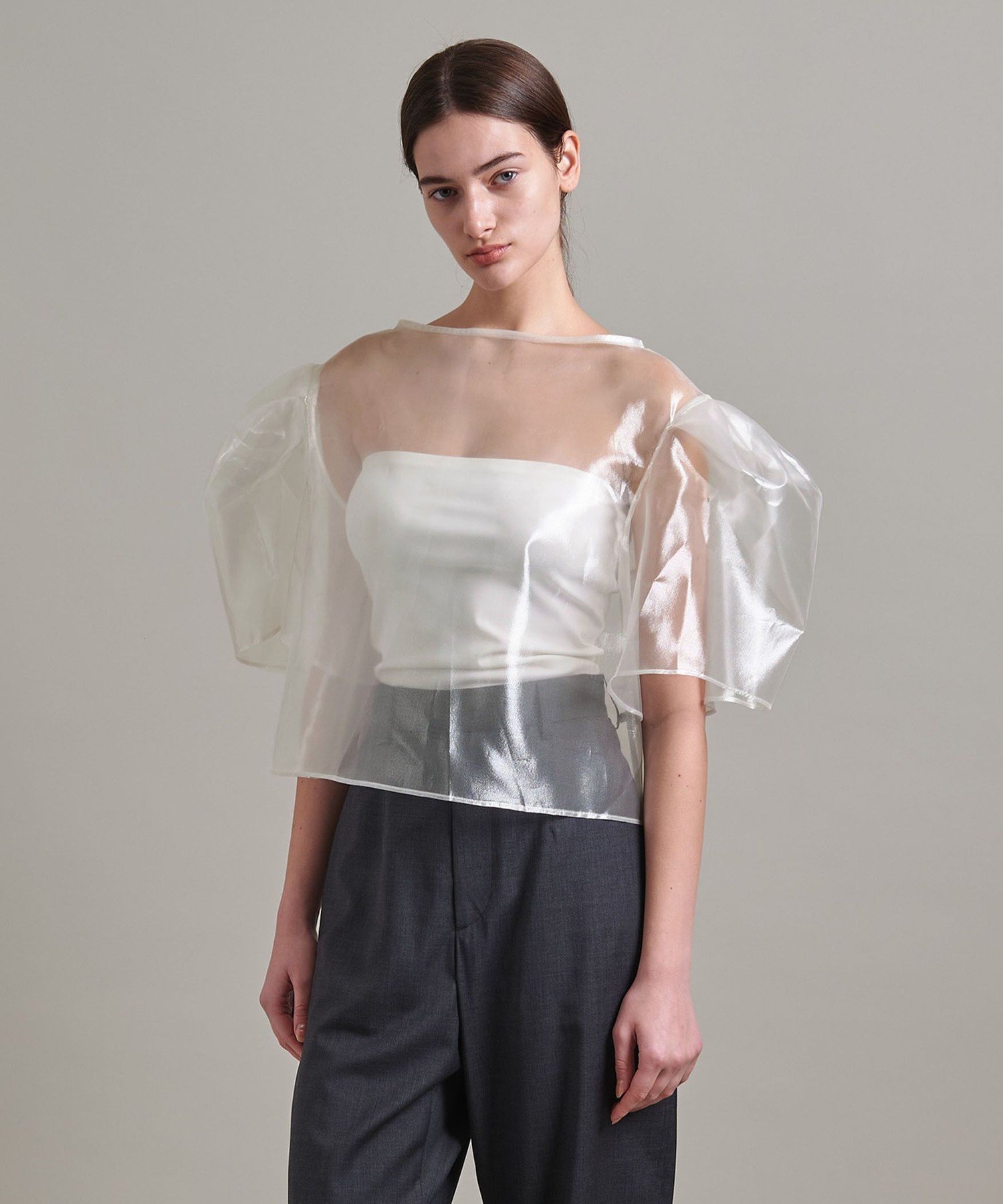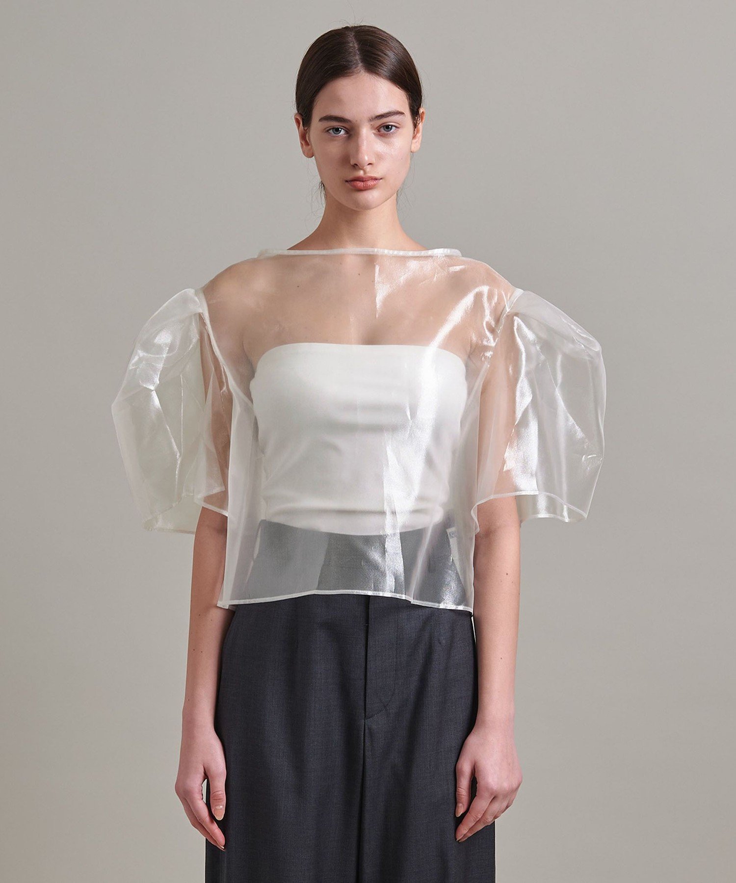 Укороченный, свободный силуэт с заправленными рукавами-фонариками, которые стянуты, как у мешочка на завязках.