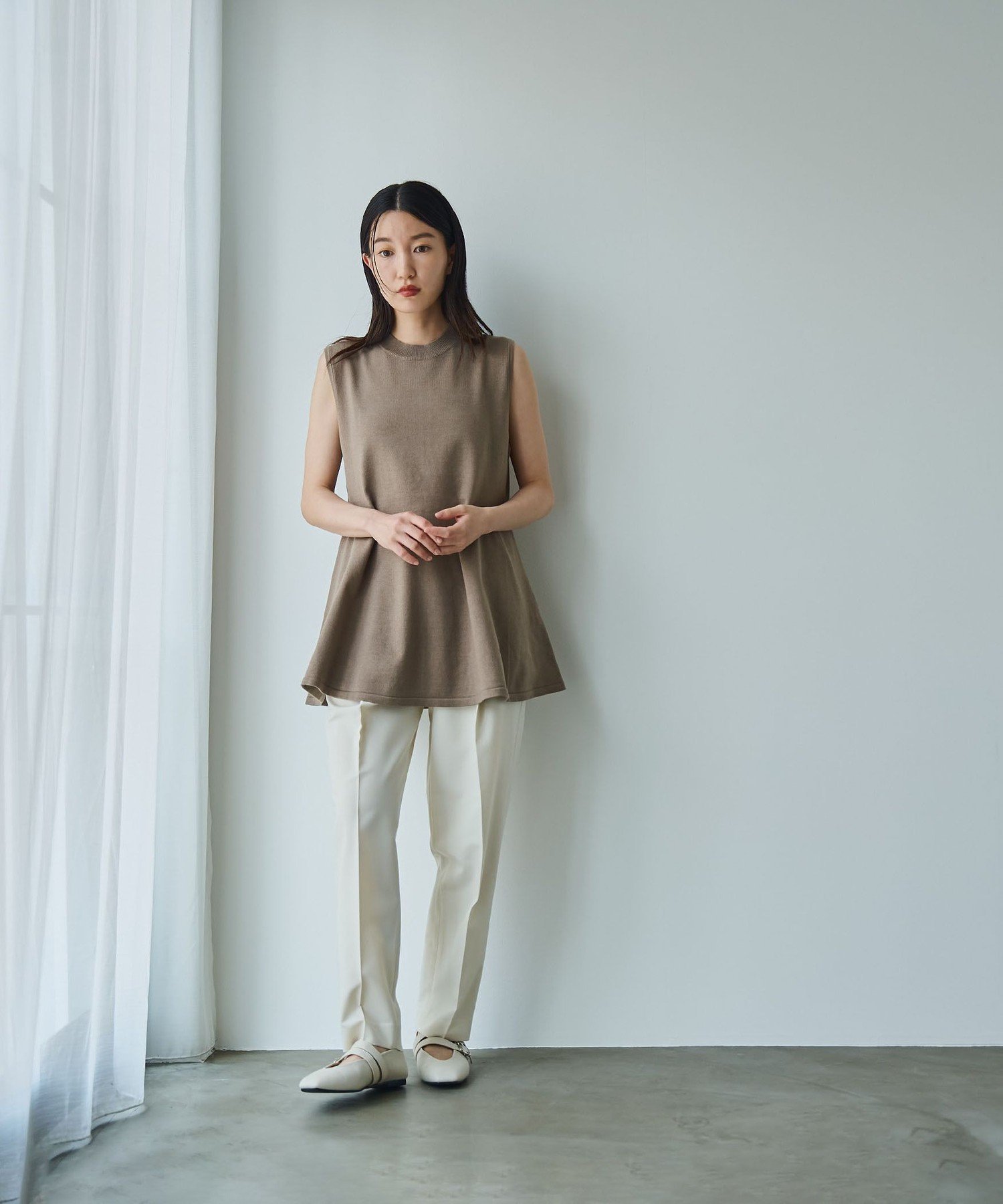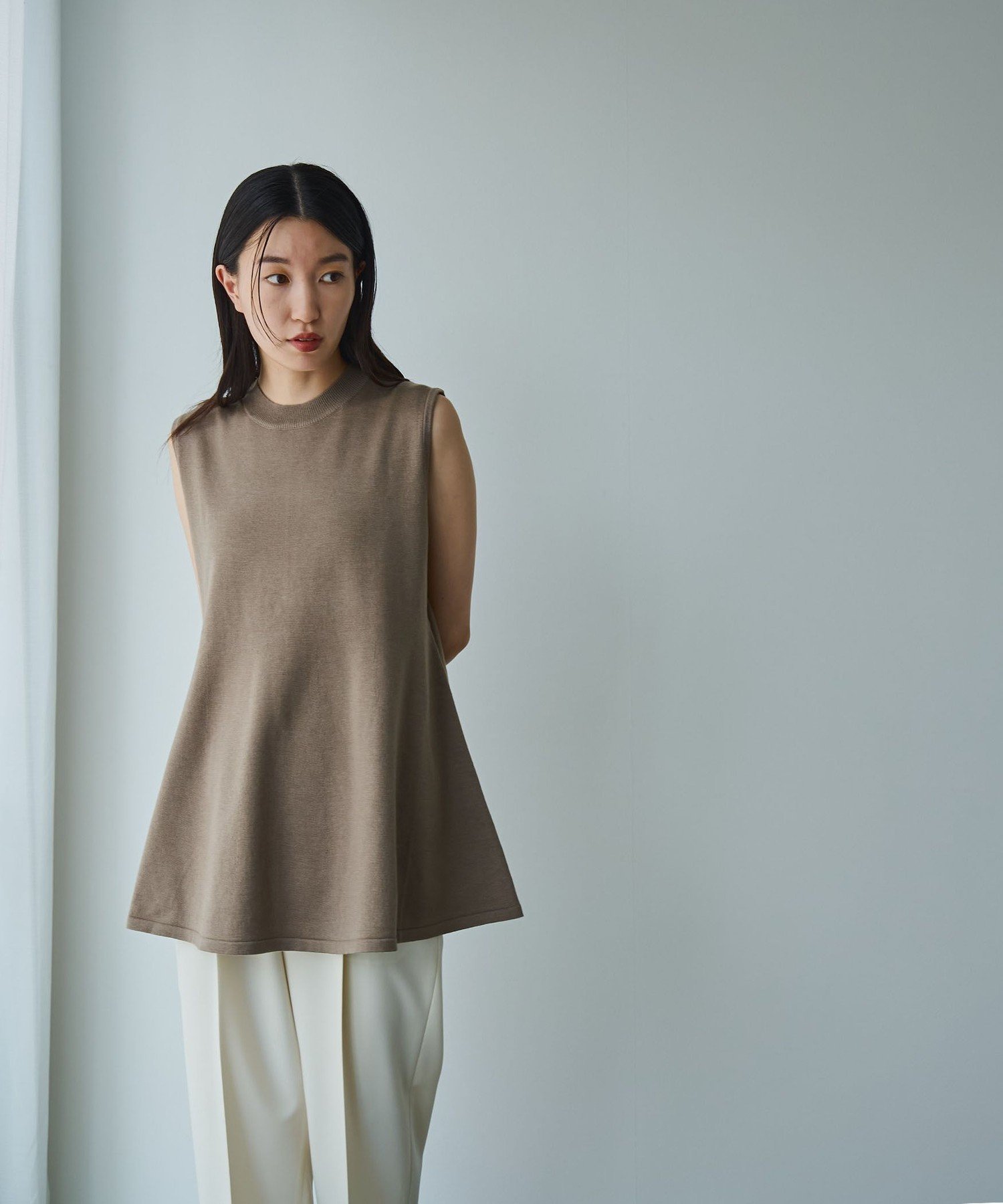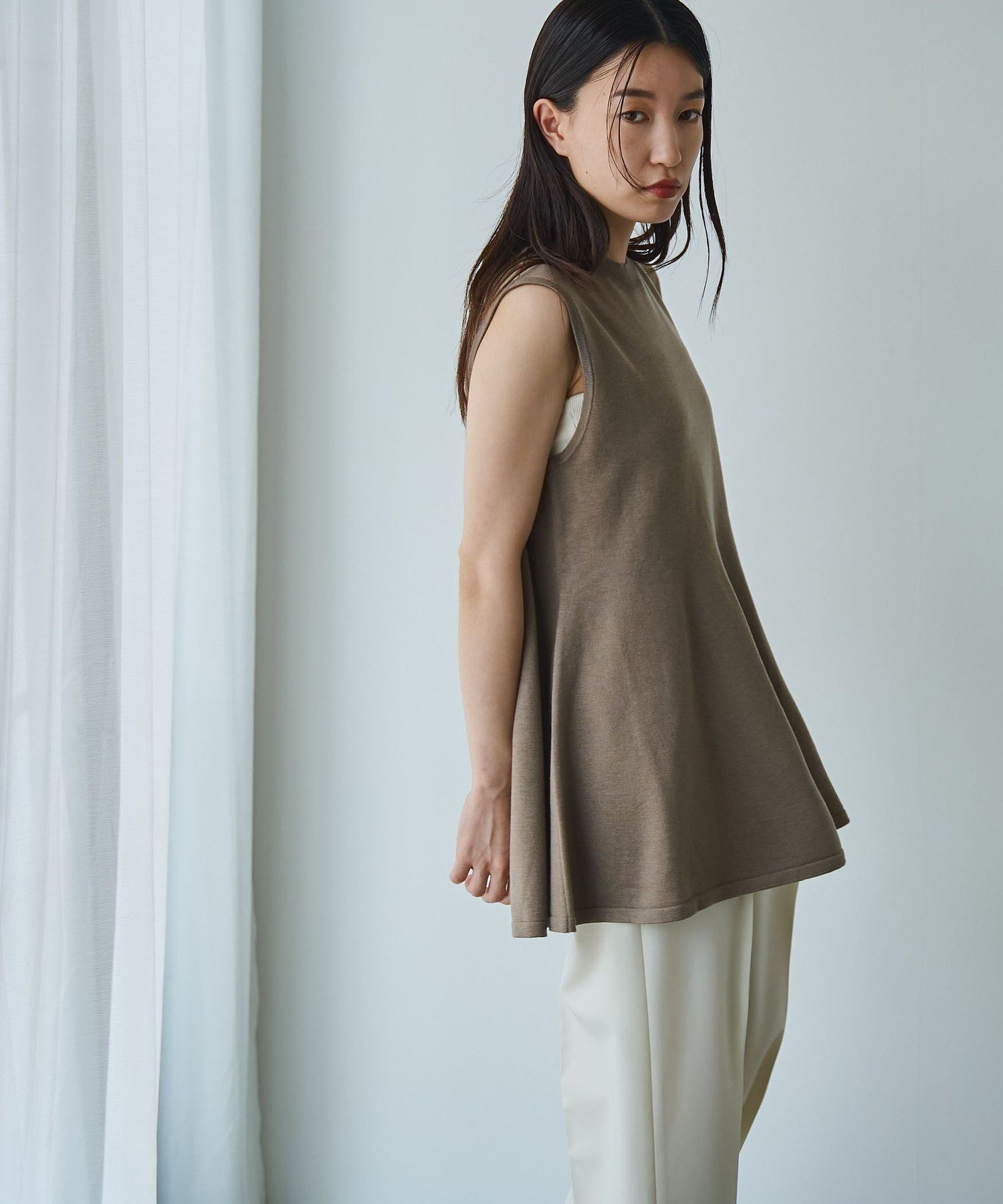 Он имеет расклешенный силуэт и длину туники, которая деликатно прикрывает талию и бедра.