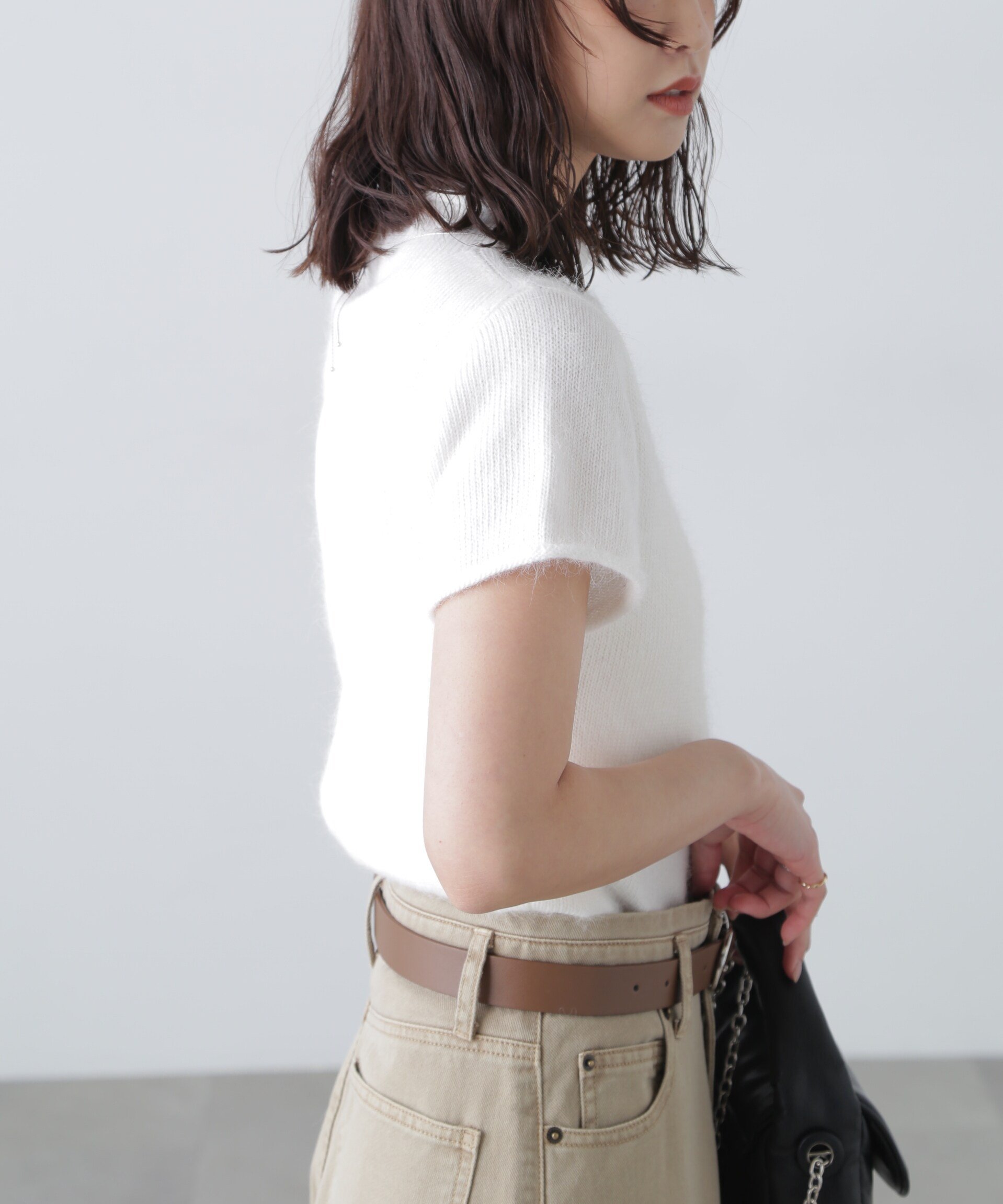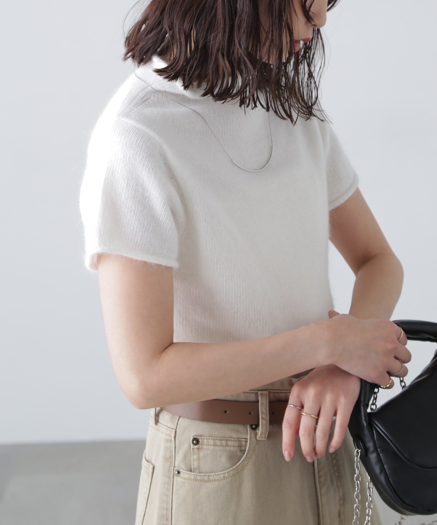 Милый вязаный свитер с короткими рукавами, мягкий и пушистый на ощупь. Особенностью является дизайн горлышка, обхватывающего лицо. Длина рукавов идеально подходит для перехода от зимы к весне, а посадка не слишком обтягивающая, что делает свитер легким и воздушным. Доступен в трех цветах: светло-серый меланж и кремовый, которые легко носить каждый день, и весенний розовый. Он сочетается с самыми разными стилями, от делового до повседневного. Рекомендуем сочетать его с джинсами или другими повседневными брюками.