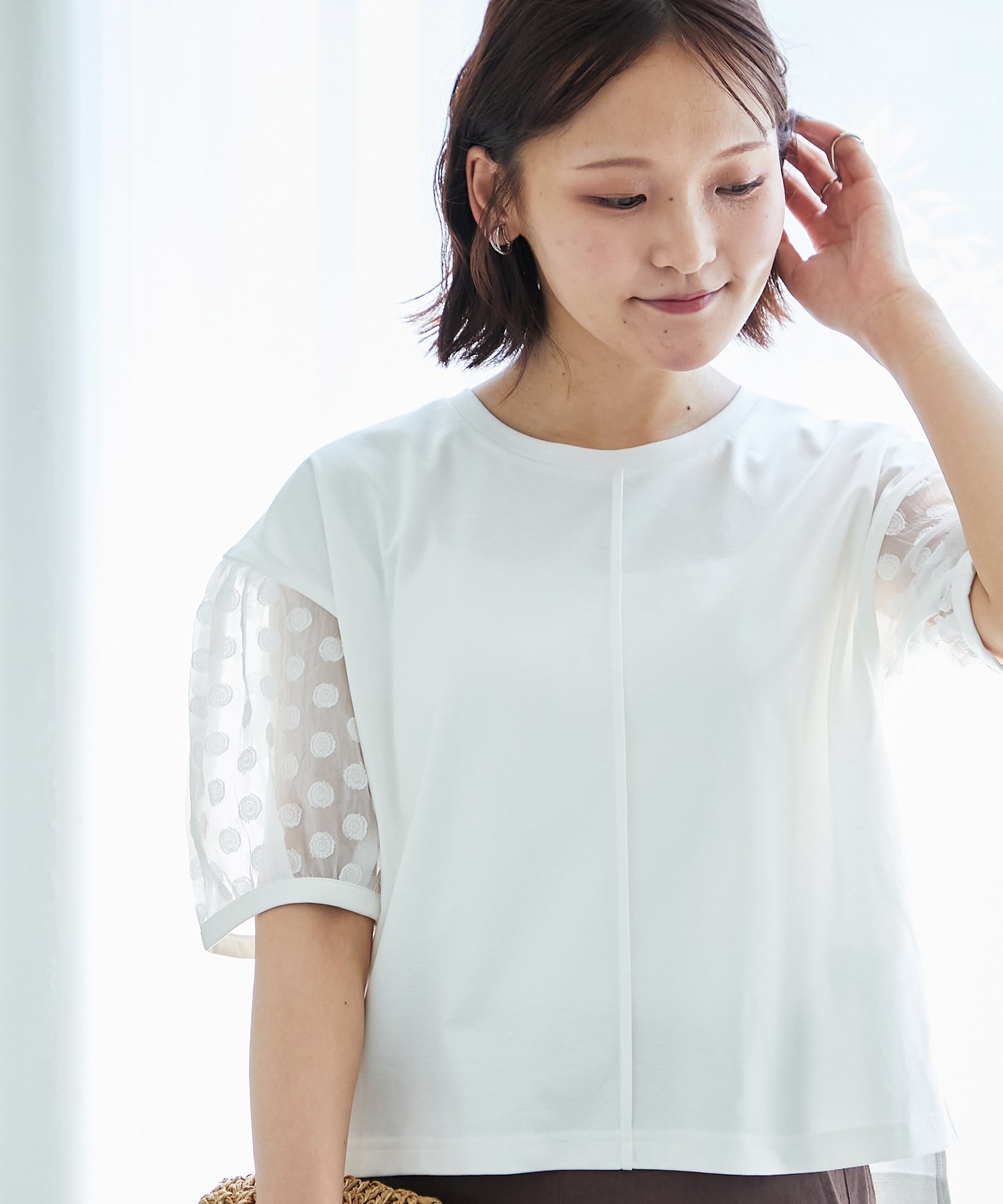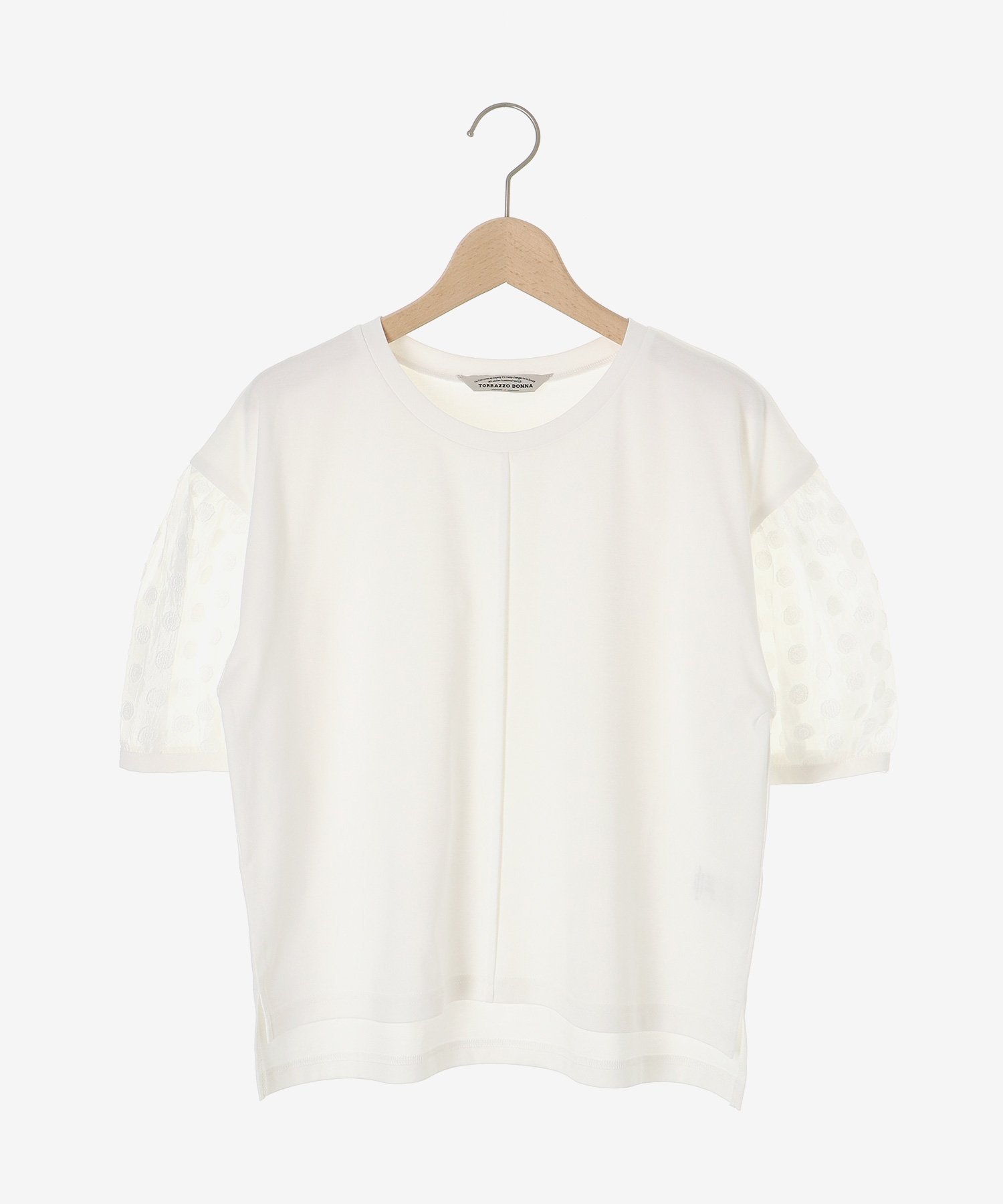 Футболка, сочетающая в себе крой и пошив с прозрачной вставкой в горошек.