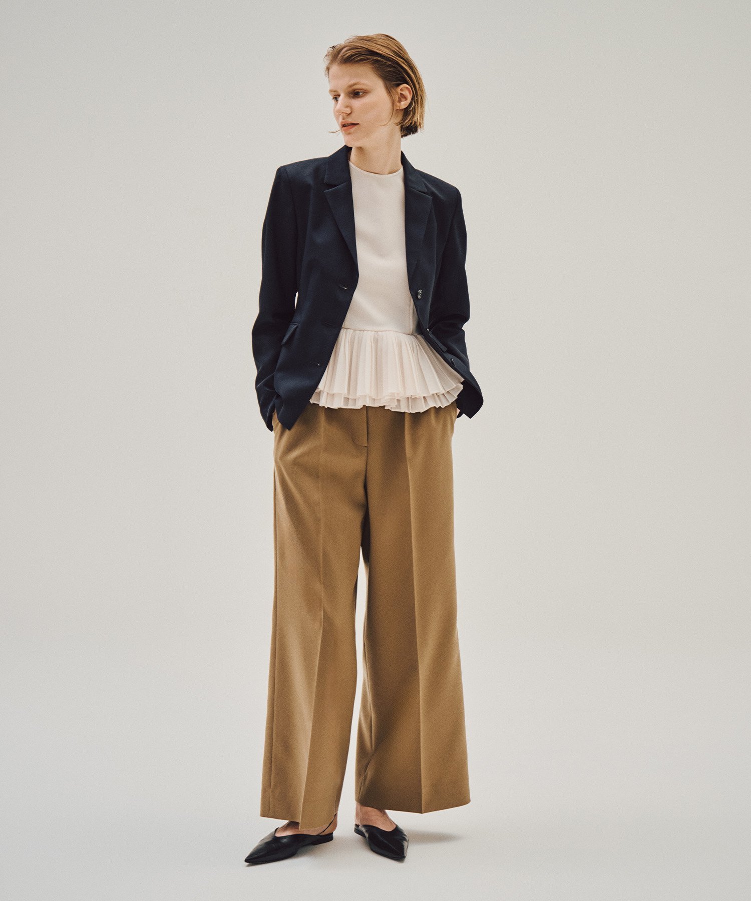 THE COLUMN: Элитная линия одежды COLUMN «THE COLUMN» предлагает интеллектуальный и элегантный образ для любого случая. Хотя в основе лежит базовый стиль, эти вещи подчеркивают очарование женщин, живущих в наше время. Этот приталенный жакет изготовлен из гибридного материала, сочетающего сухую текстуру триацетата с плотностью и жесткостью шерсти, что делает его подходящим для всех сезонов. Его гладкость и легкий блеск создают элегантное впечатление. Хотя дизайн может показаться простым на первый взгляд, баска на талии сзади усиливает объемность и женственность, создавая красивый силуэт даже сзади. Эта универсальная вещь идеально подходит для самых разных случаев, от офиса до особых мероприятий. COLUMN: Подобно колоннам, поддерживающим красивое здание, COLUMN — это бренд, ориентированный на современных женщин, с прочной основой и гибкими, изящными изгибами по краям.