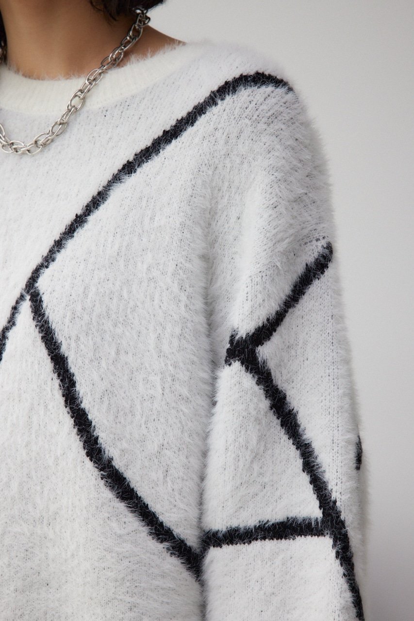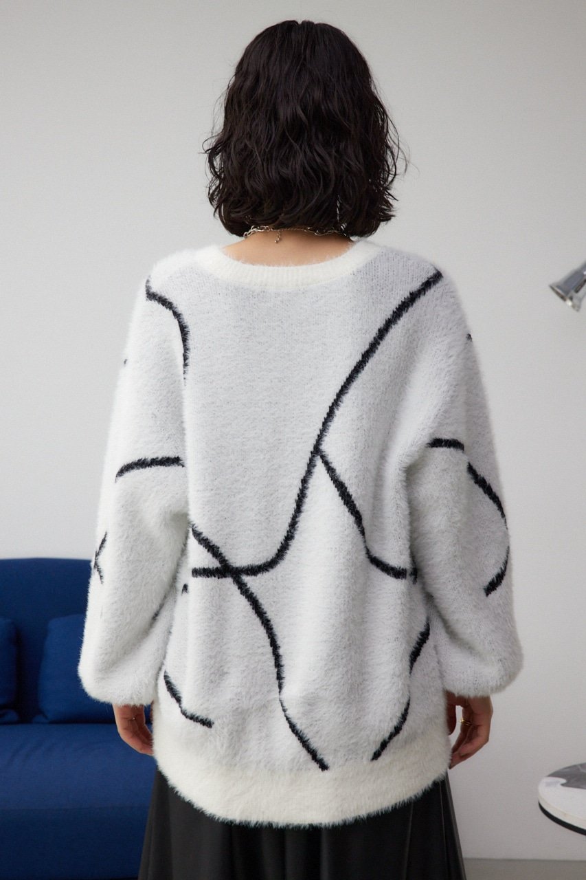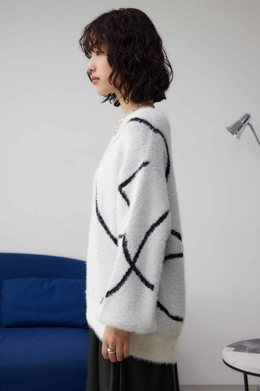 Связана методом двойного жаккарда с использованием длинной, пушистой пряжи типа «перо» и мягкой, пушистой толстой пряжи.