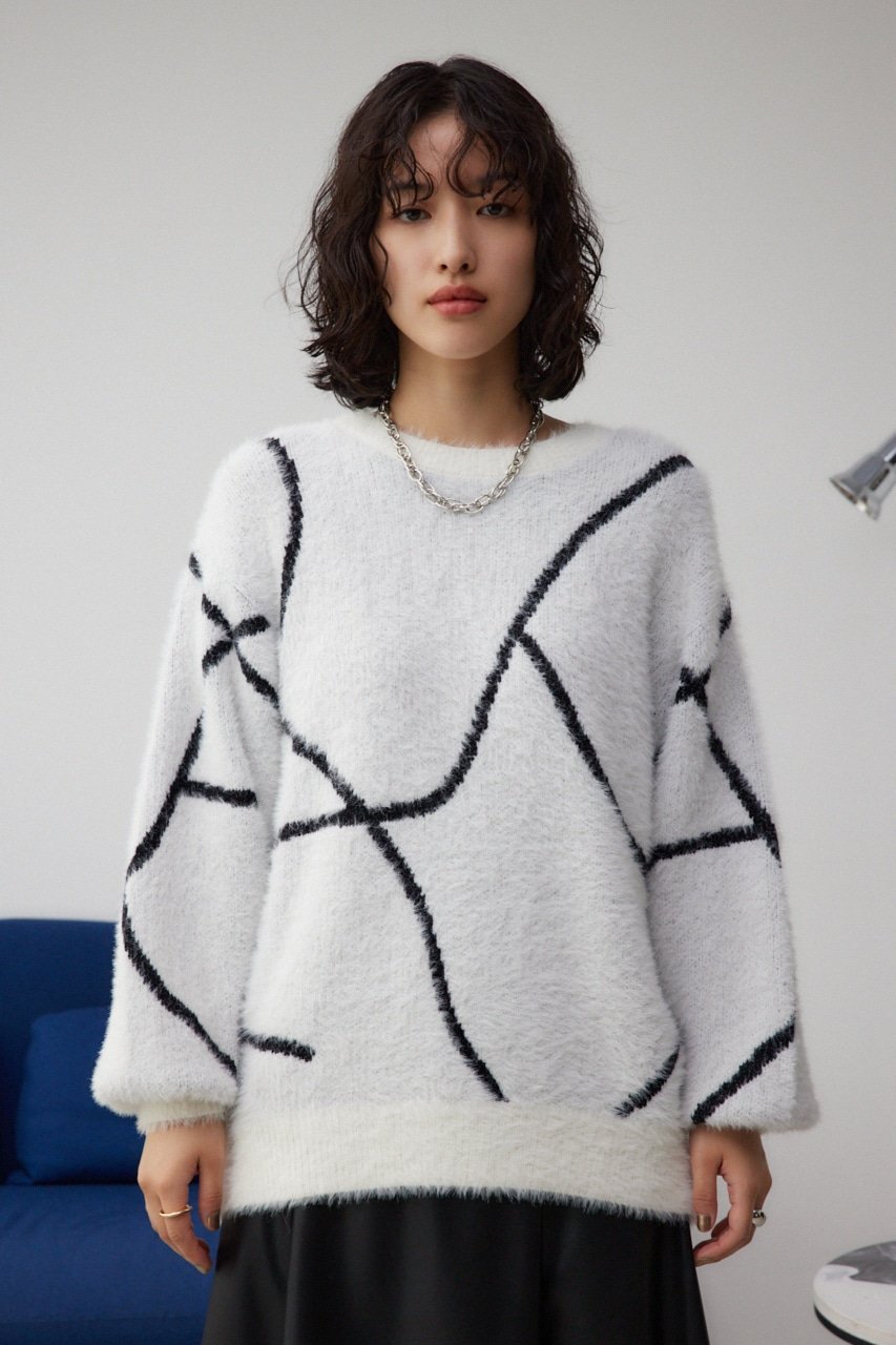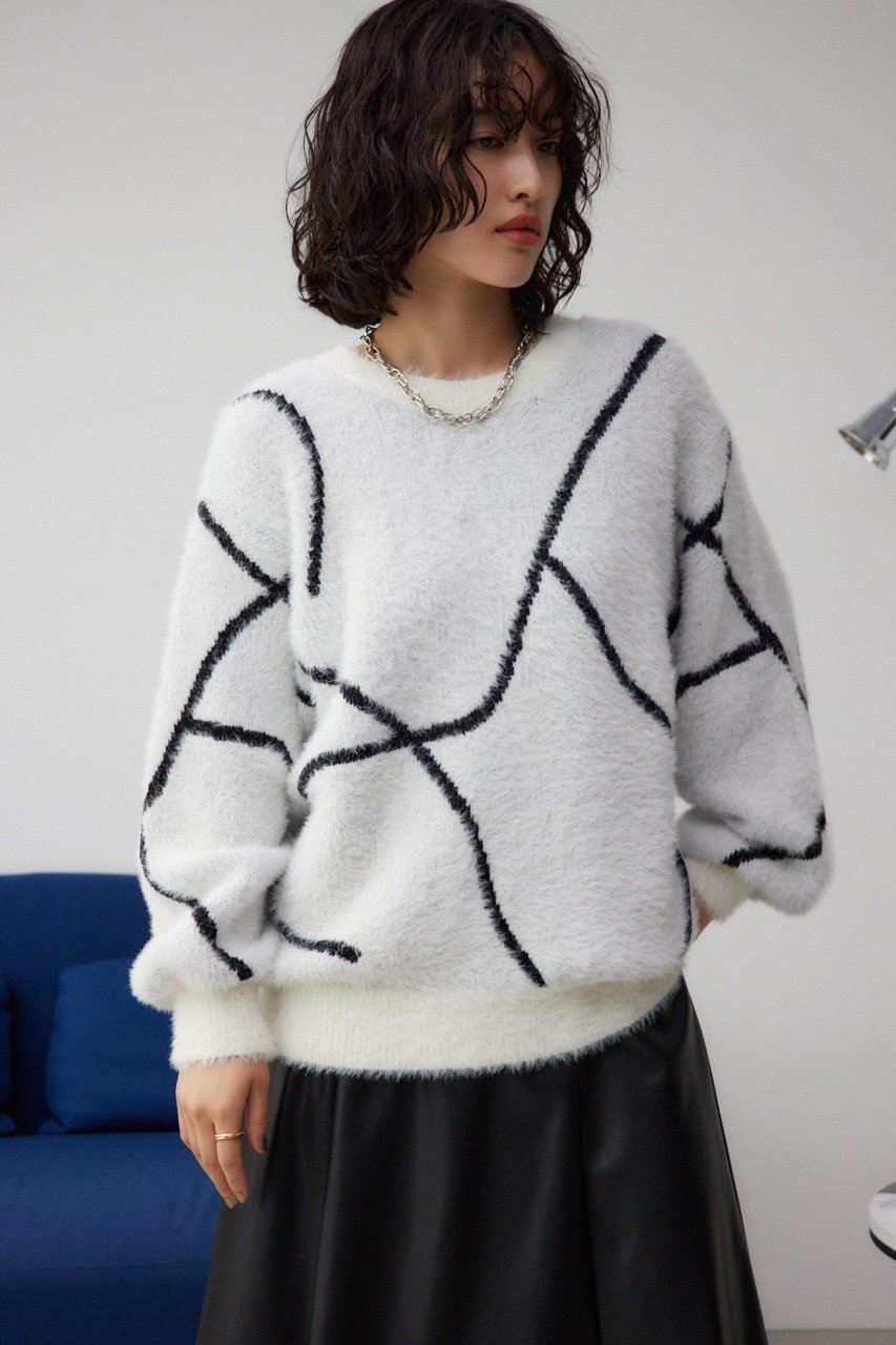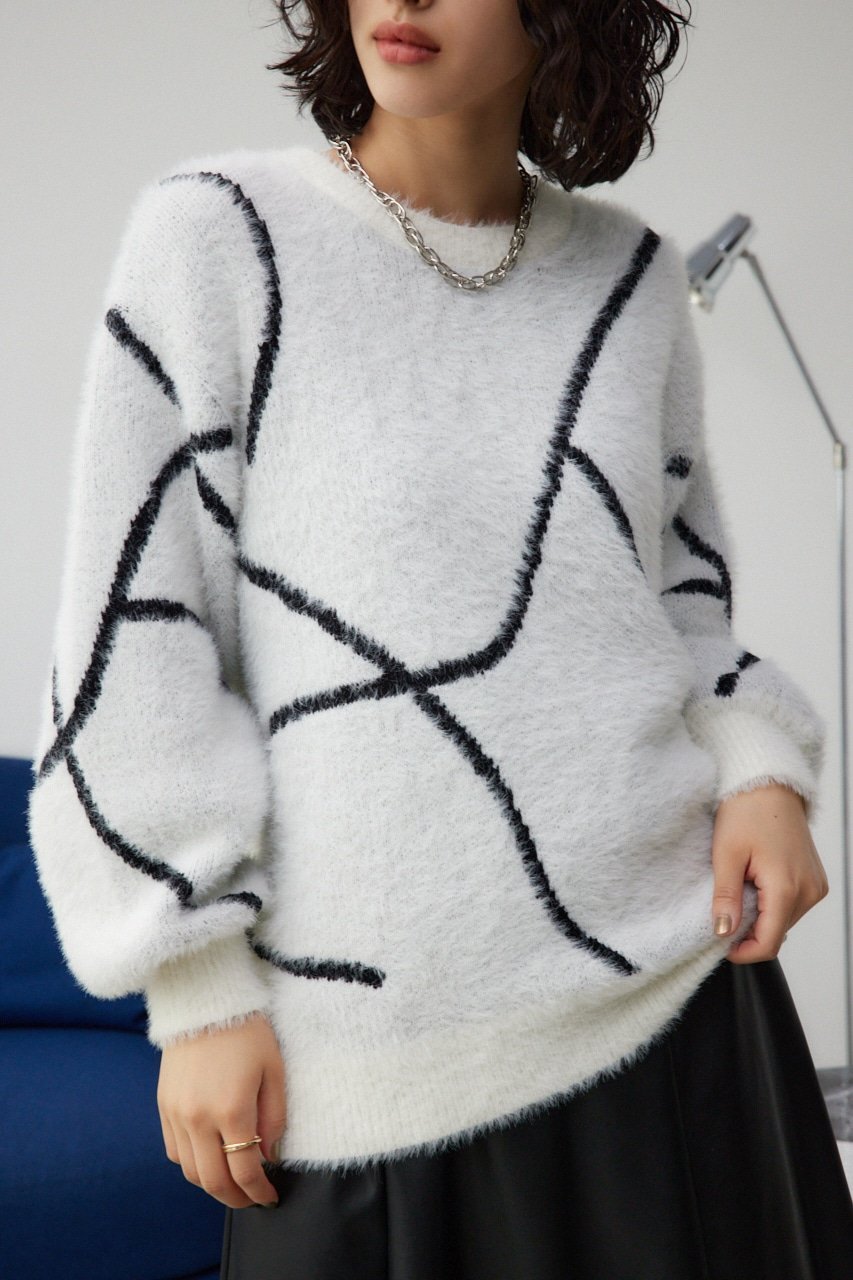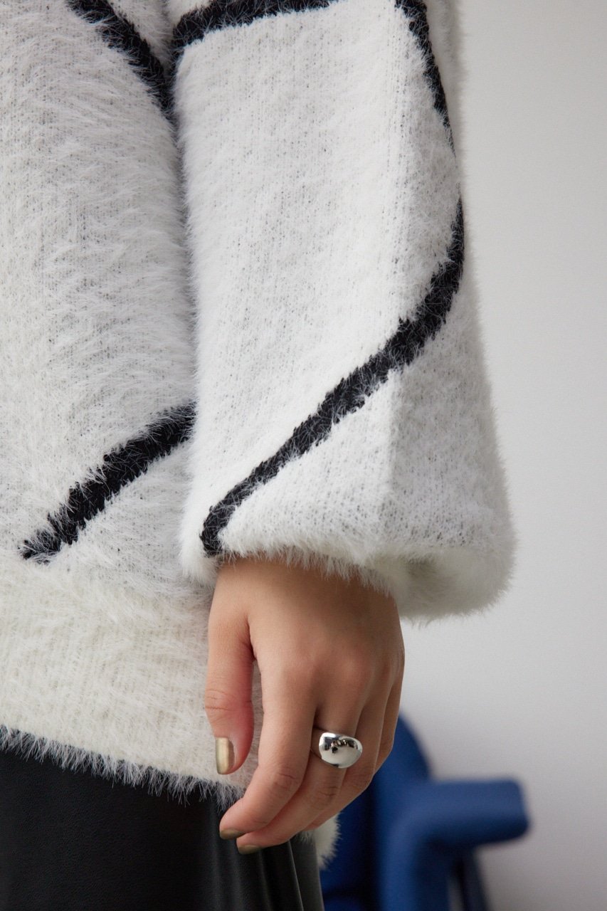 Связана методом двойного жаккарда с использованием длинной, пушистой пряжи типа «перо» и мягкой, пушистой толстой пряжи.
