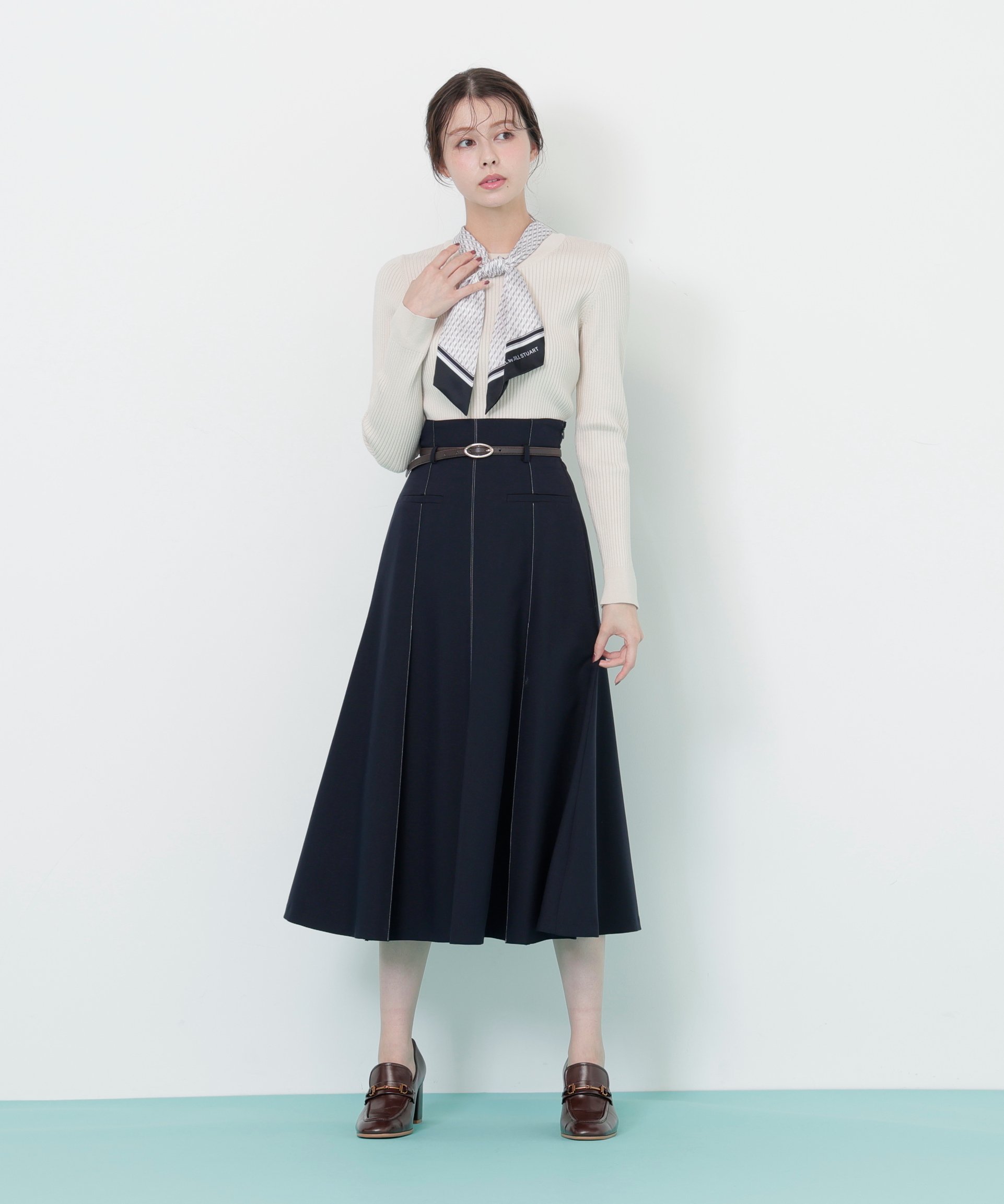 Трикотажный комплект JILL by JILL STUART с оригинальным узорчатым шарфом. Этот оригинальный шарф украшен геометрическим клетчатым узором и логотипом. Сложите шарф вертикально вчетверо, проденьте его через петлю, завяжите и распустите концы для красивого вида. Вынув шарф из задней петли, его также можно использовать как простой шарф-воротник. Он подходит к любым брюкам и юбкам. Рекомендуется темно-синий вариант, так как он сочетает в себе модный зеленый цвет шарфа. *Цвета могут выглядеть по-разному в зависимости от условий освещения во время фотосъемки.