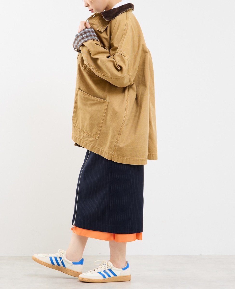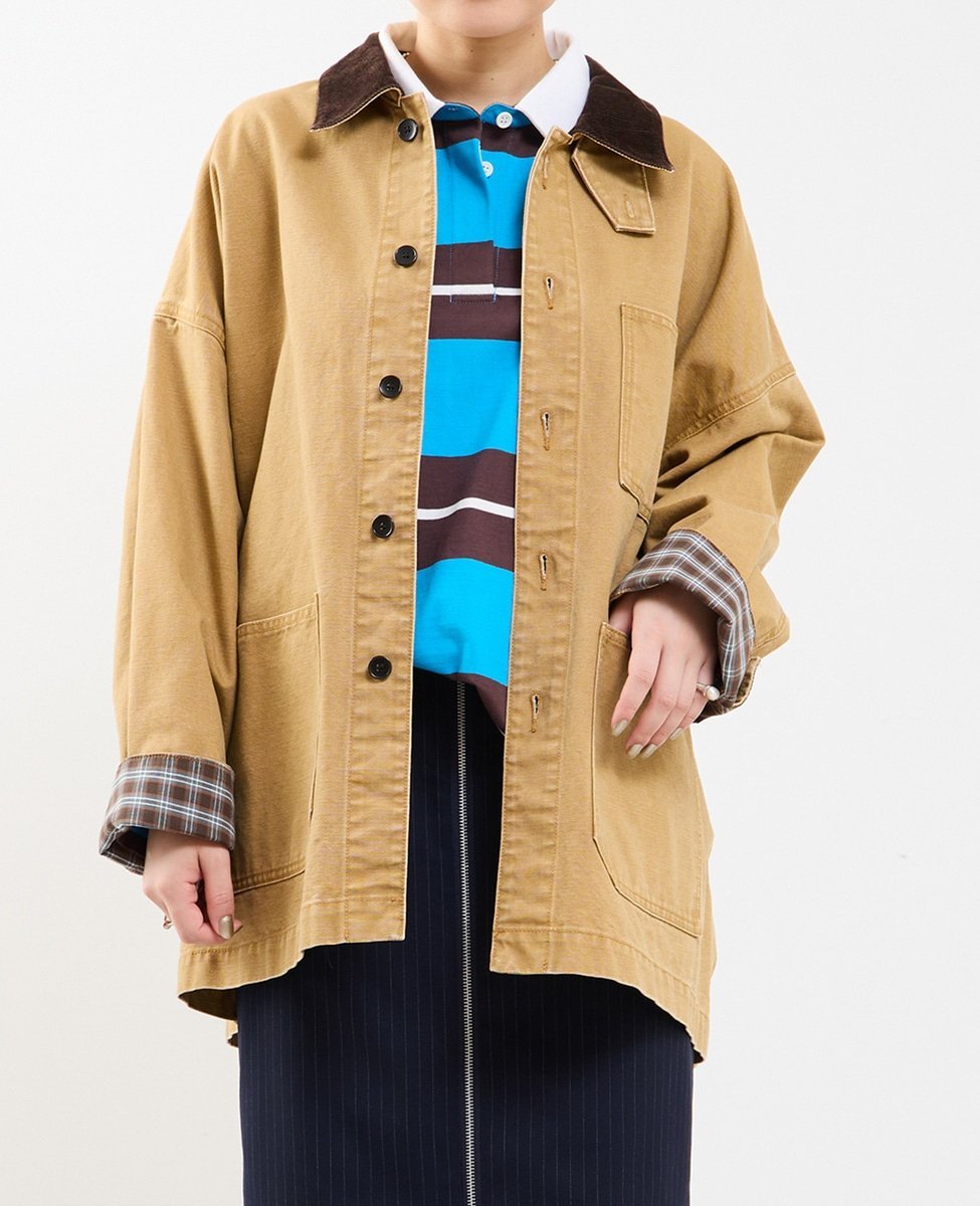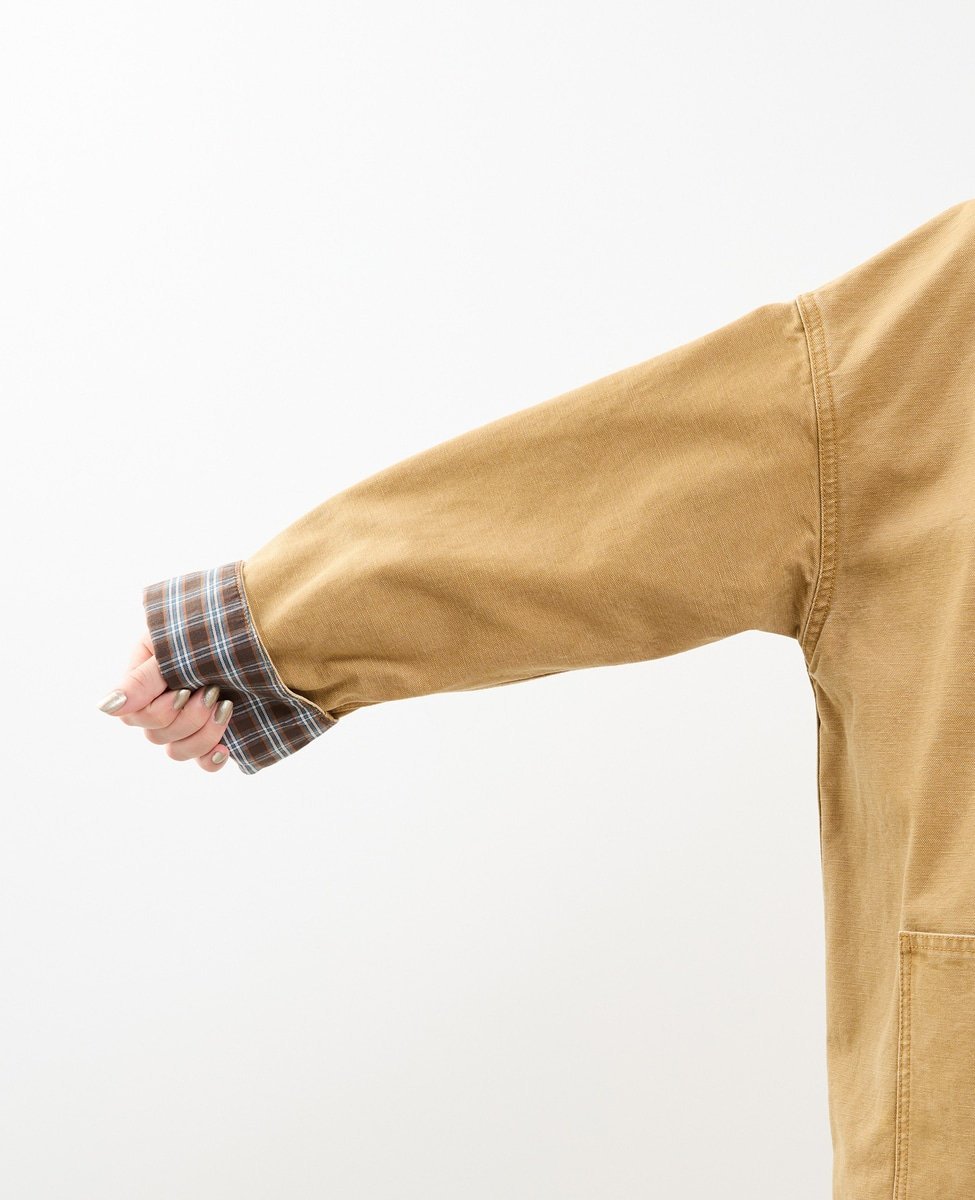 Воротник выполнен из вельвета, а внутренняя сторона манжет — из клетчатой ткани,