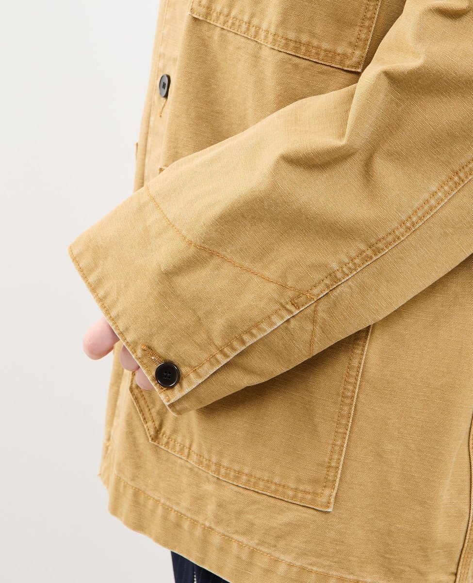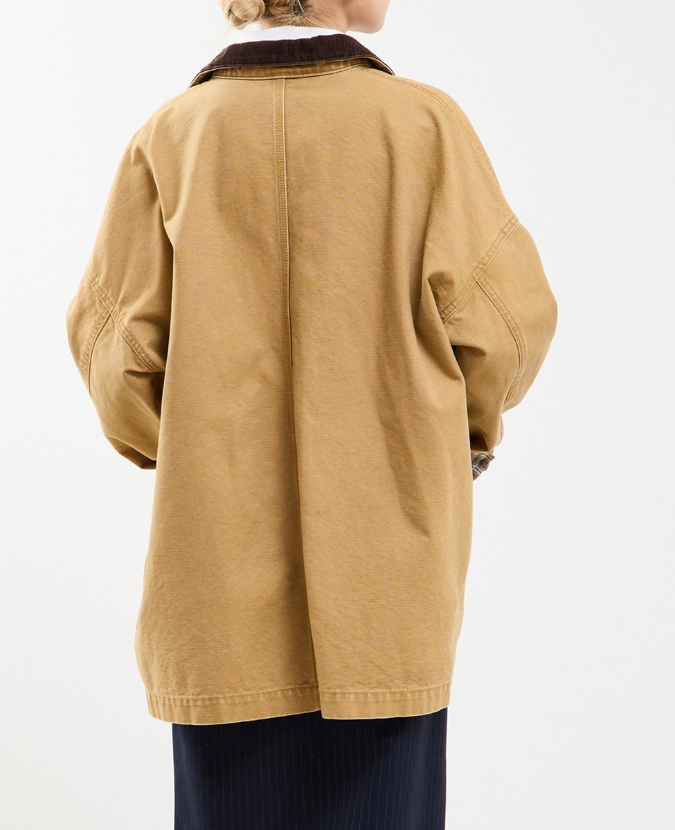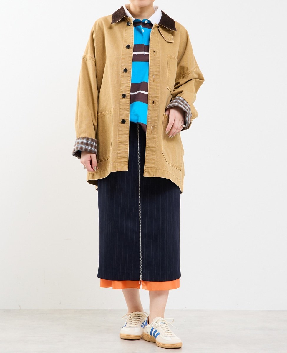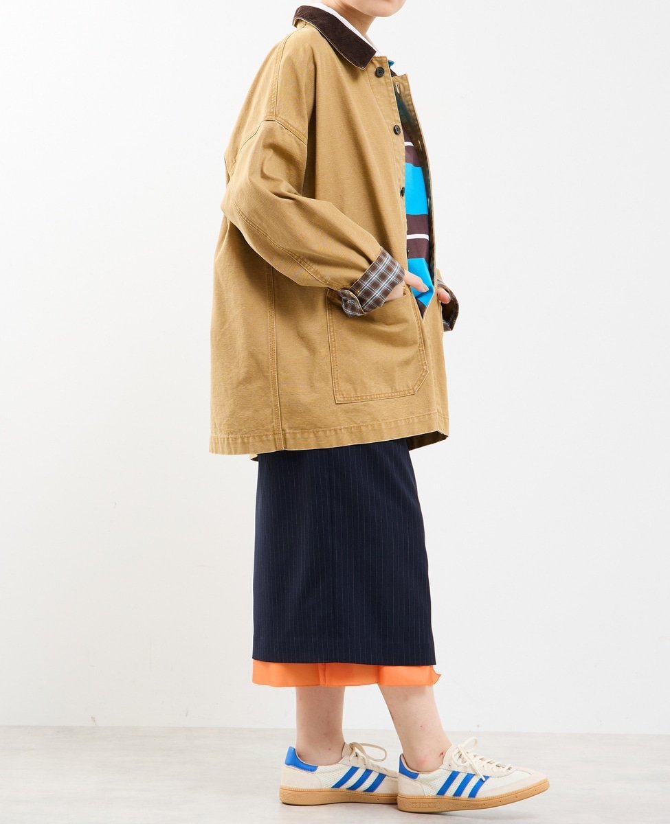Воротник выполнен из вельвета, а внутренняя сторона манжет — из клетчатой ткани,