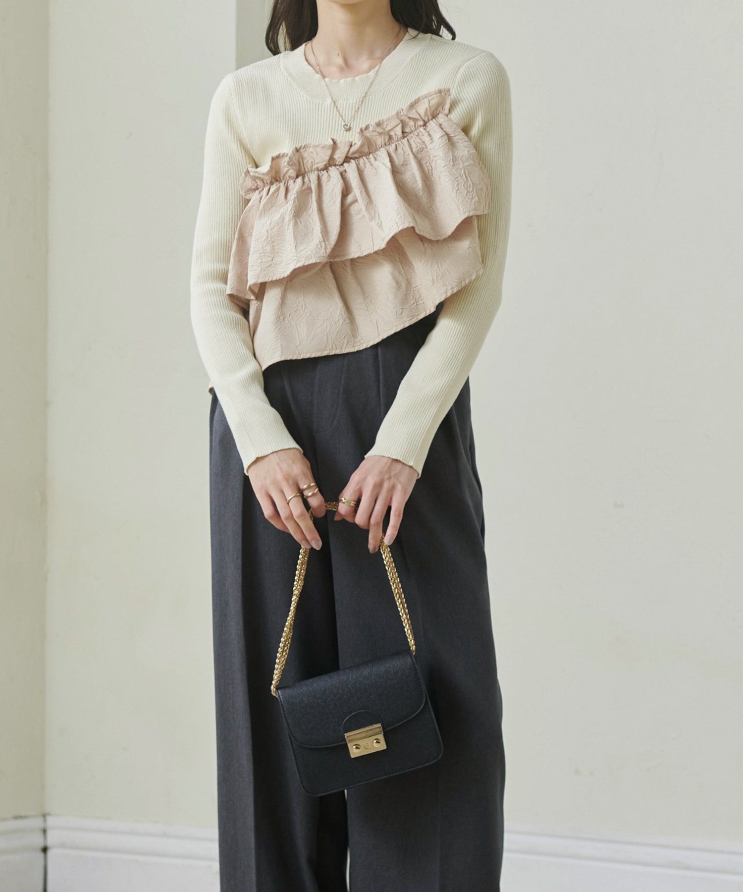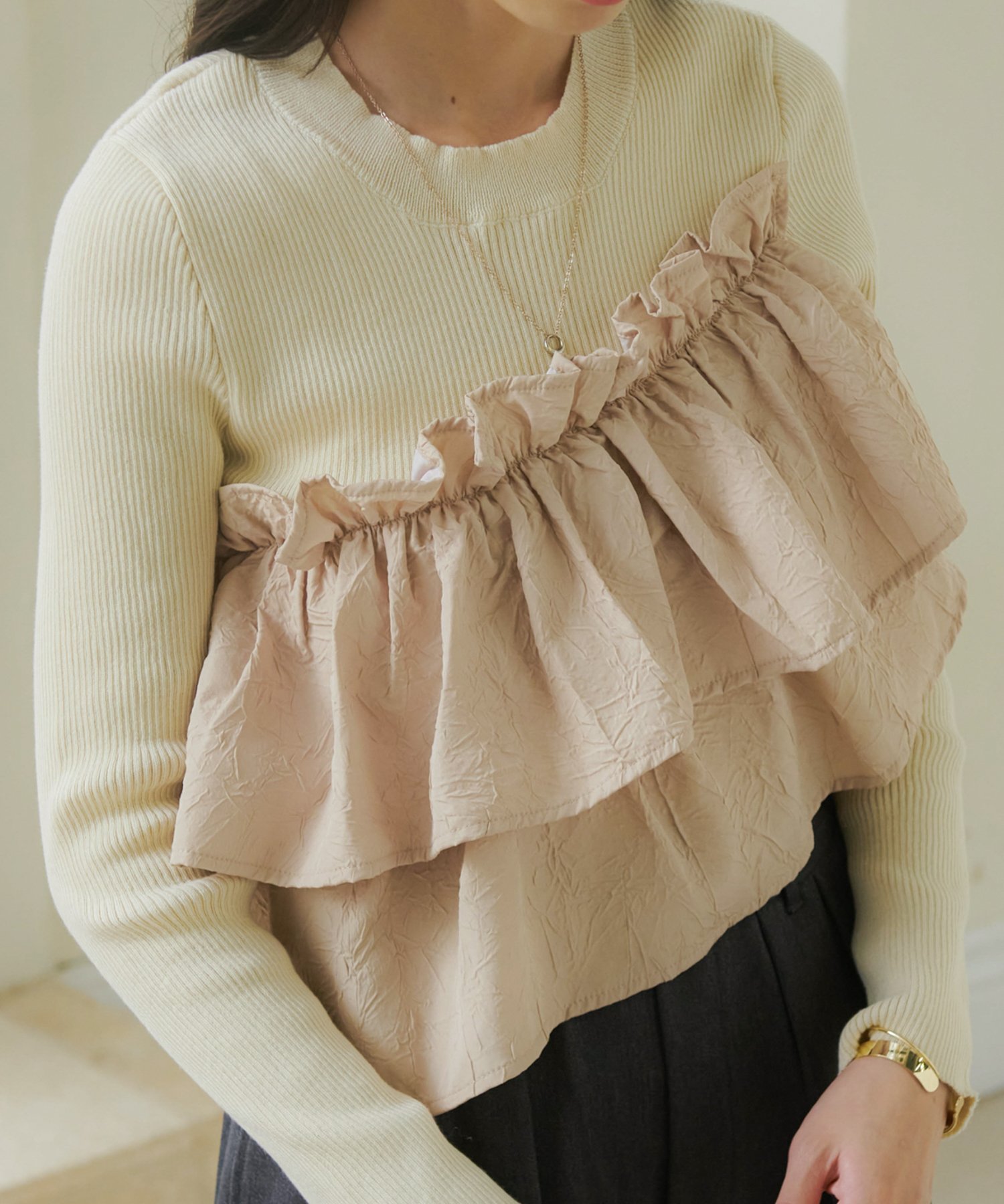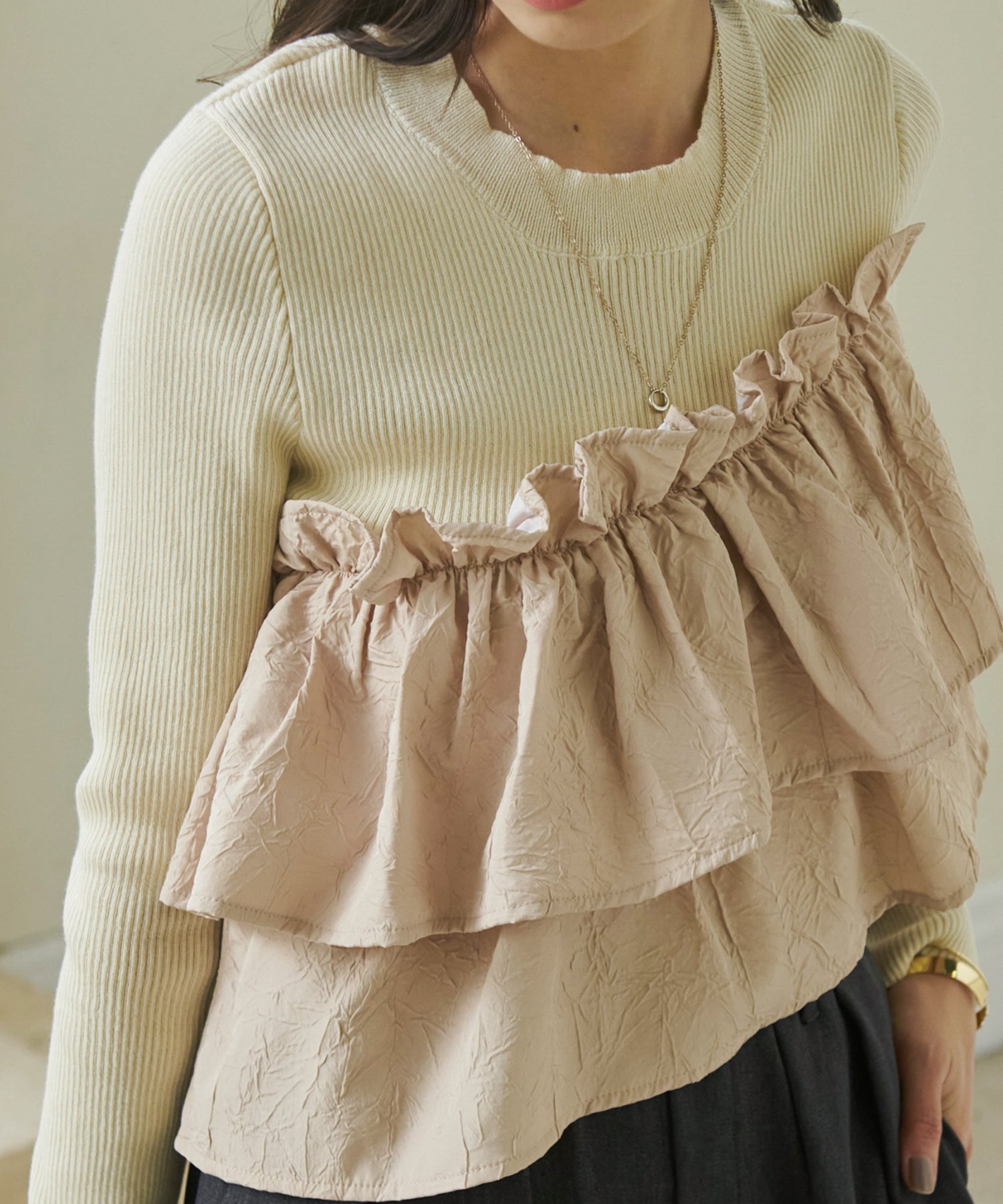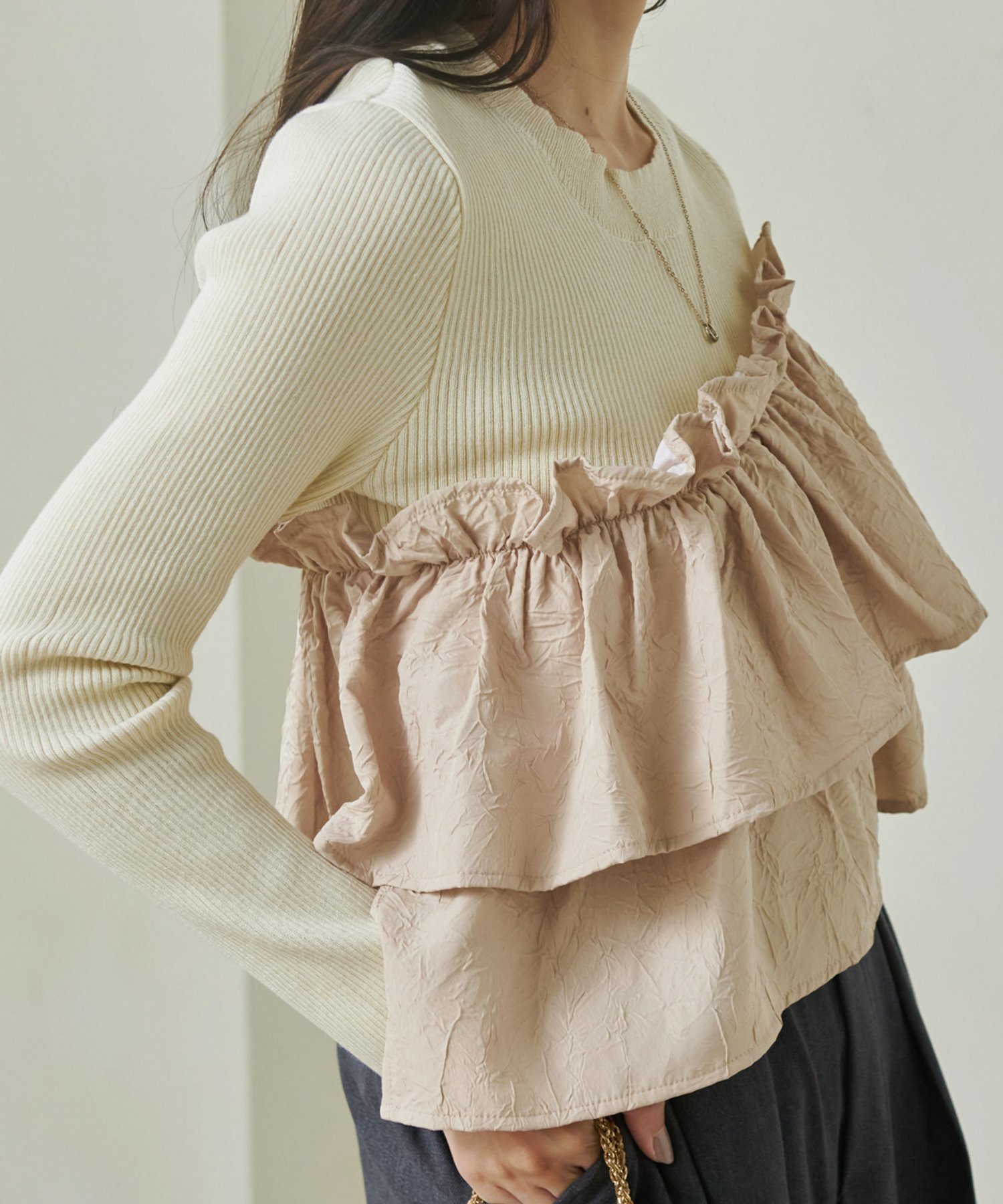 Сочетание мягкой ребристой вязки и ткани с оборками.