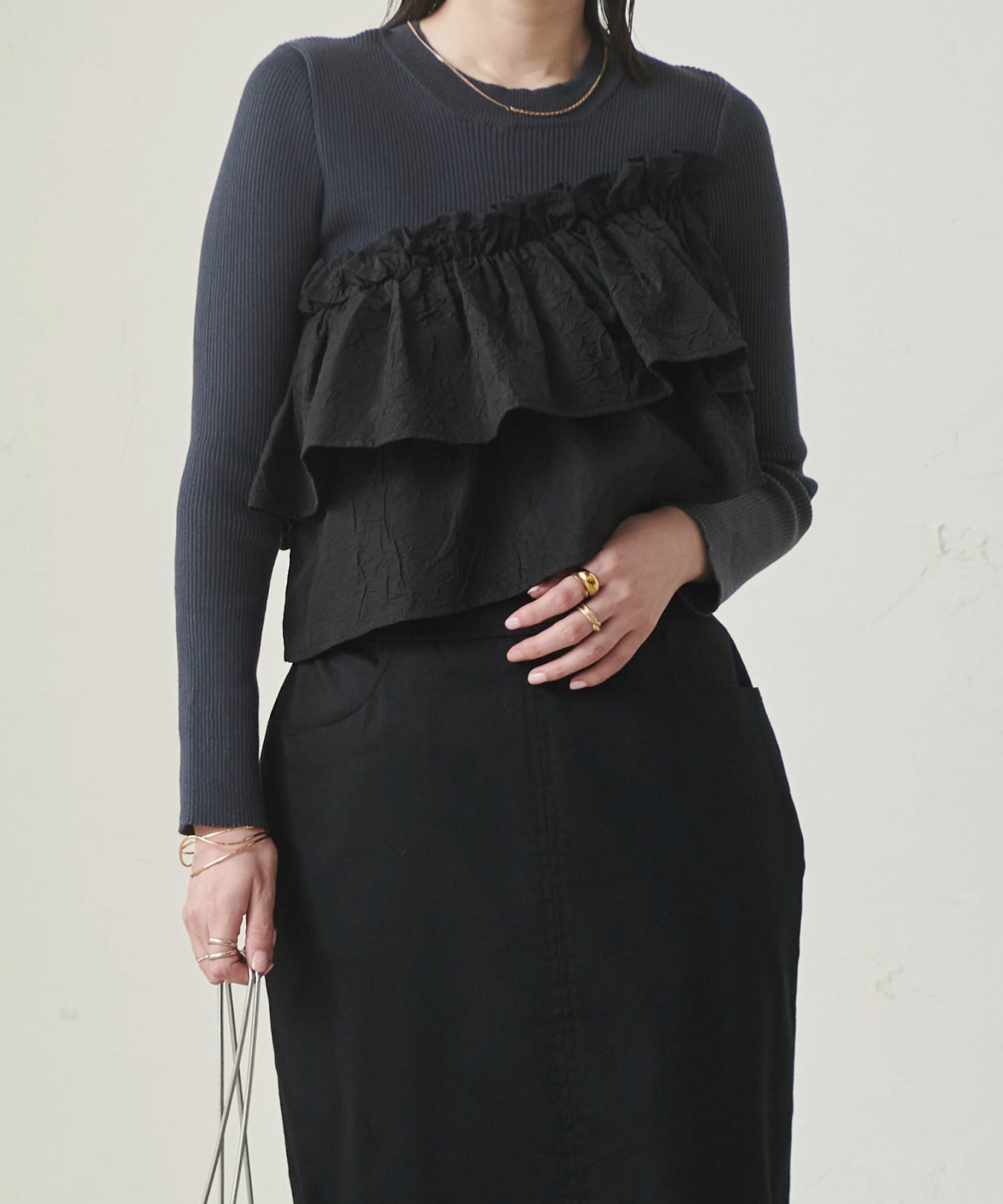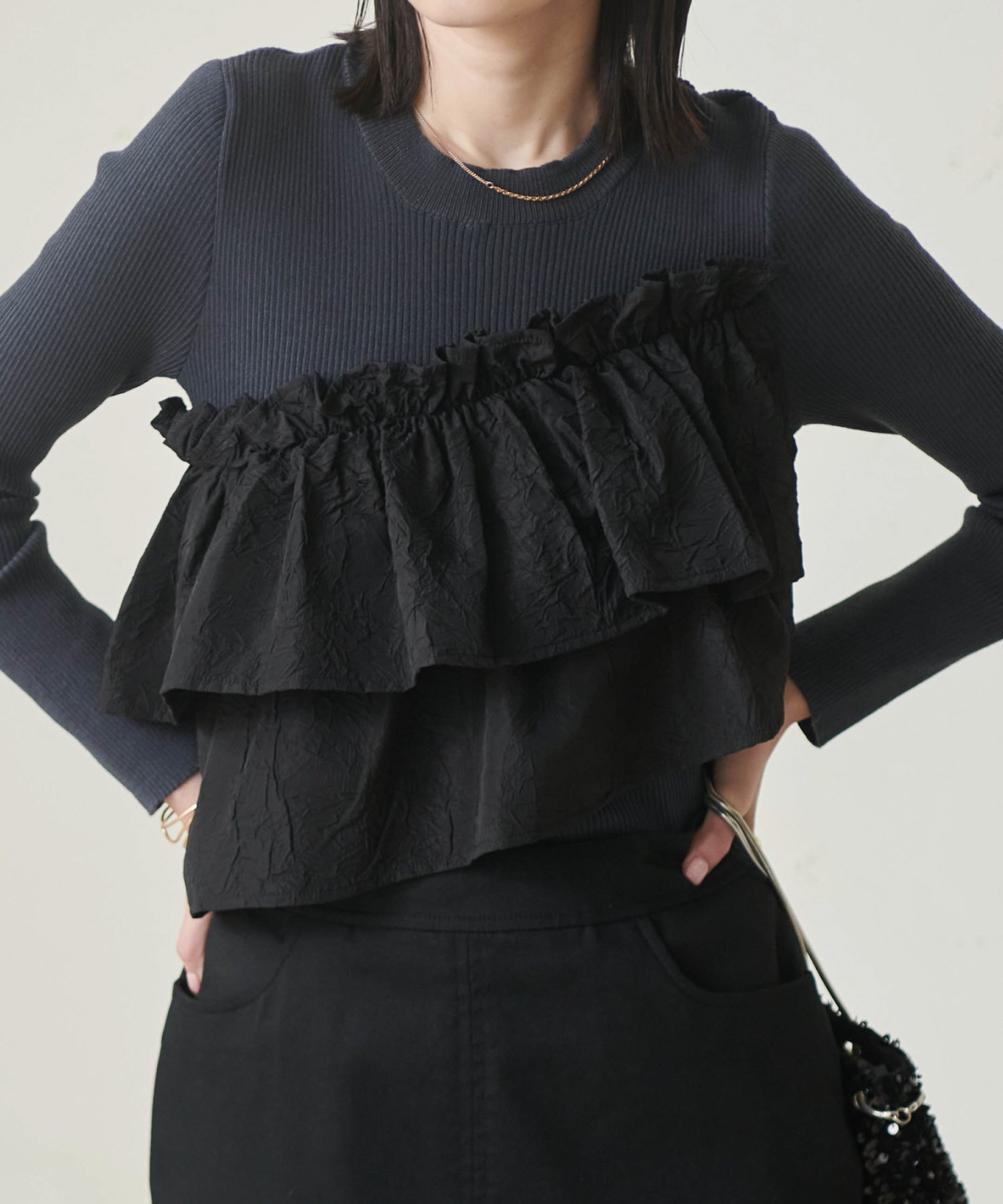 Сочетание мягкой ребристой вязки и ткани с оборками.