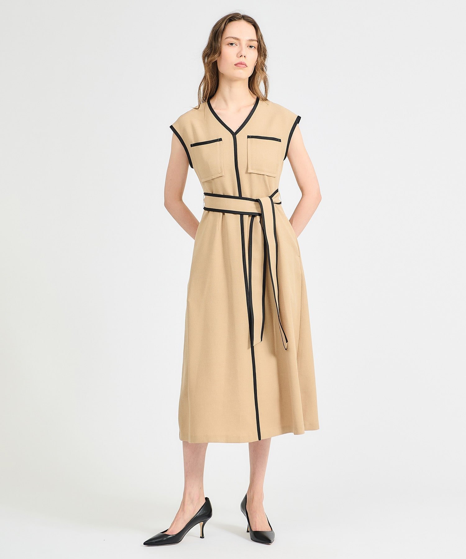 Платье с V-образным вырезом, визуально стройнящее фигуру.
