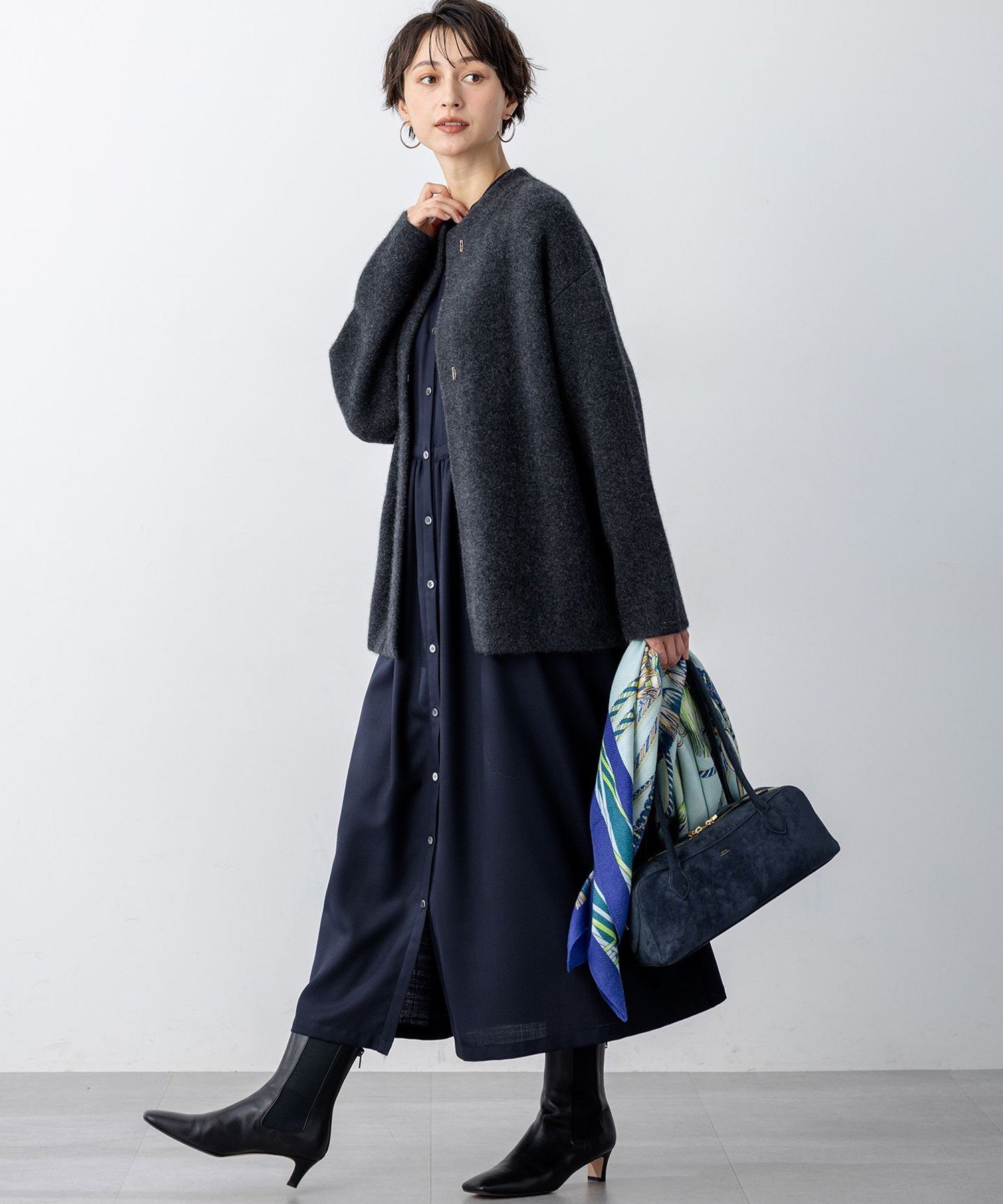 Эта вязаная верхняя одежда выполнена из склеенной вязки. Внешний слой изготовлен из шерсти енота, а внутренний — из легкого полиэстера. Это предотвращает прилипание меха к нижнему белью и позволяет легко надевать и снимать рукава. Элегантный воротник облегает вырез горловины, создавая слегка коконный силуэт, а длина закрывает бедра. Глубокий передний вырез отлично смотрится как в расстегнутом, так и в застегнутом на крючок виде, что позволяет создавать множество вариантов стилизации. Встроенные карманы удобны для хранения мелких предметов. Доступна в четырех цветах: мягкий слоновый (#002), серый (#004), который добавит глубины вашему образу, натуральный бежевый (#033) и светло-голубой (#072), который добавит нотку изысканности.