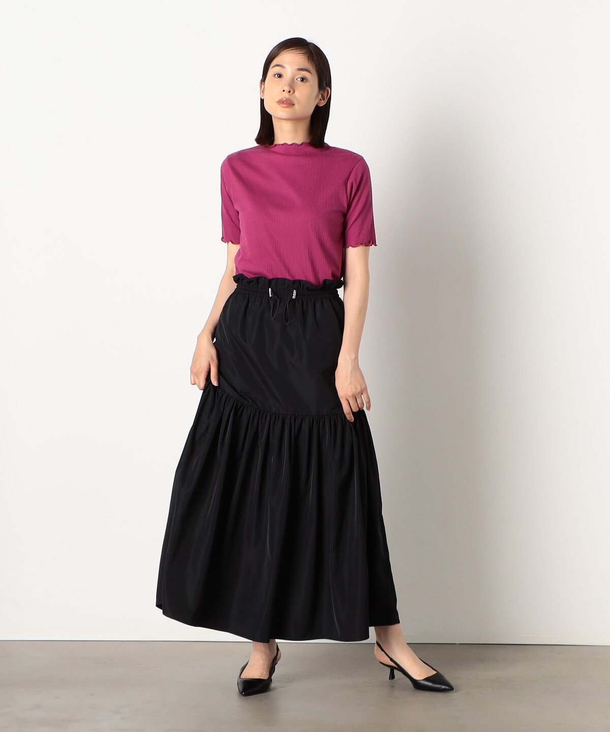 Вырез горловины — лодочка, что облегчает создание различных образов.