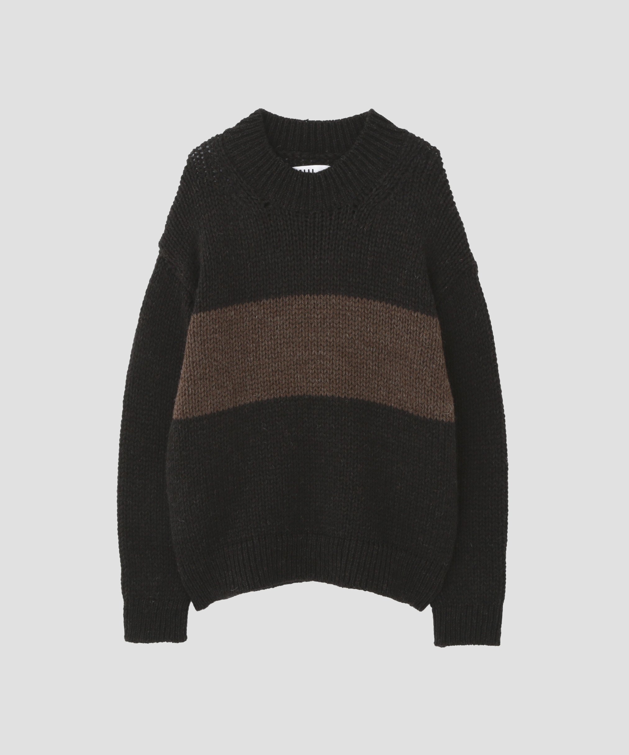 Этот трикотаж низкой плотности имеет графическую коричневую полосу на черном фоне, излучая тепло ручной вязки, в то время как свободный крой уравновешивается приспущенными плечами. Несмотря на свой внешний вид, он легкий и удобный в носке, и является изделием, подчеркивающим технологию Yonetomi Seni по раскрытию текстуры пряжи.