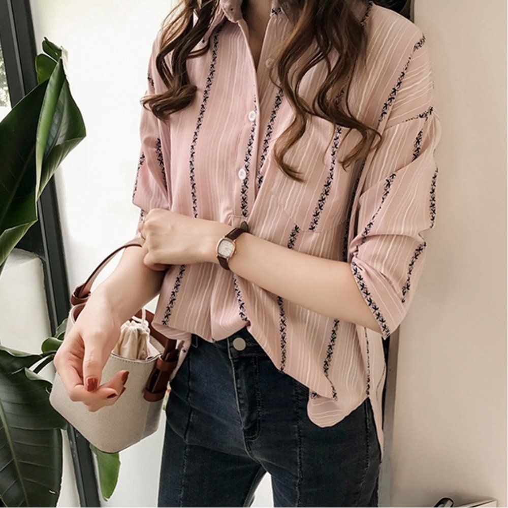 Эта полосатая блузка-рубашка с рукавами 3/4 и V-образным вырезом приятна на ощупь.