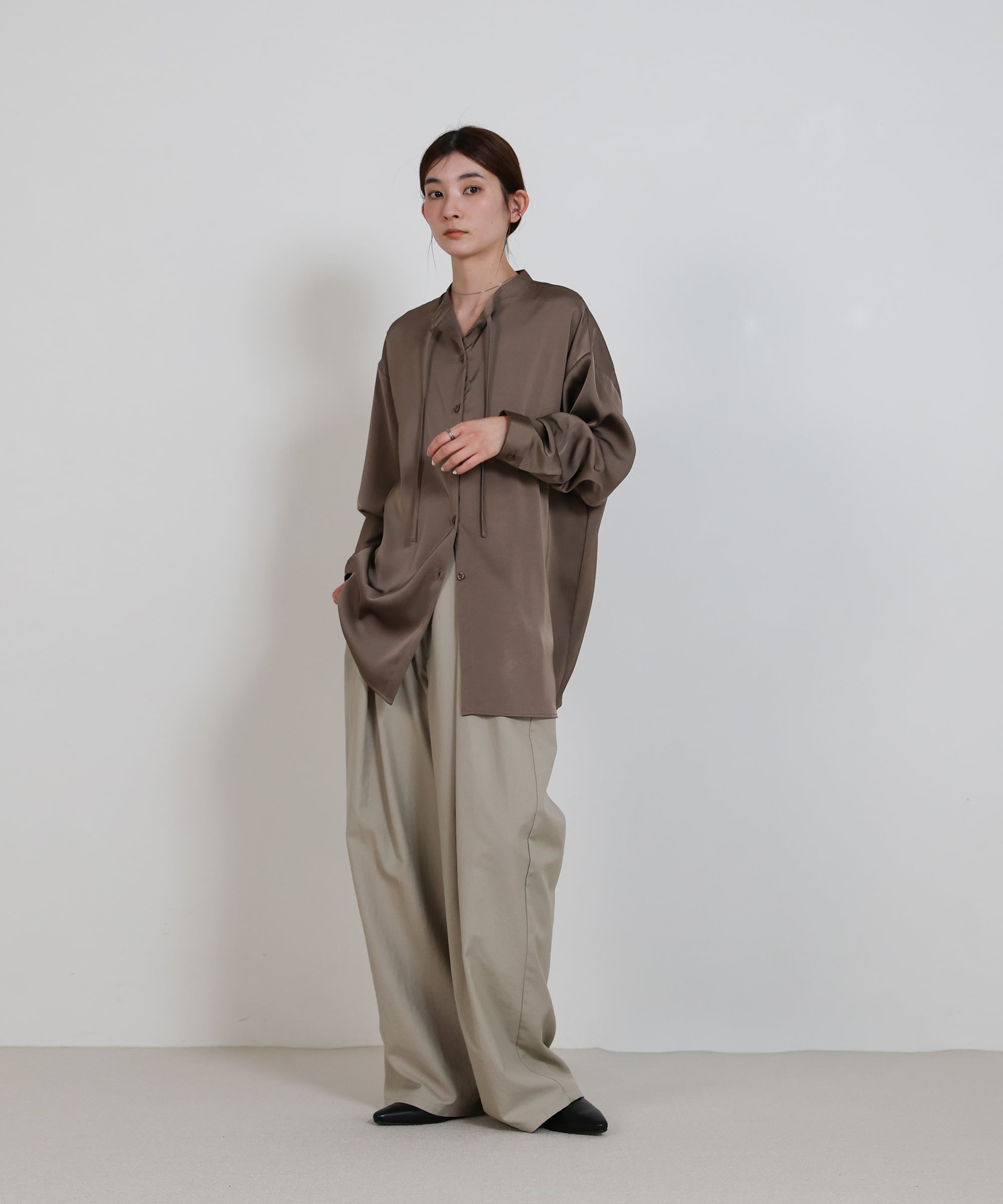 Вертикальная драпировка и слегка свободный крой создают изысканный, непринужденный образ.