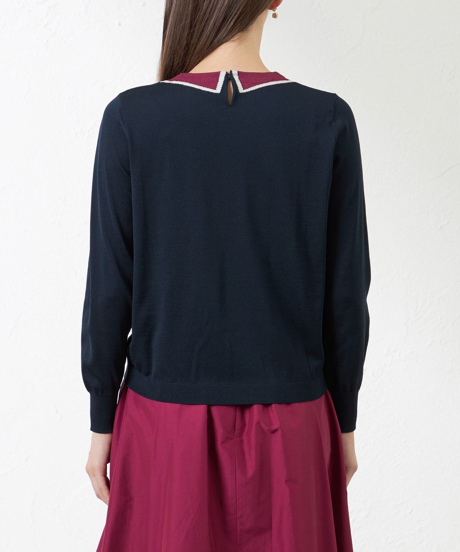 Пуловер с эффектом обманчивой перспективы и контрастным по цвету воротником, связанным интарсией.