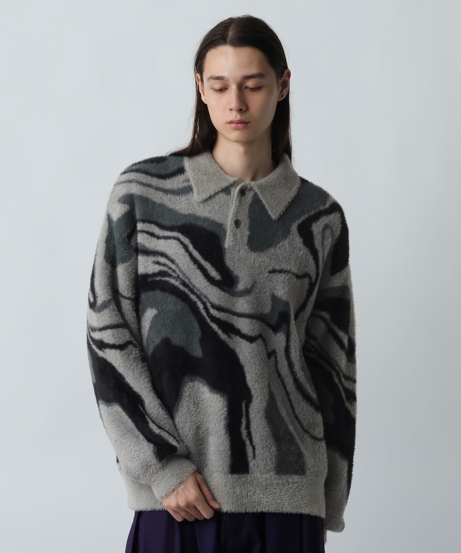 Этот вязаный пуловер сочетает в себе модный силуэт поло с мраморным принтом, что делает его эффектным элементом гардероба.