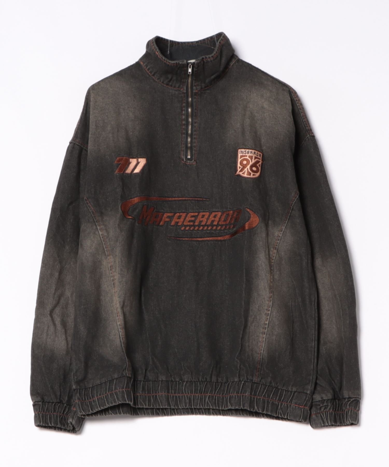Эта вещь выполнена из джинсовой ткани с привлекательной винтажной обработкой и вышивкой в гоночном стиле.