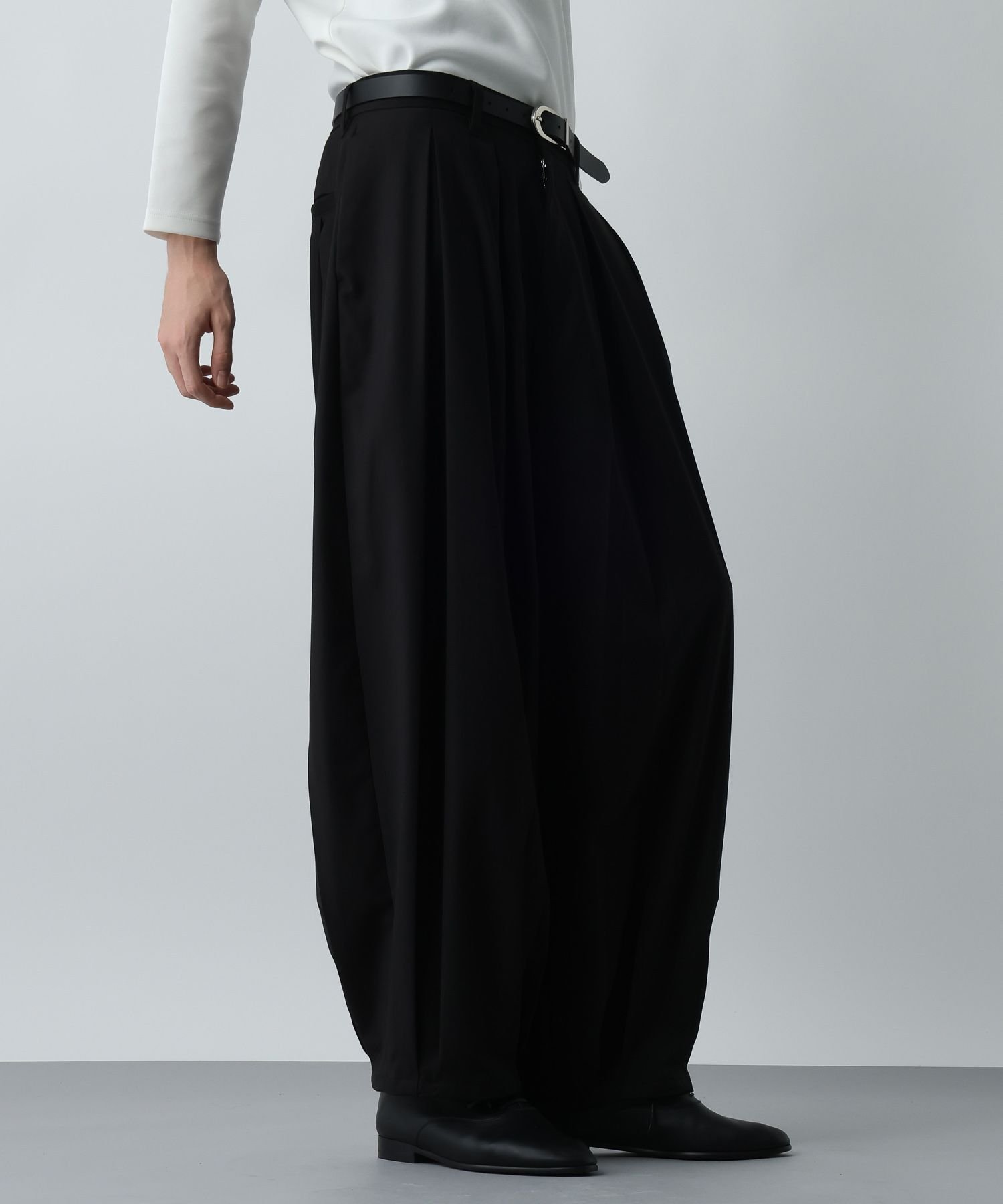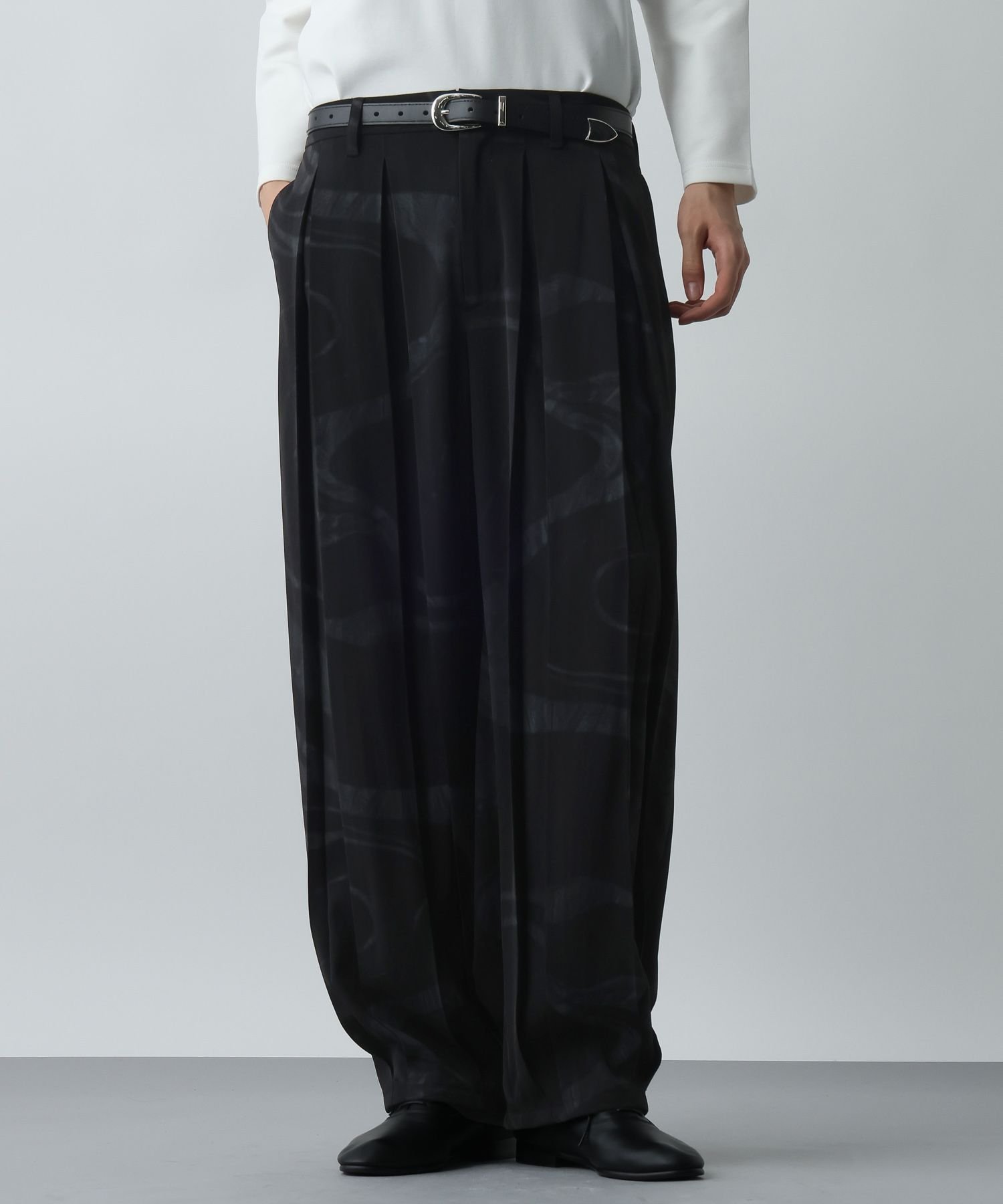Ткань обладает оптимальной плотностью и драпировкой, что дополнительно подчеркивает тени от складок и красиво выделяет их. Эластичный полиуретановый материал обеспечивает свободу движений, несмотря на широкий силуэт, гарантируя комфортную посадку.