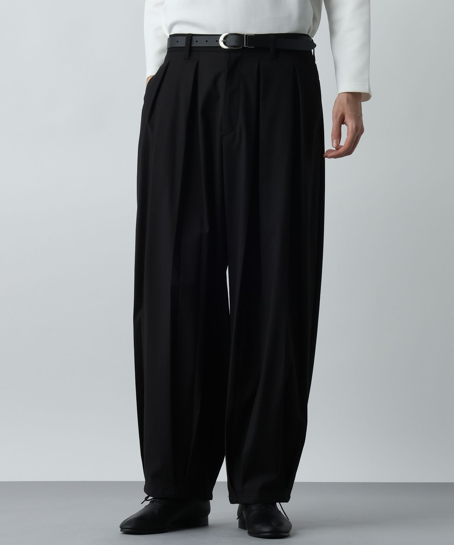 Ткань обладает оптимальной плотностью и драпировкой, что дополнительно подчеркивает тени от складок и красиво выделяет их. Эластичный полиуретановый материал обеспечивает свободу движений, несмотря на широкий силуэт, гарантируя комфортную посадку.