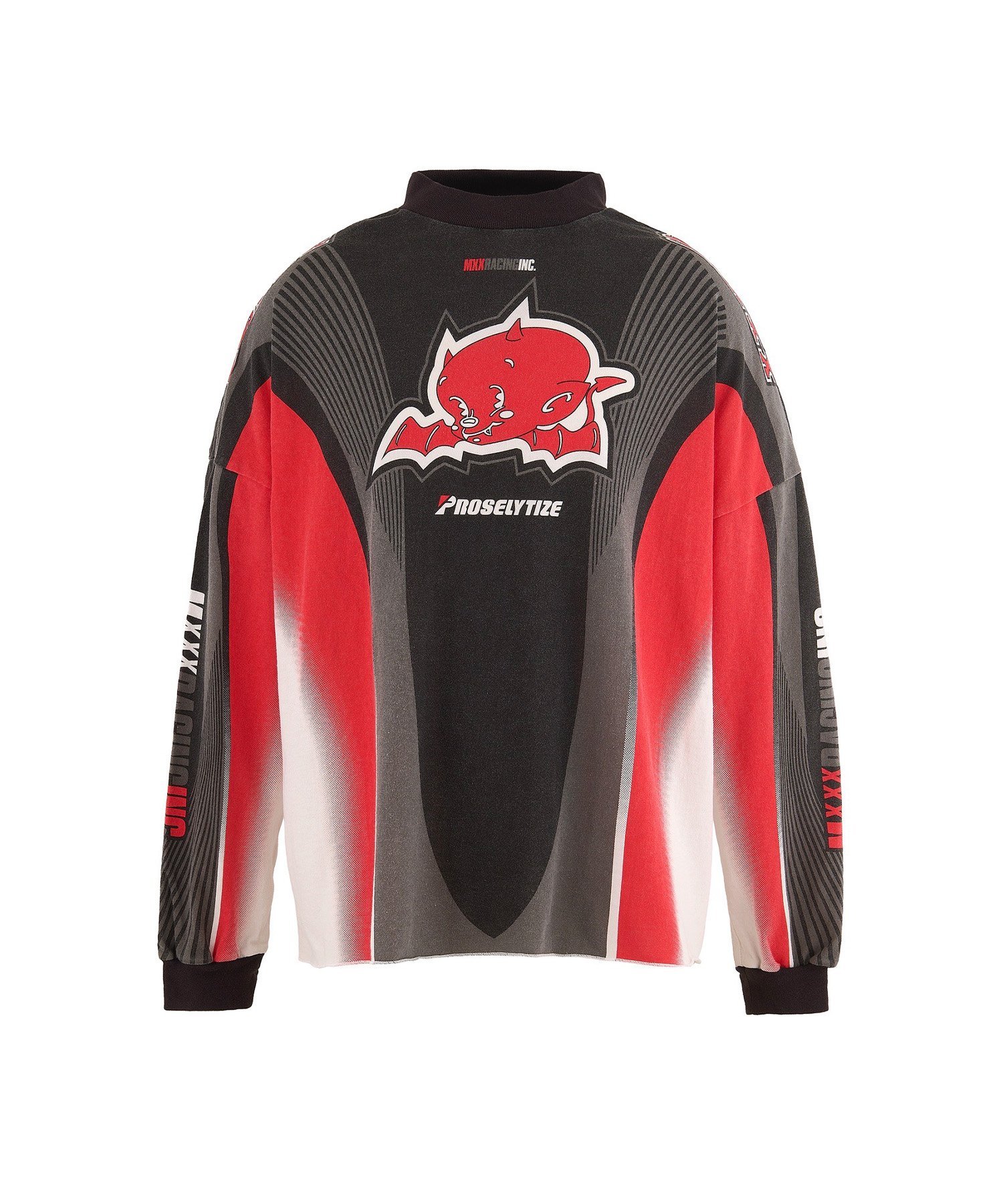 Спортивный дизайн с ярким красным принтом в виде дьявола и логотипом на корпусе и рукавах.