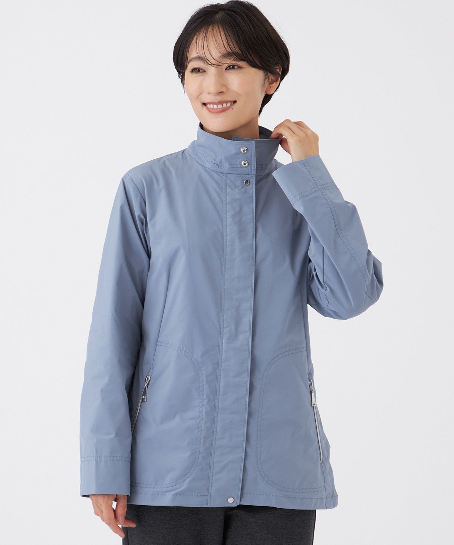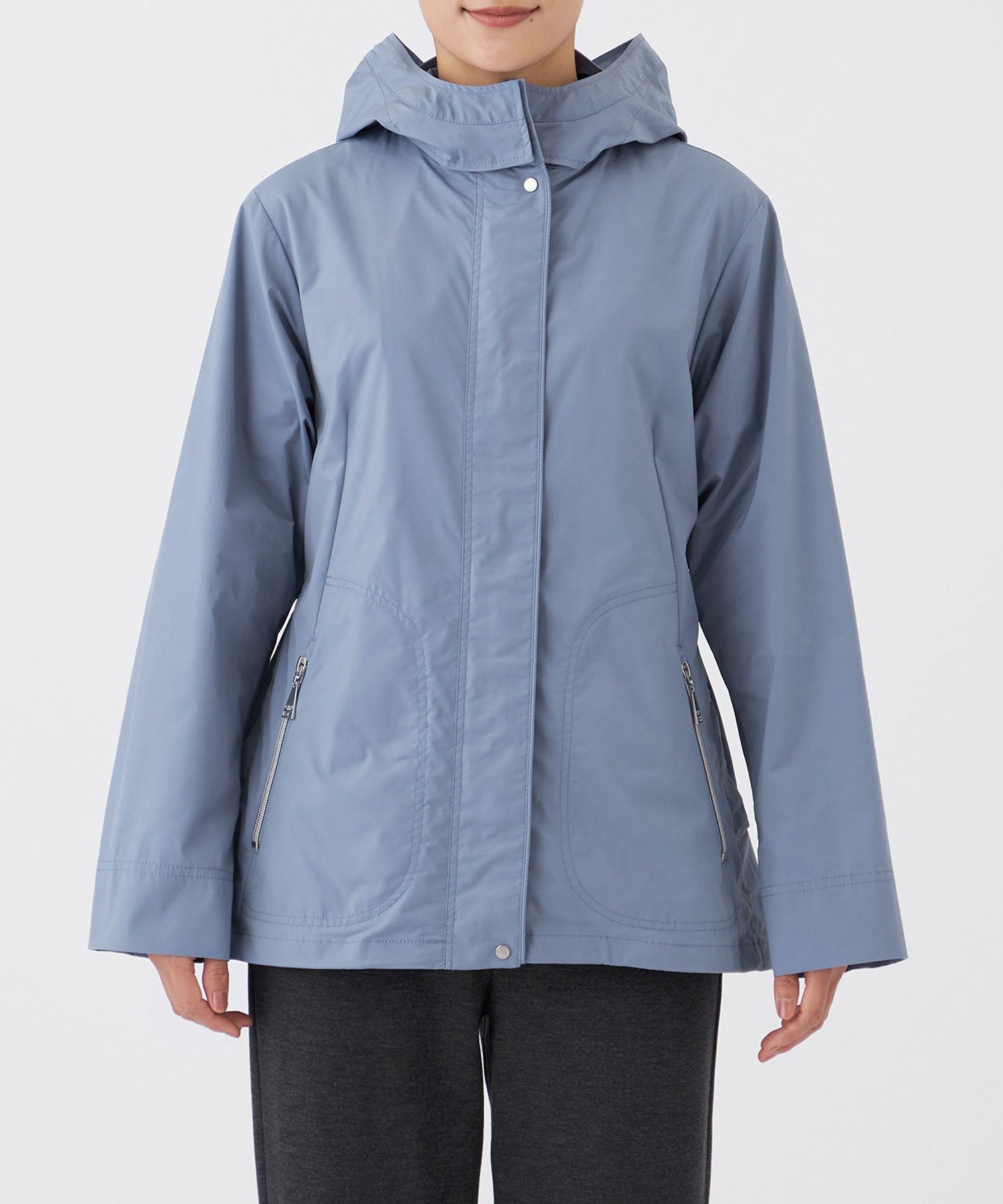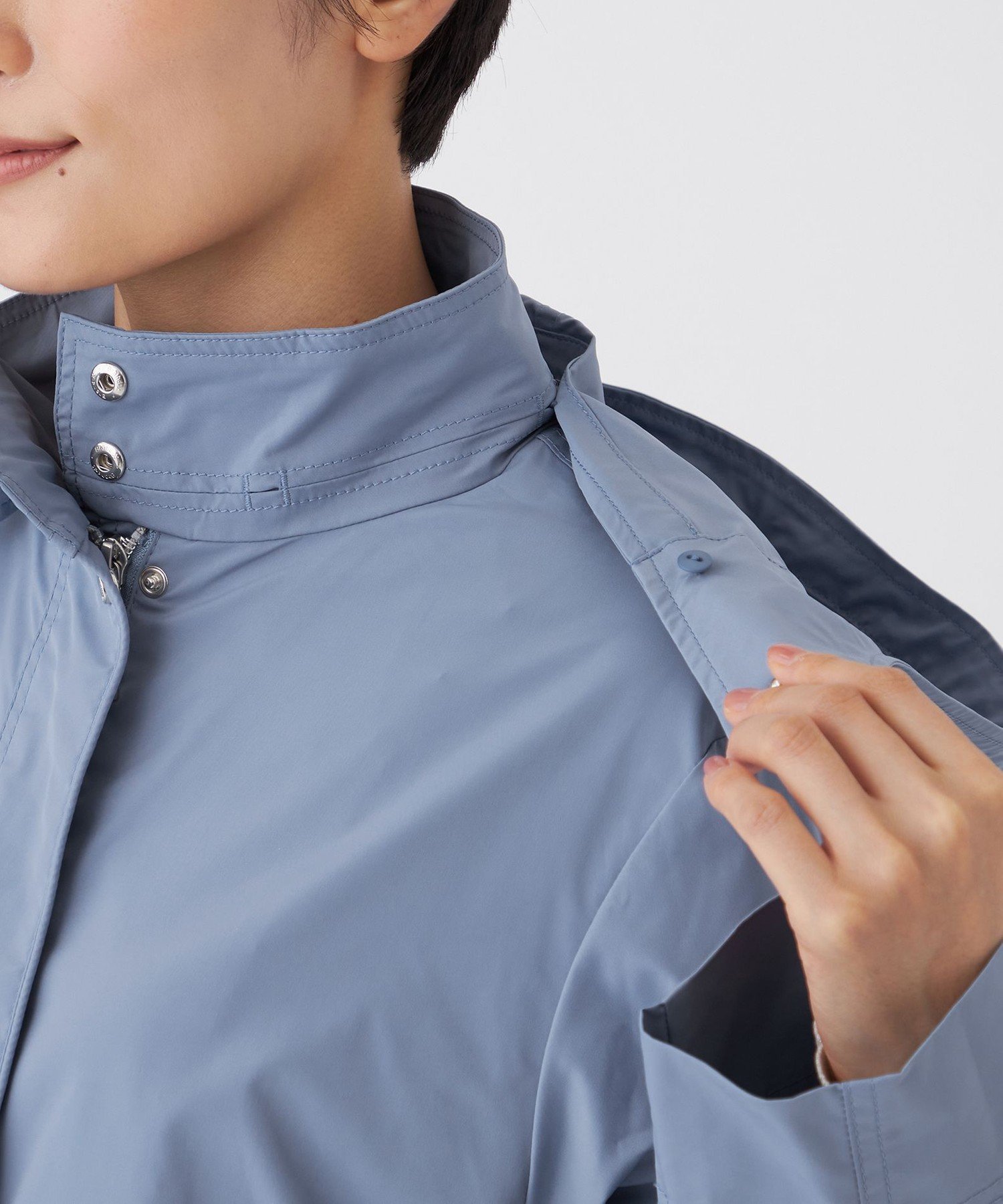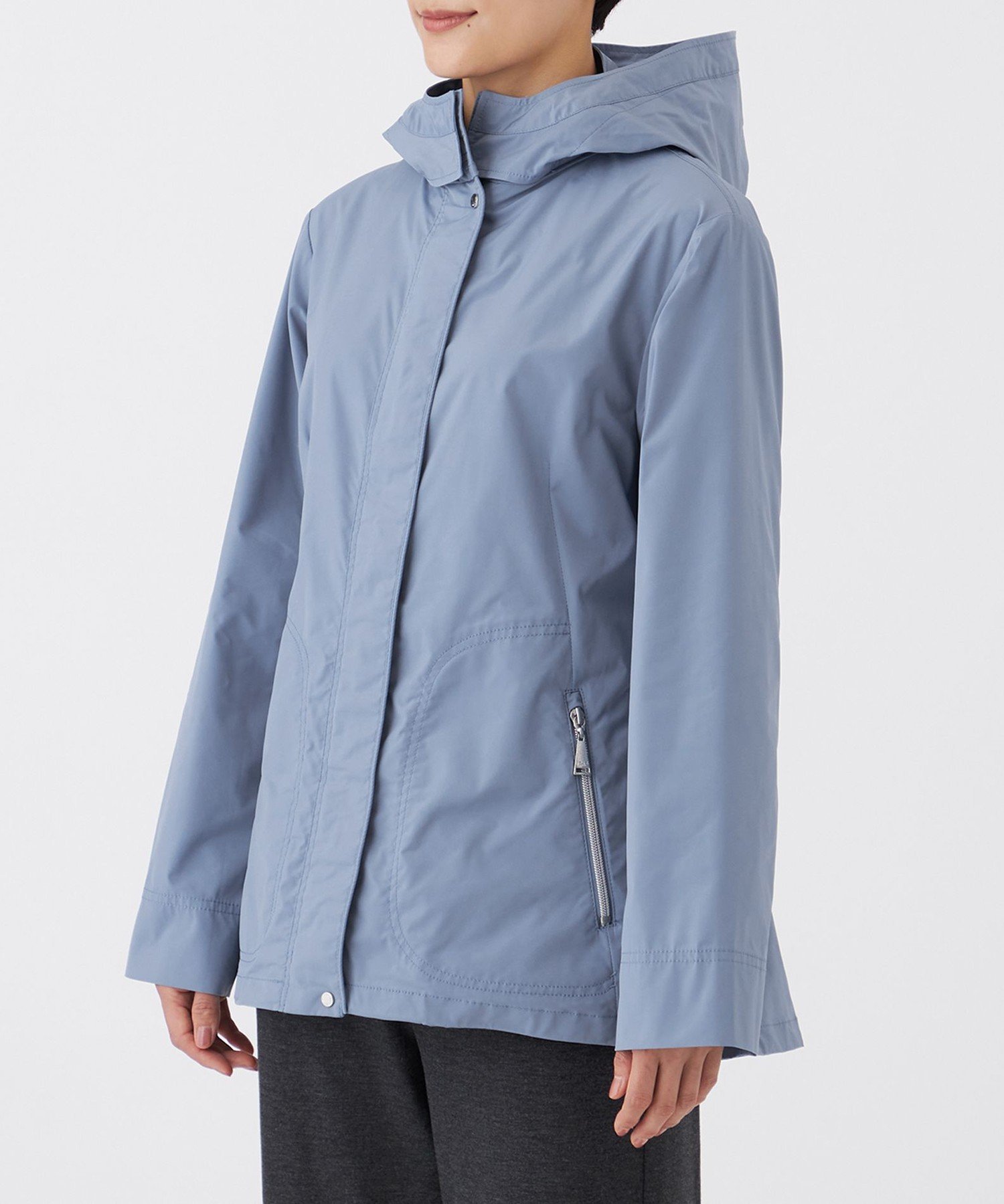Блузон с капюшоном и спортивными деталями. Капюшон можно снять и носить как воротник-стойку. Боковые разрезы, точечные пуговицы и карманы на молнии создают изысканный повседневный стиль. Силуэт умеренно свободный, но разница в длине спереди и сзади придает ему аккуратный вид.