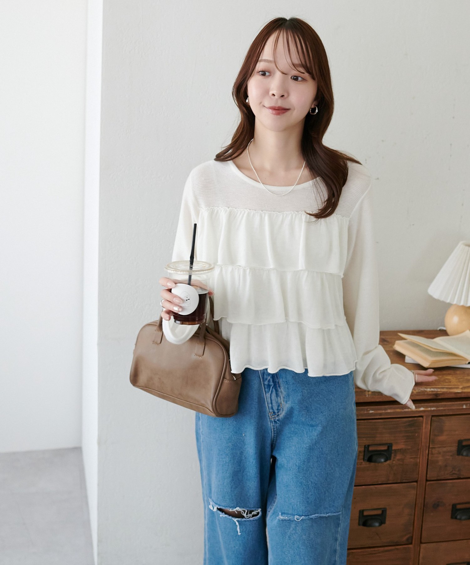 Сотрудник ростом 149 см: Длина достаточно большая, чтобы слегка прикрывать бедра, что позволяет легко сохранять равновесие даже людям невысокого роста. Оборки перекрывают друг друга, но горловина прозрачная, поэтому вы можете наслаждаться ощущением легкости♪