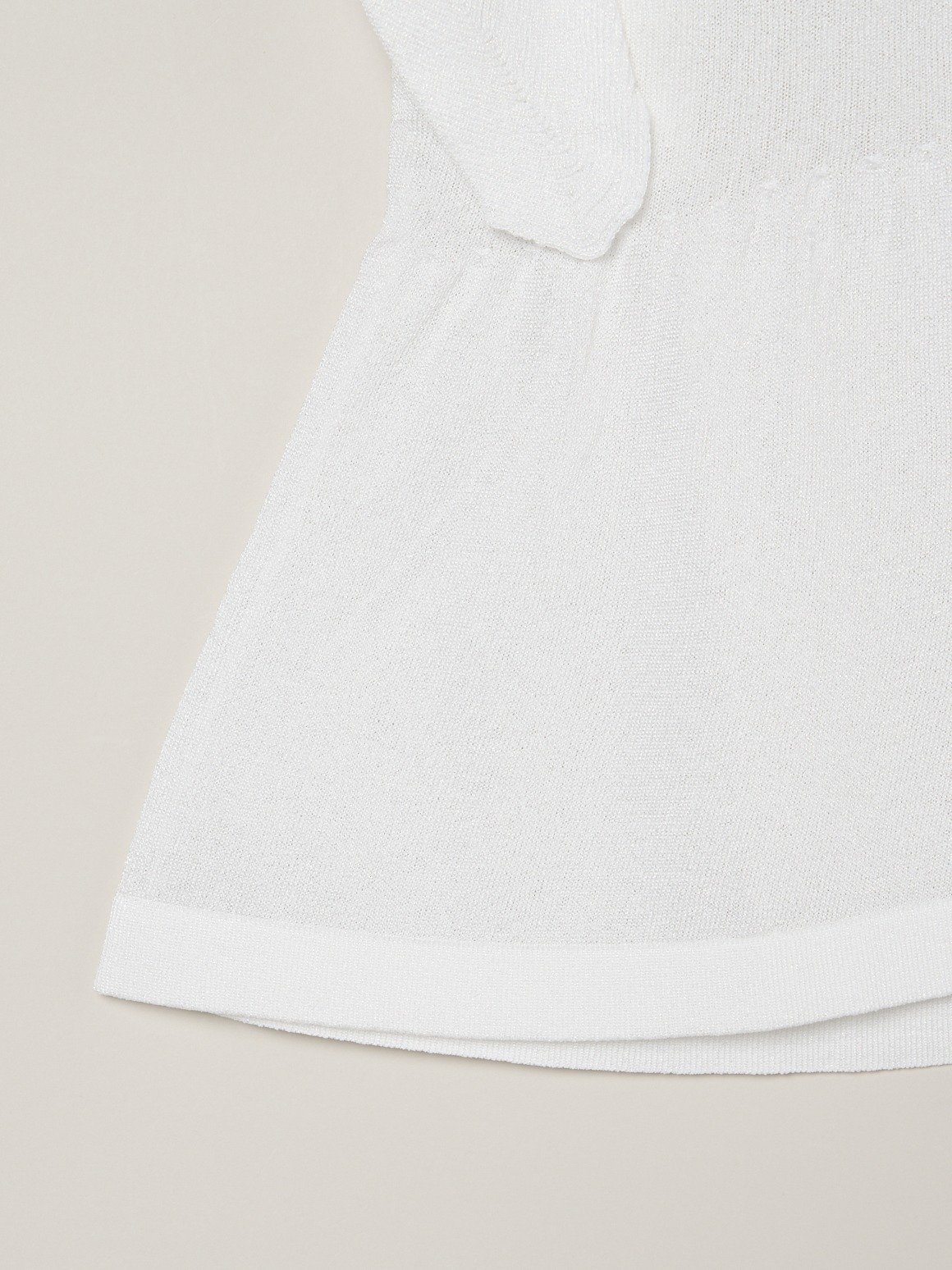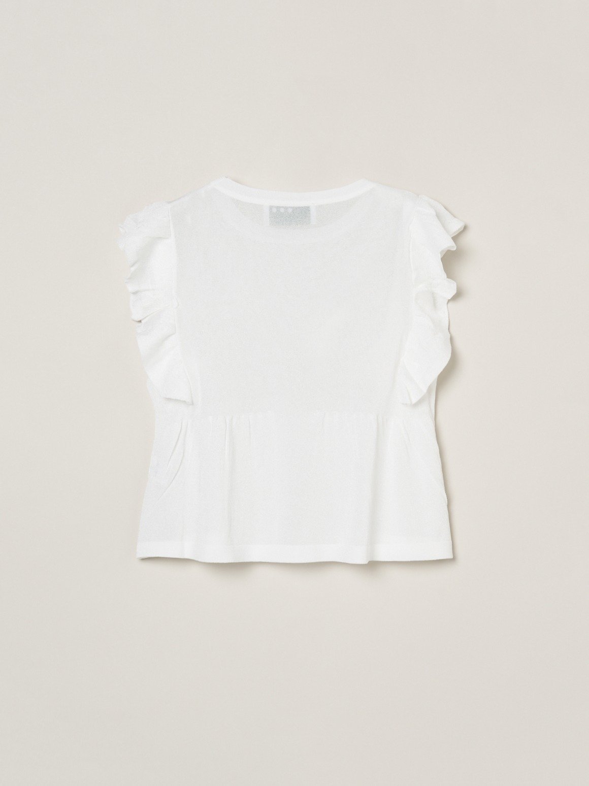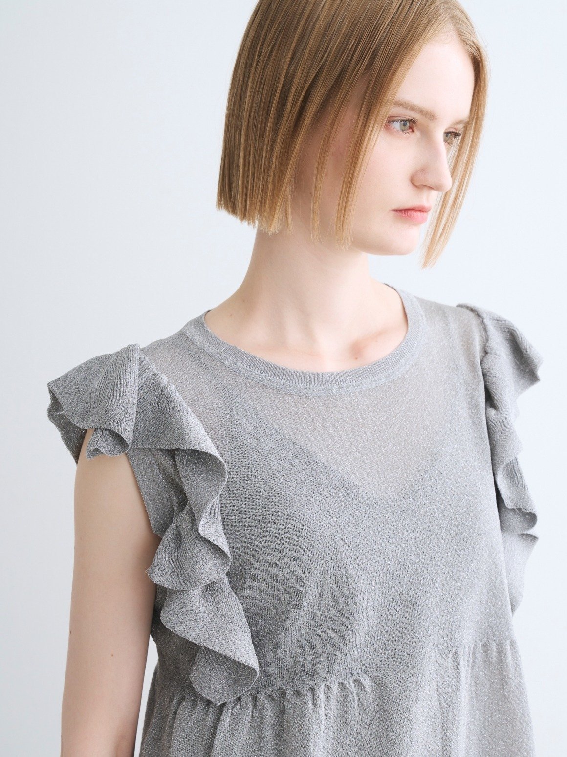 В этом году модный трикотаж из люрекса получил крой и пошив. Рукава с оборками, прикрывающие плечи, придают этому изделию гламурный, но в то же время нежный вид. Мы также рекомендуем сочетать его с джинсами для создания повседневного образа.
