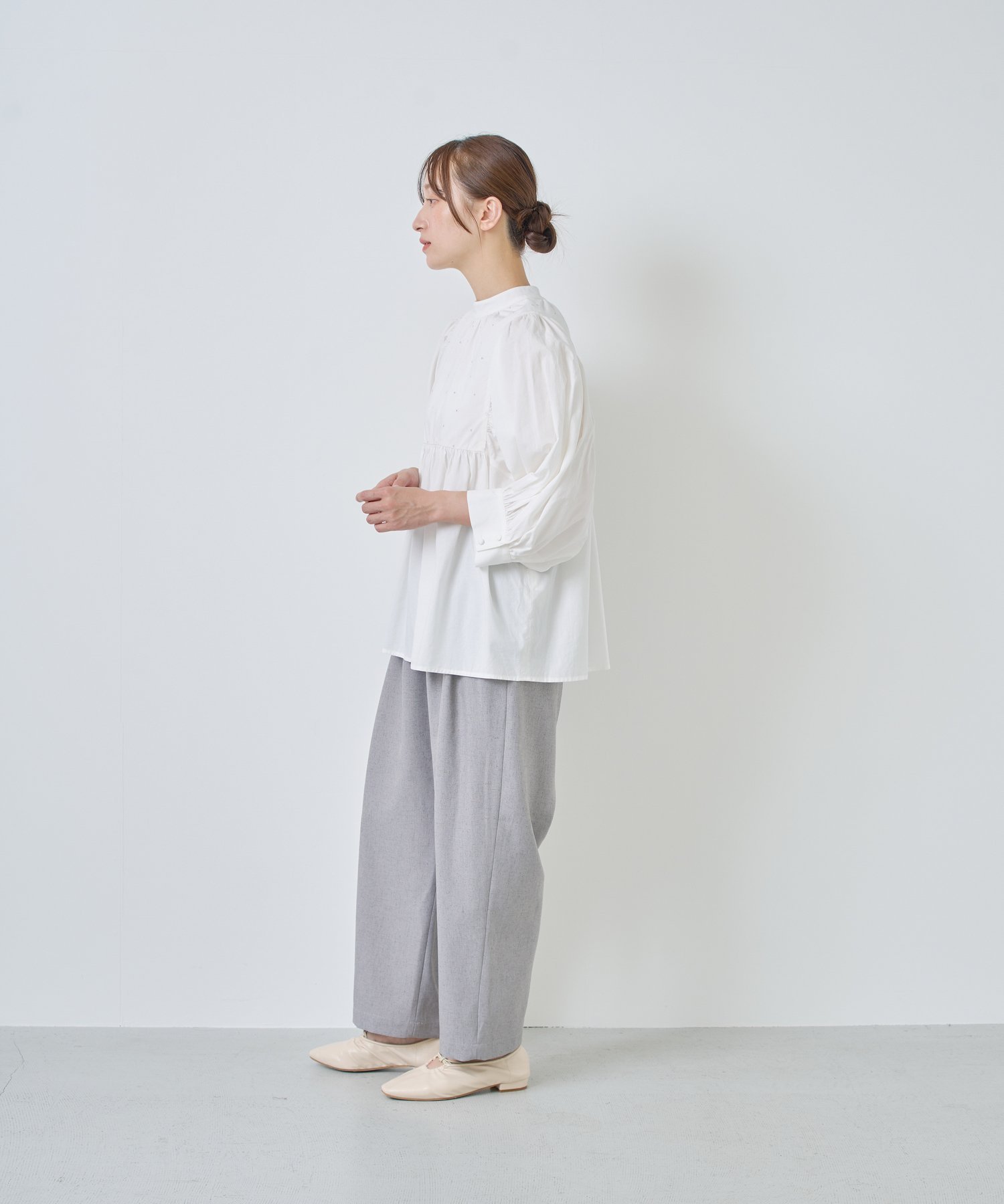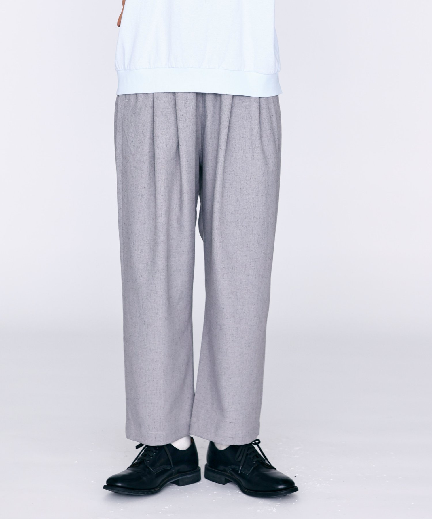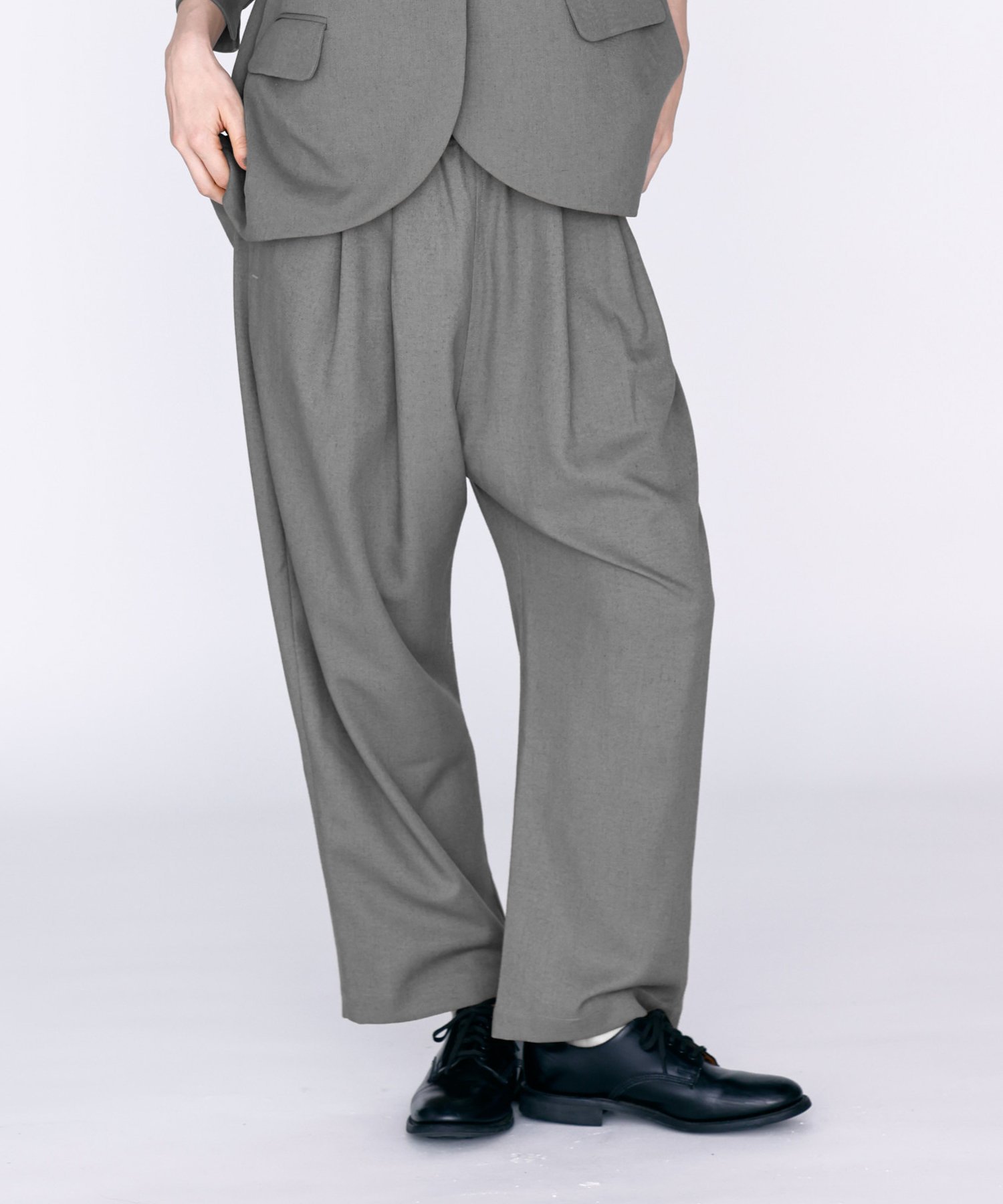 Большие складки и сборки на талии создают красивый силуэт брюк, ниспадающий к низу.