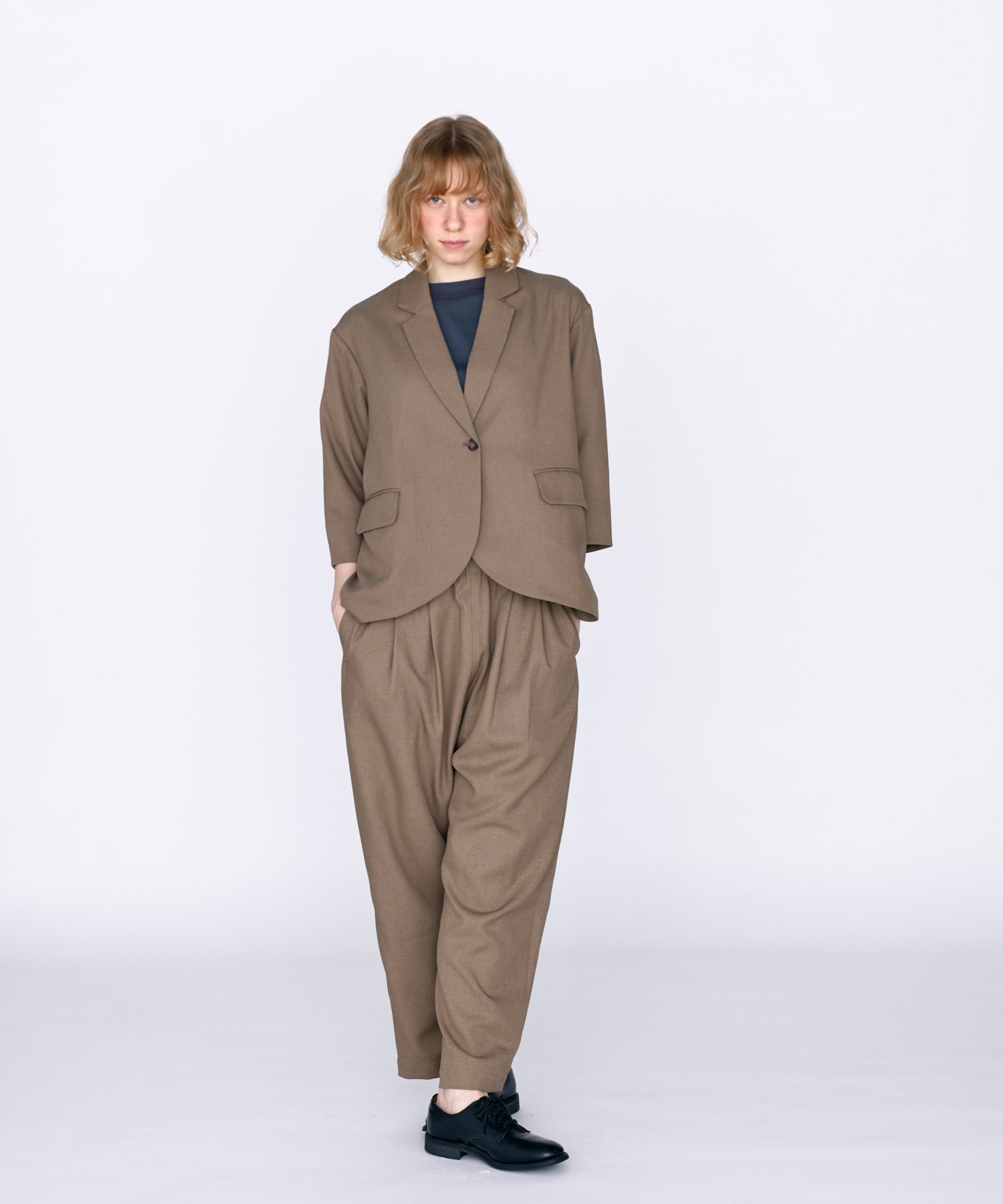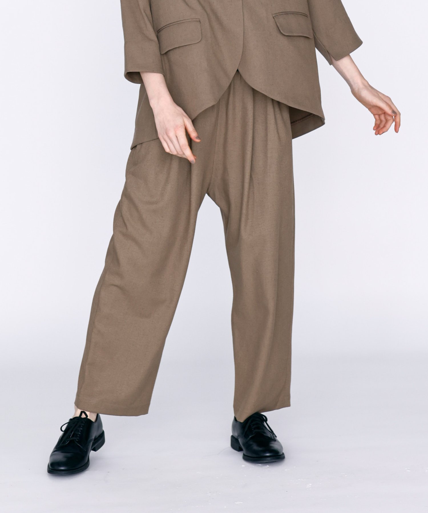 Большие складки и сборки на талии создают красивый силуэт брюк, ниспадающий к низу.