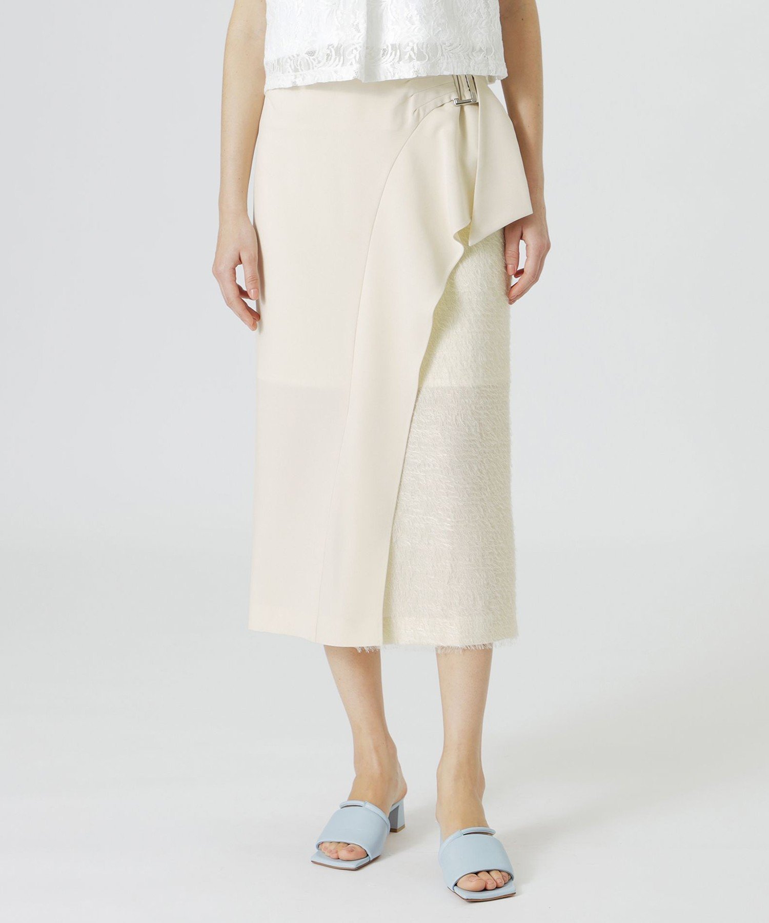 Трехмерный пояс, как у юбки-обертки, и оборки с левой стороны добавляют движения и нотку гламура.
