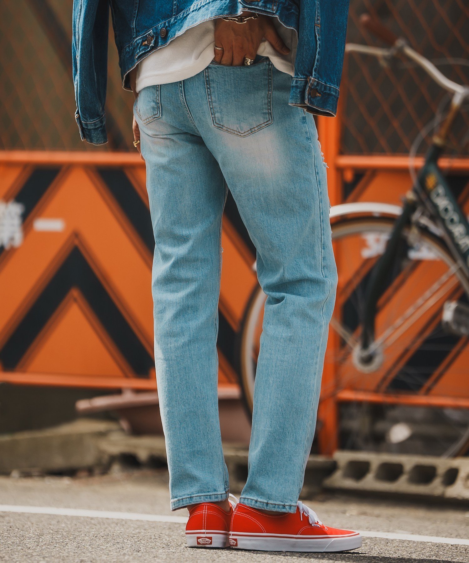 ●Простые джинсы с оптимальной степенью зауженности, но не слишком обтягивающие.